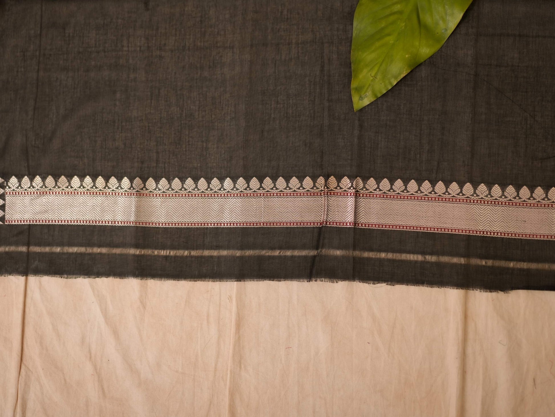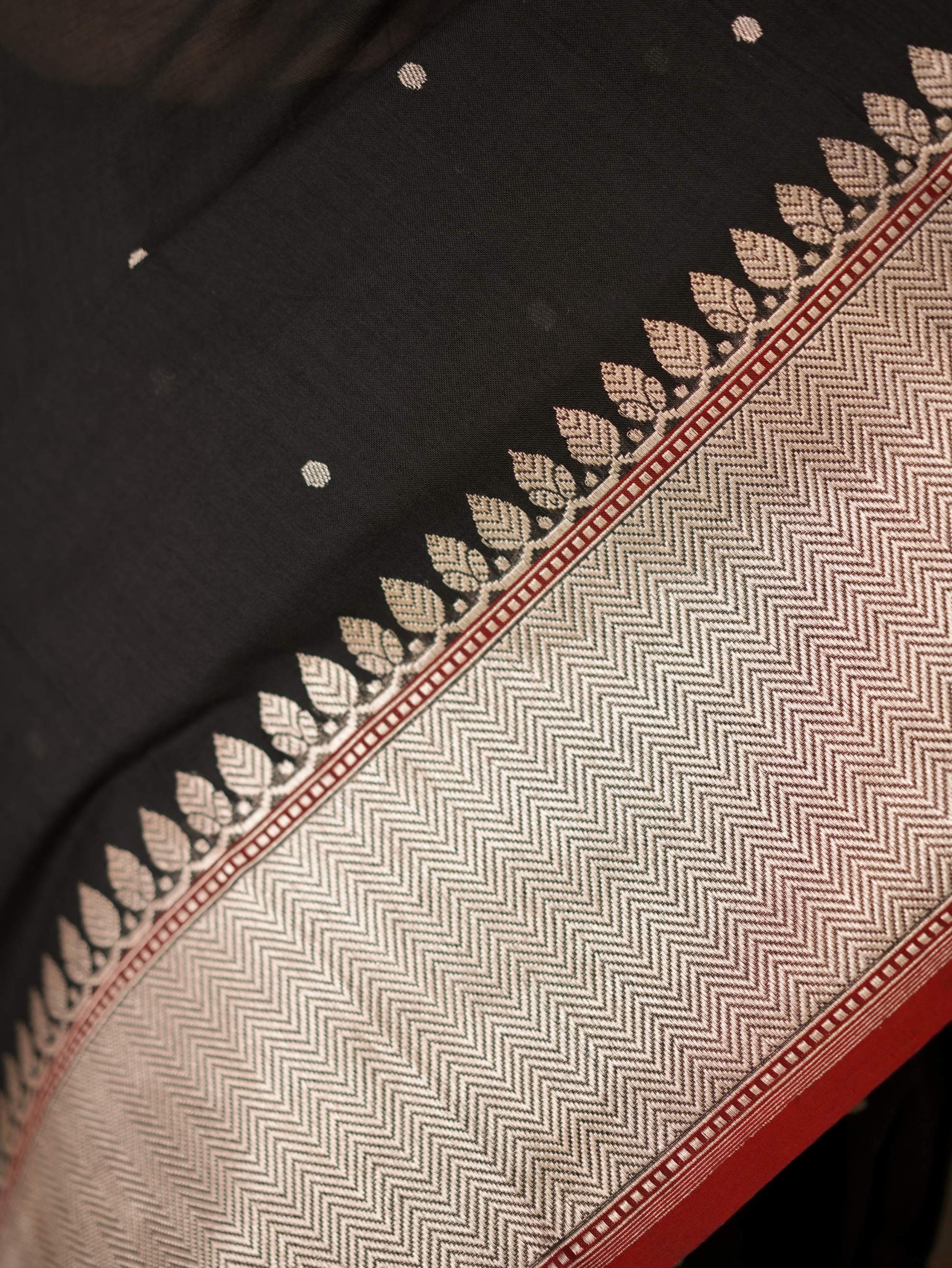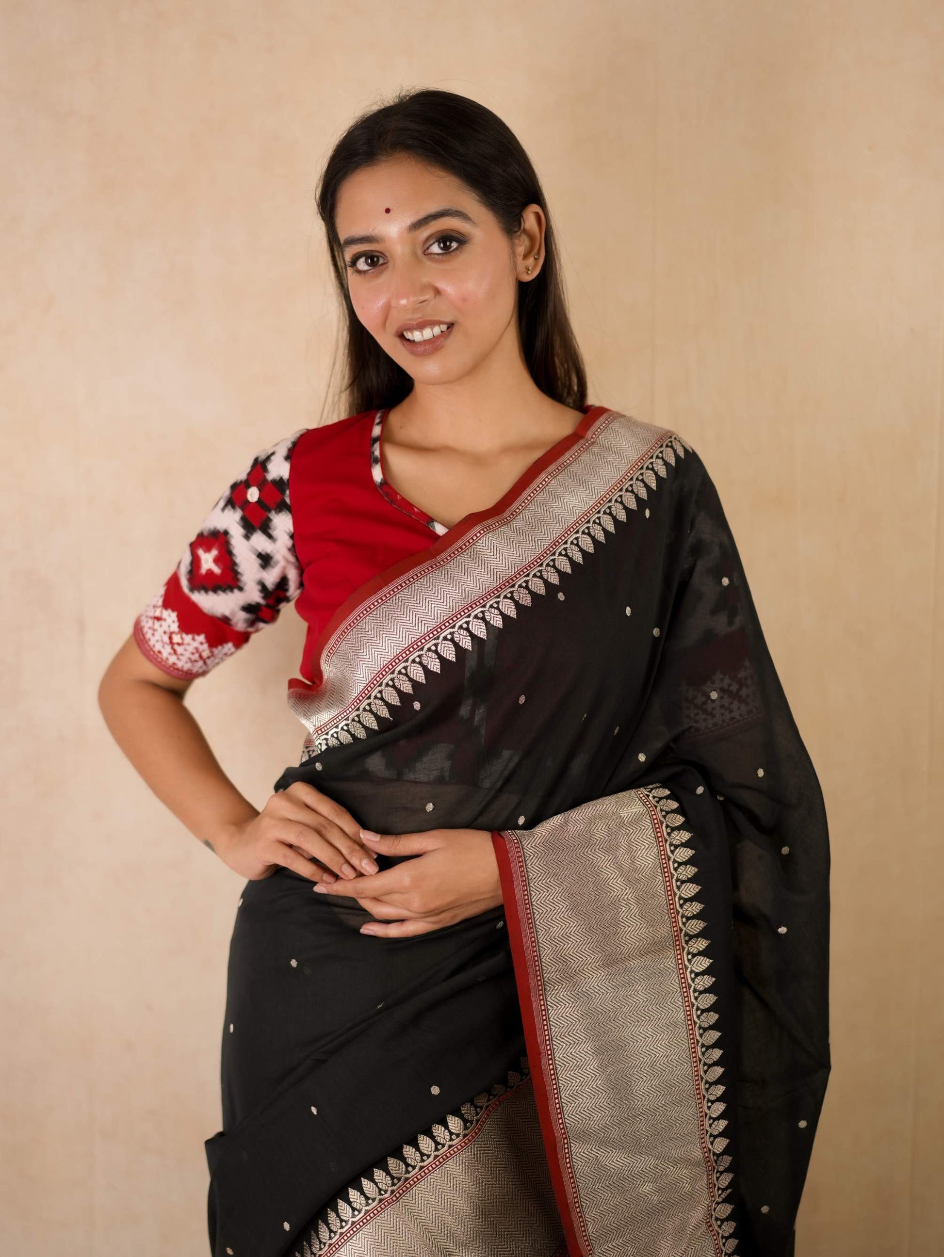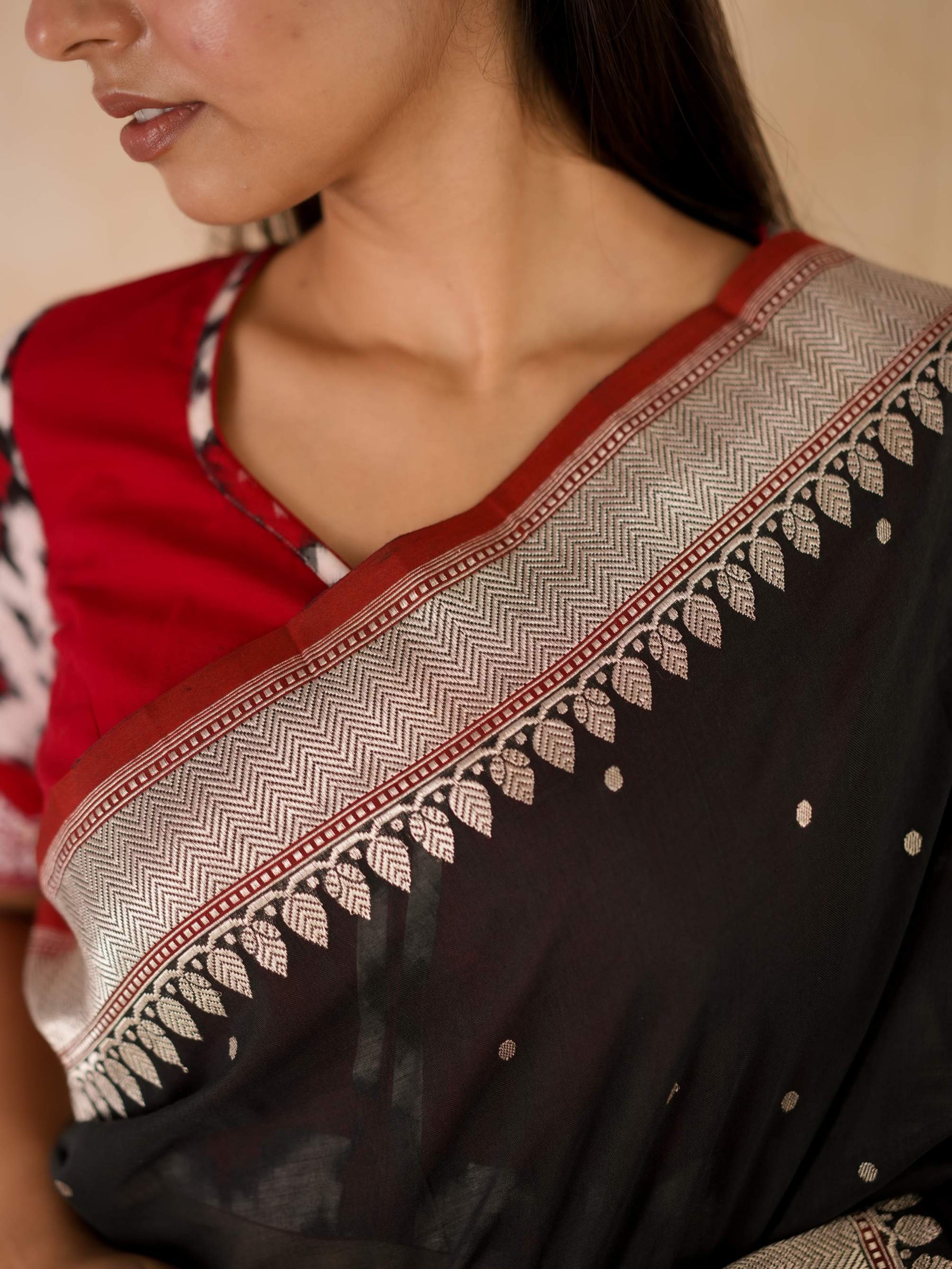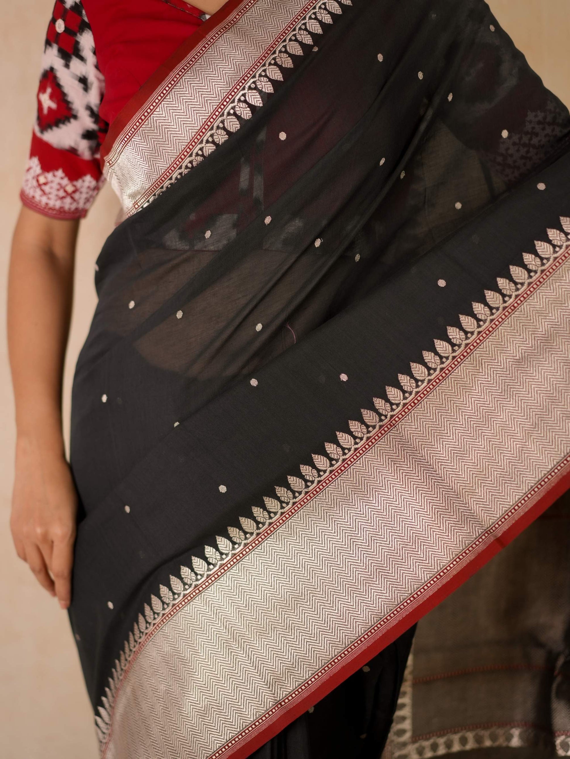 Discover the grace of black cotton Banarasi sarees, where elegance meets comfort. It is crafted with delicate silver zari work in the border and pallu. The red coloured selvedge gives a contrasting edge to the look the saree itself. The saree blended with the softness of cotton with the intricate craftsmanship of Banaras are perfect for both festive occasions and everyday elegance. Embrace timeless style with a touch of heritage in every drape.
