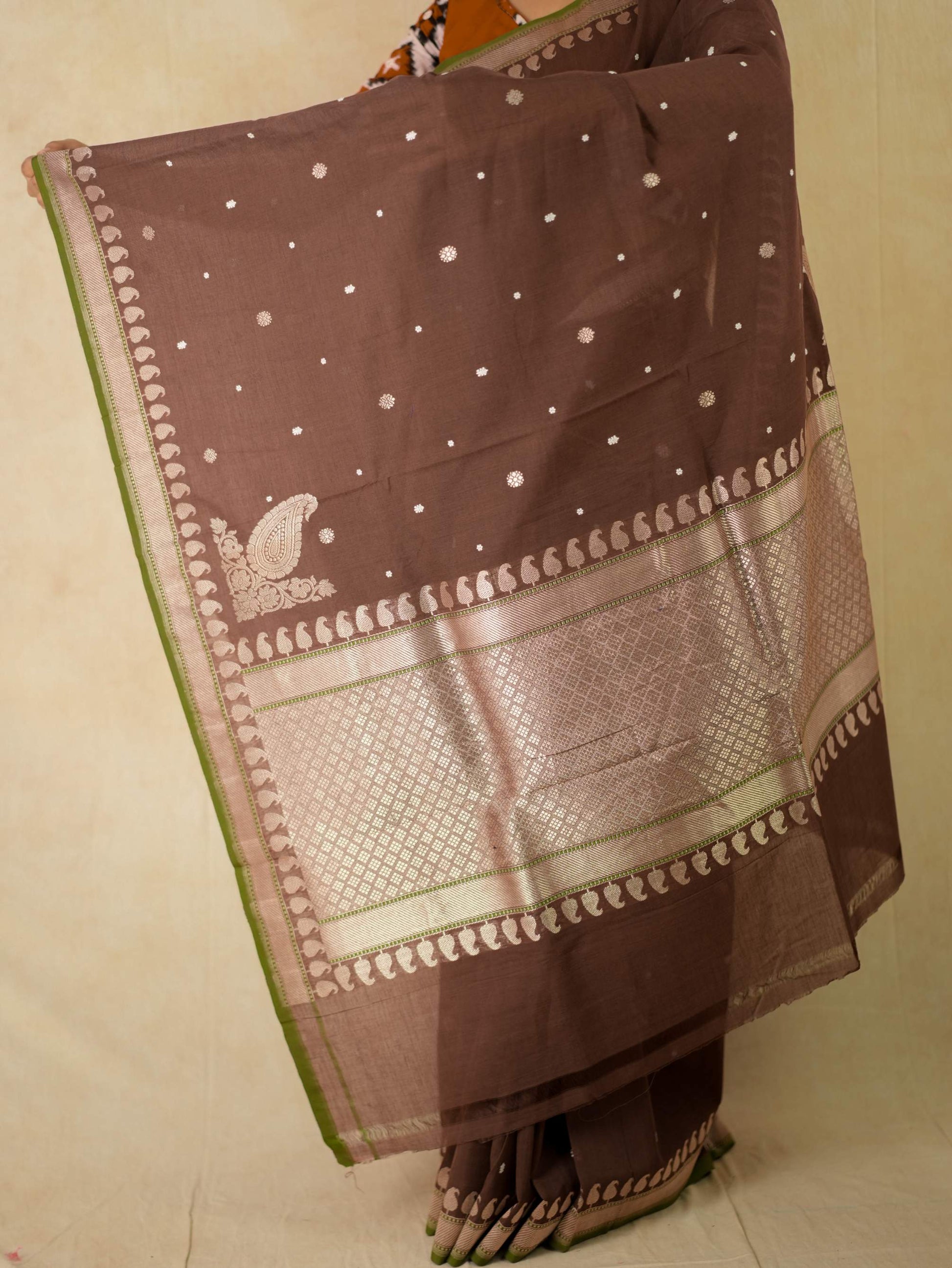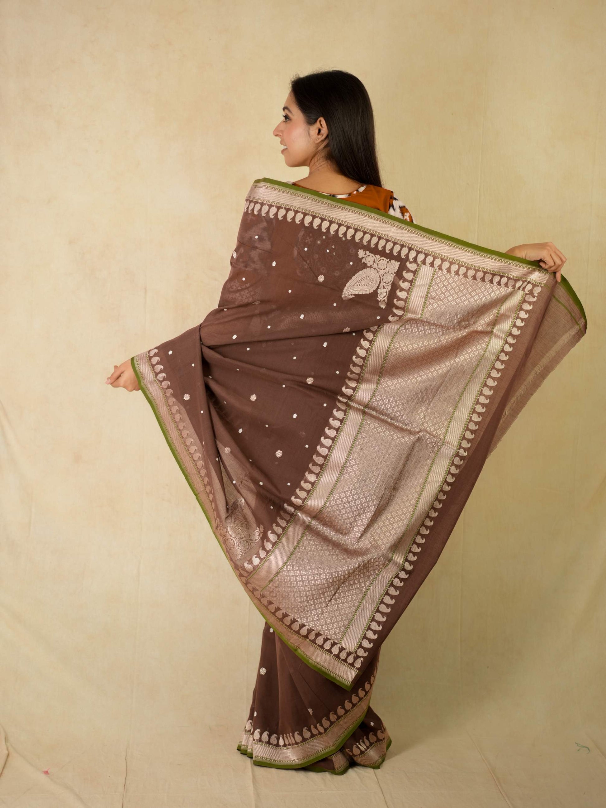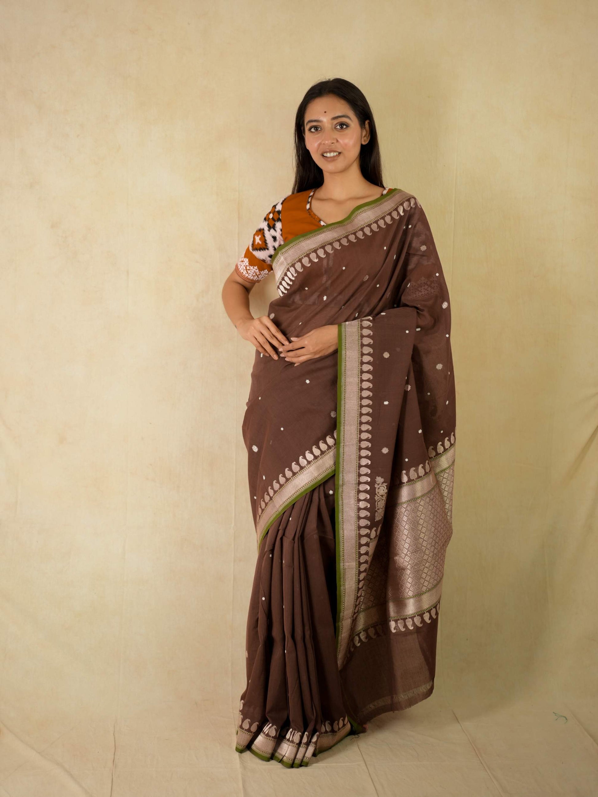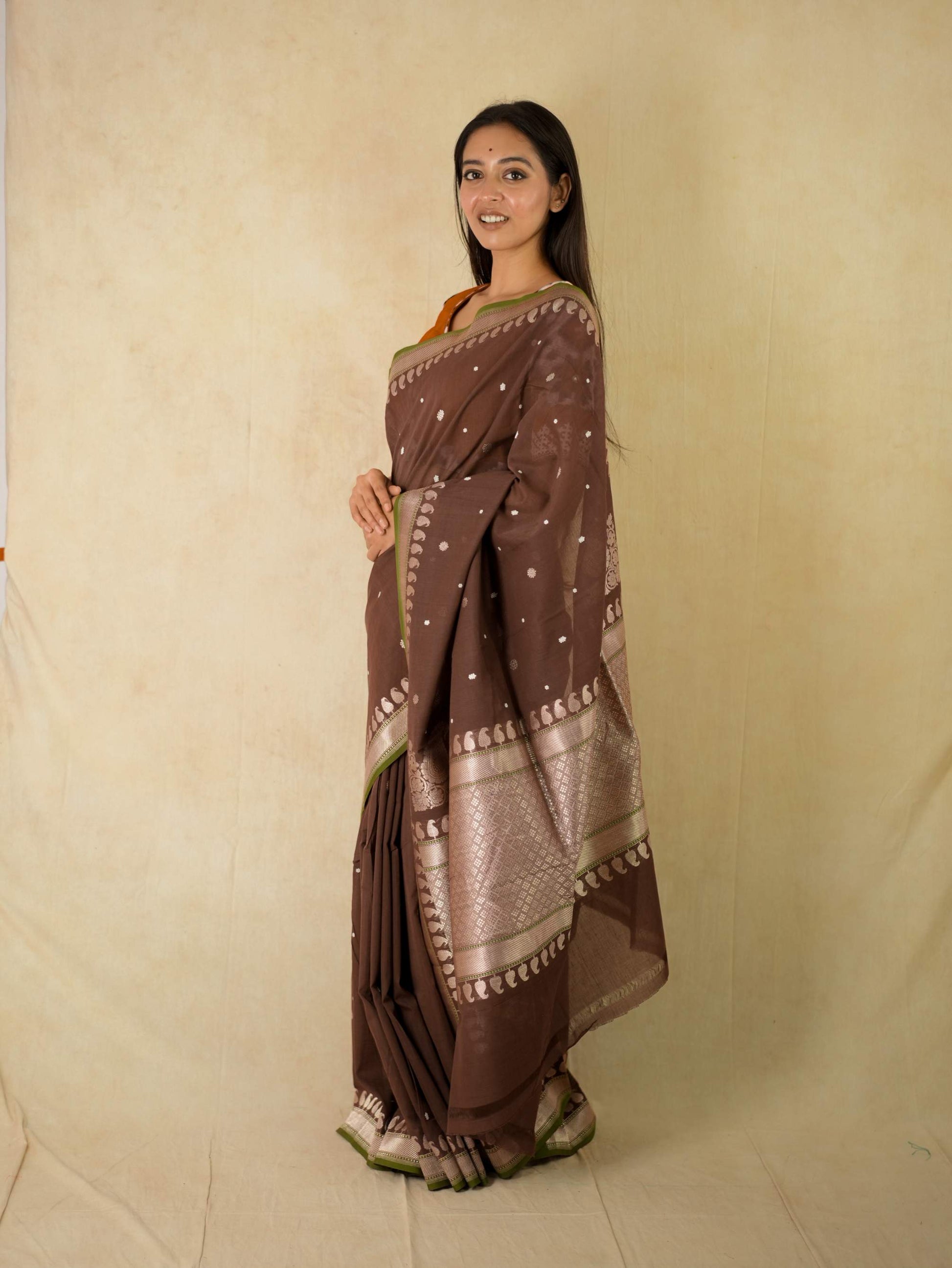 Discover the grace of dark brown cotton Banarasi sarees, where elegance meets comfort. The highlight of the saree is the intricate blend of thread and zari work buties all across and the delicate beige coloured zari work in the border and pallu. The green coloured selvedge gives a contrasting edge to the look the saree itself. The saree blended with the softness of cotton with the intricate craftsmanship of Banaras are perfect for both festive occasions and everyday elegance. Embrace timeless style with a touch of heritage in every drape.