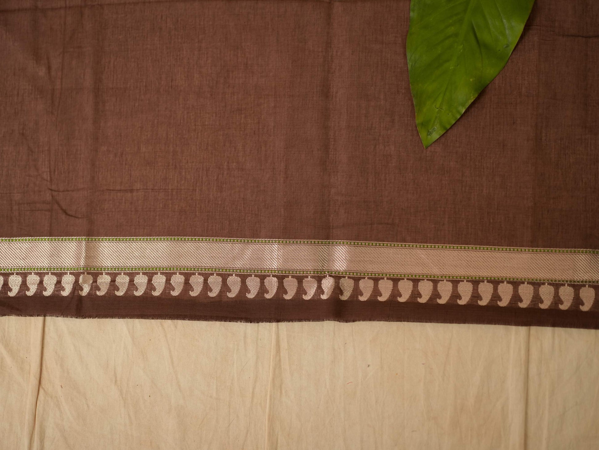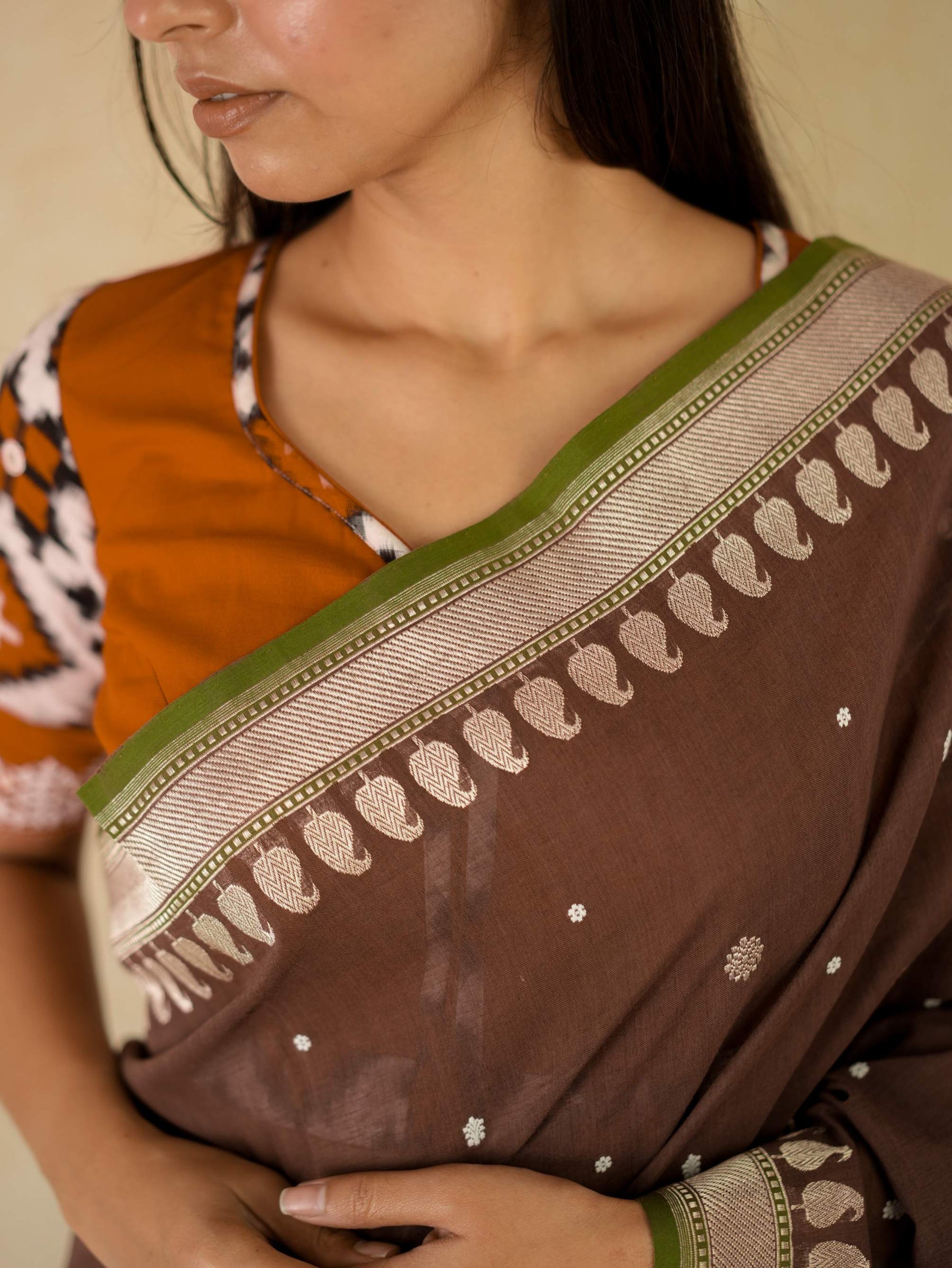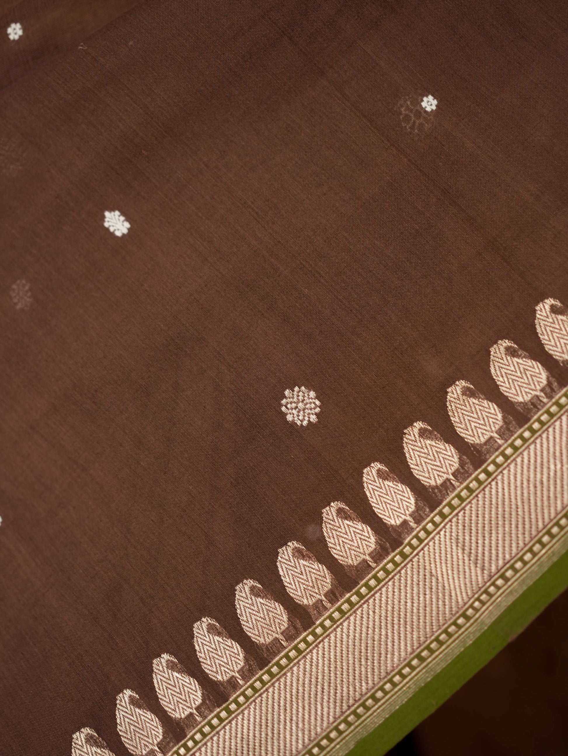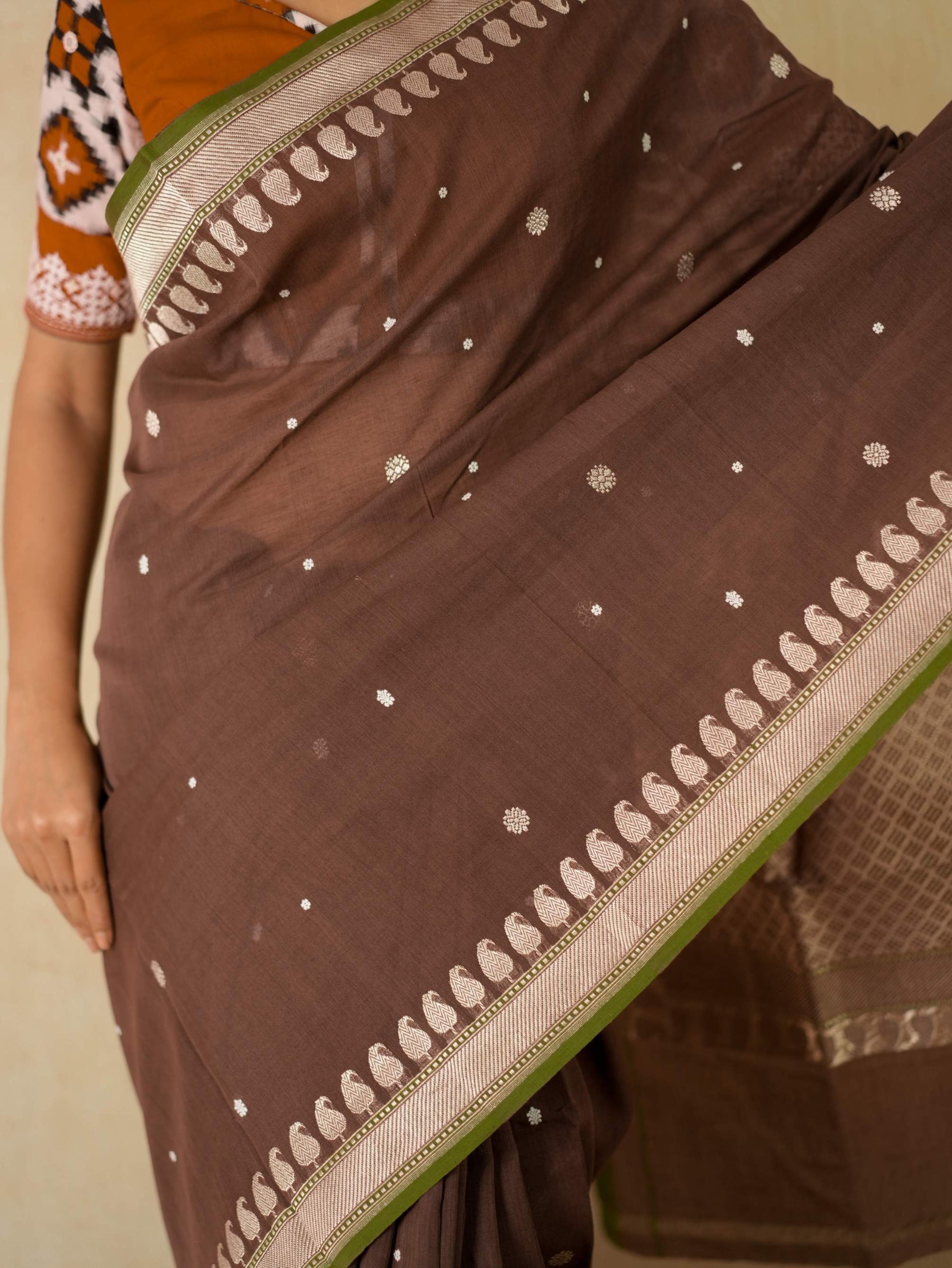 Discover the grace of dark brown cotton Banarasi sarees, where elegance meets comfort. The highlight of the saree is the intricate blend of thread and zari work buties all across and the delicate beige coloured zari work in the border and pallu. The green coloured selvedge gives a contrasting edge to the look the saree itself. The saree blended with the softness of cotton with the intricate craftsmanship of Banaras are perfect for both festive occasions and everyday elegance. Embrace timeless style with a touch of heritage in every drape.