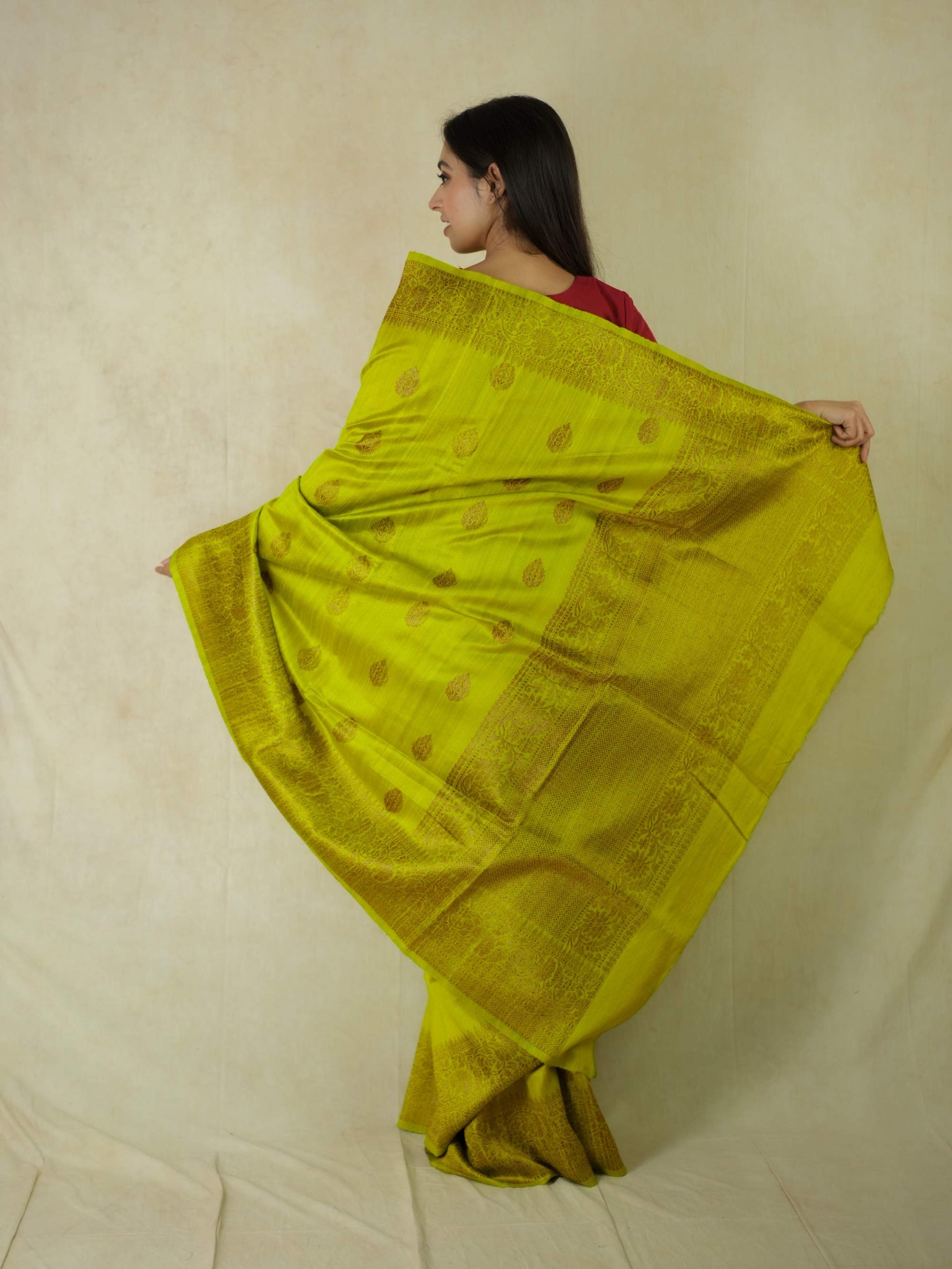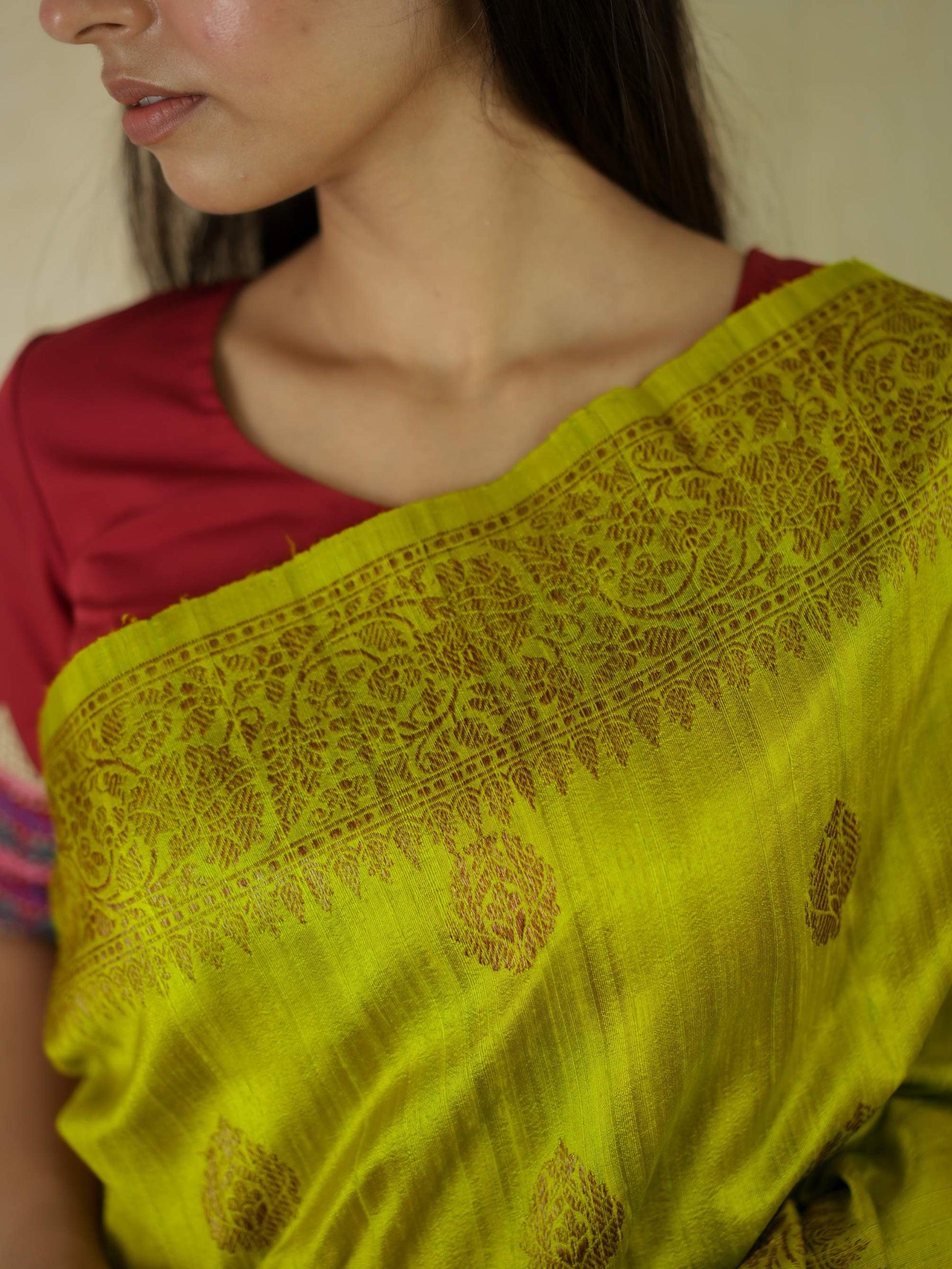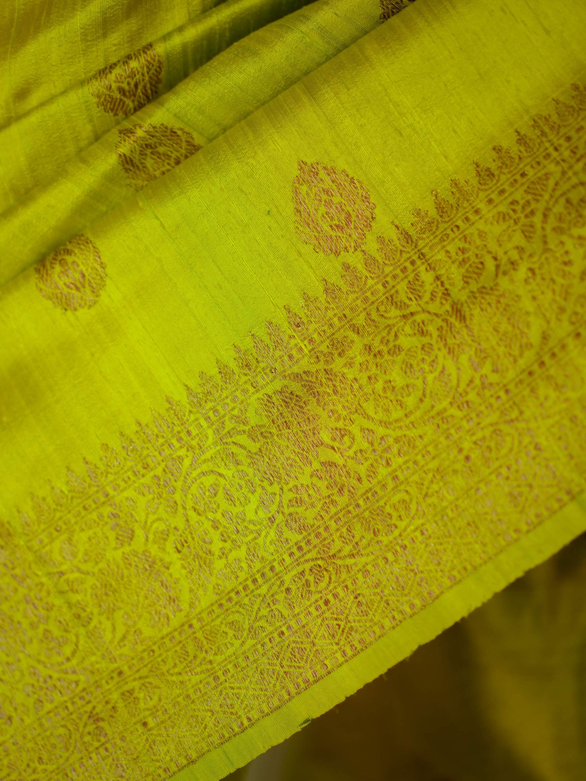 Delve into the sophistication of yellow Dupion Silk Banarasi sarees.The highlight of the saree is the luxurious texture with floral motifs in intricate zari work. The delicate zari work in copper colour on the border give a uniqueness to the appearance of the saree.Perfect for weddings and grand occasions, these sarees exude timeless elegance and rich heritage. Drape yourself in opulence and make every moment unforgettable.