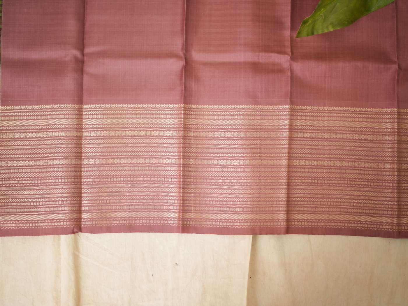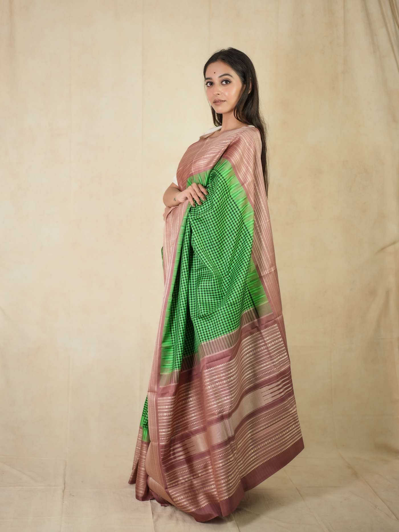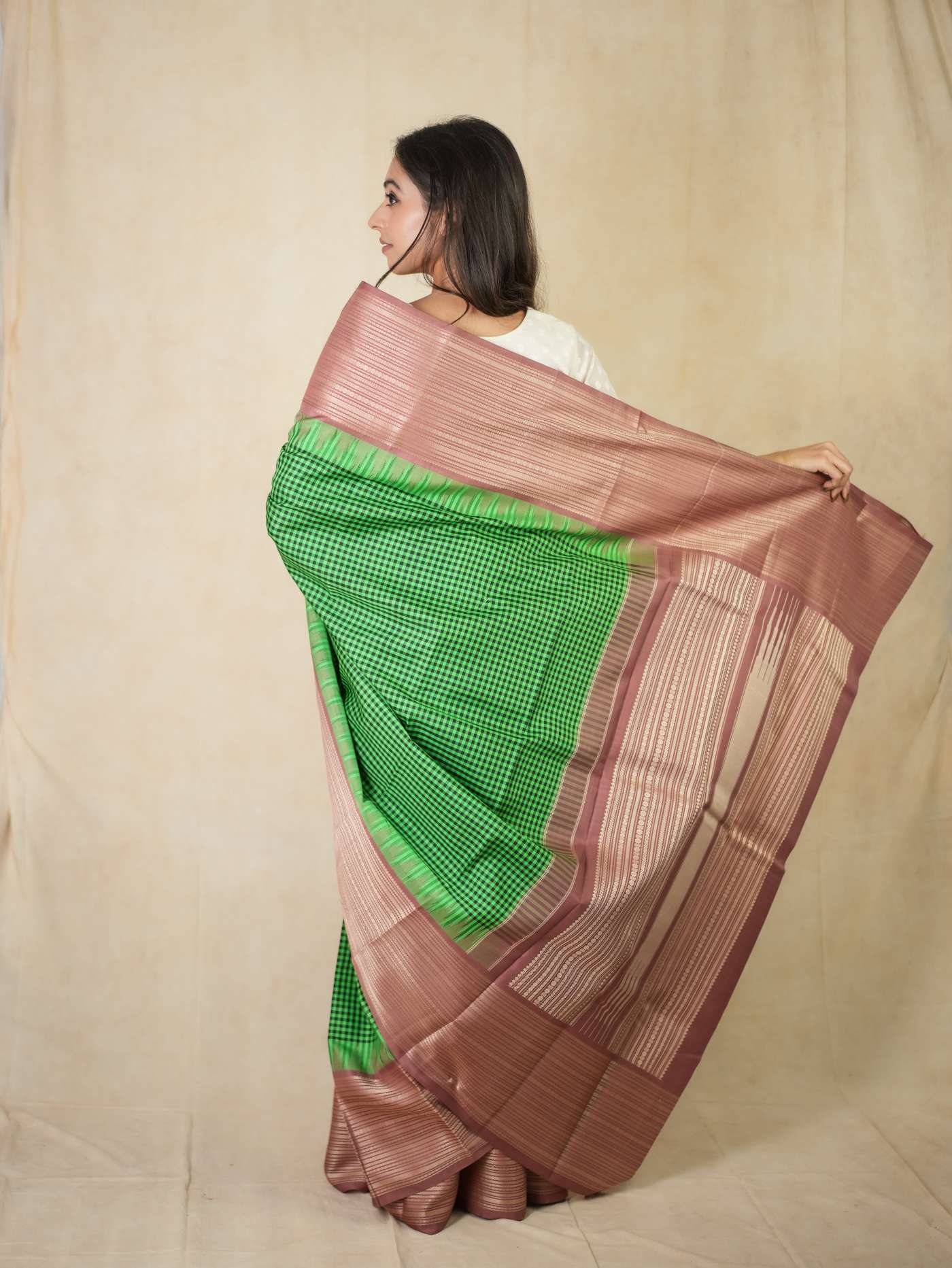 Indulge in the luxurious beauty of our green and mouve dual tone Kanjeevaram silk saree, featuring a classic green checked body paired with a graceful mouve silk border. The border and pallu are enhanced with elegant cream thread work in traditional geometric and linear motifs. Crafted without zari, the detailed thread artistry stands out, creating a refined, timeless, and effortlessly elegant look.