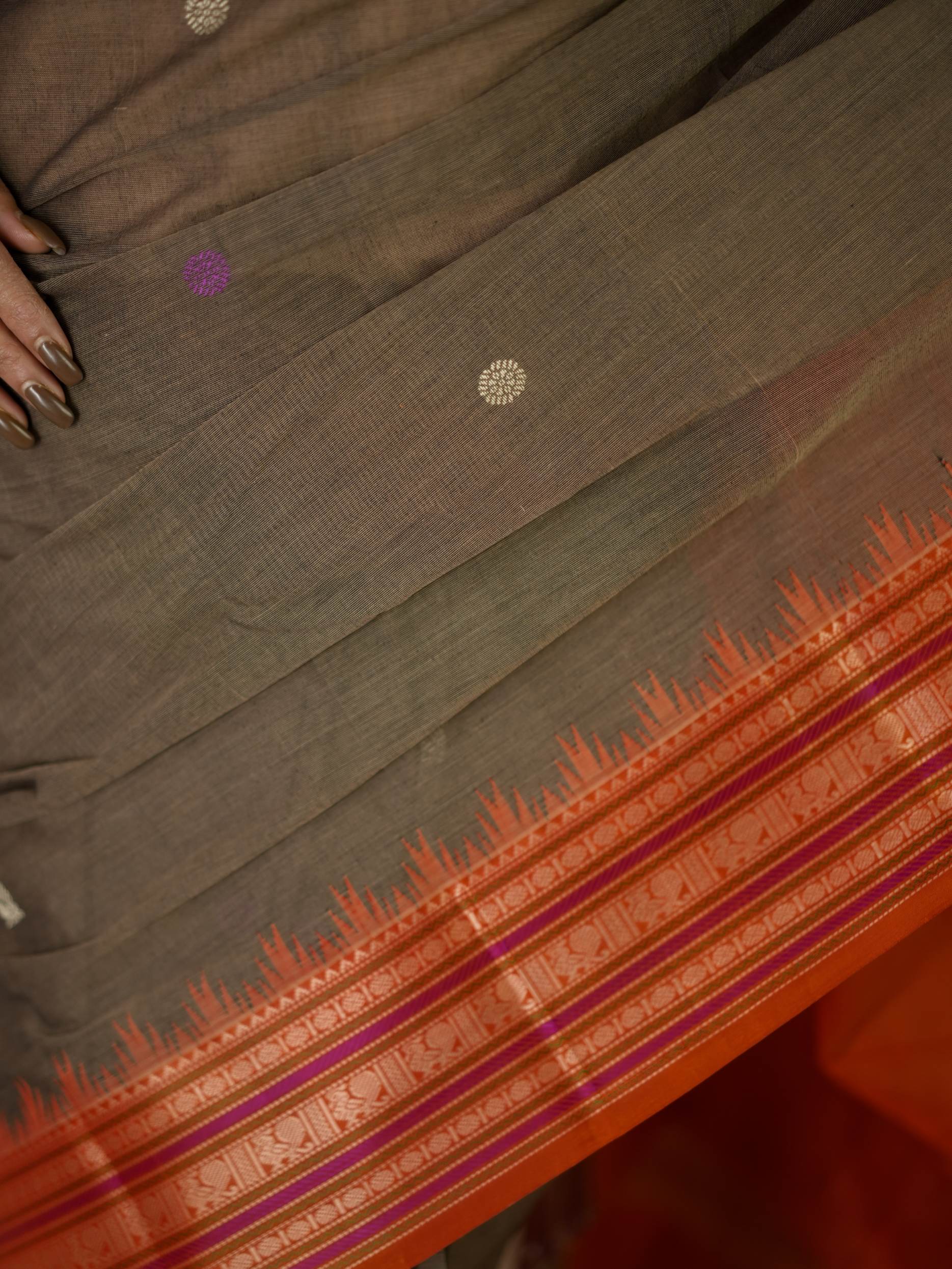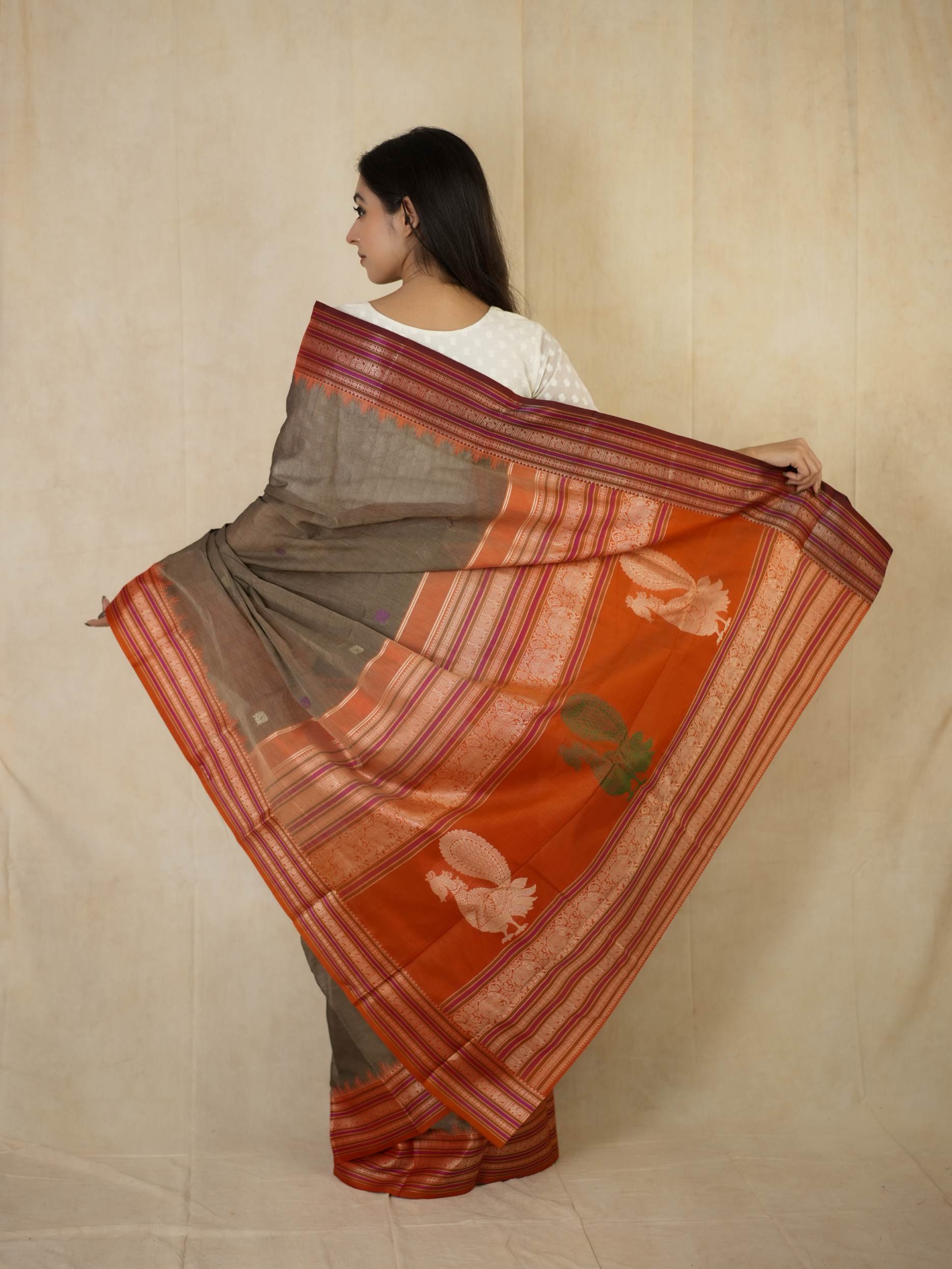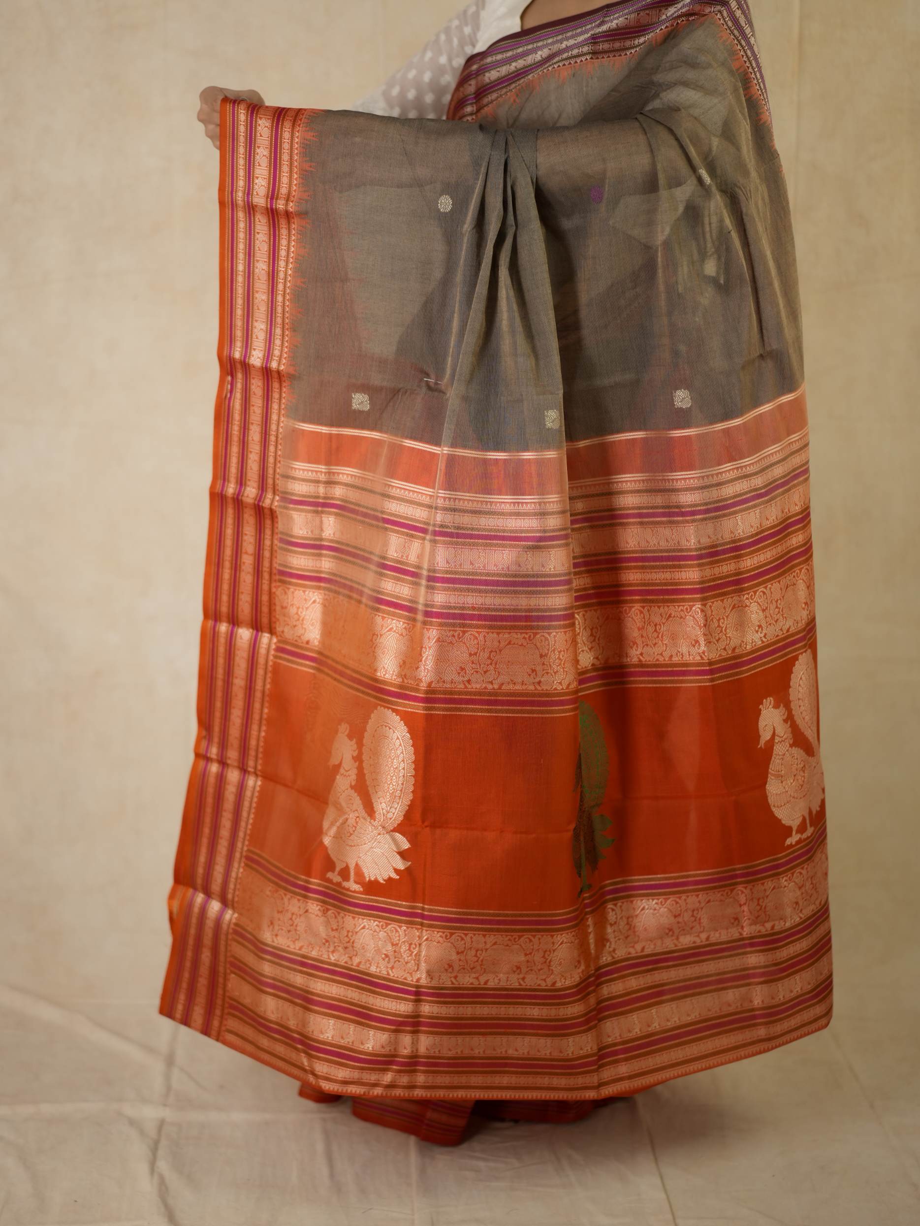 Introducing our elegant Kanchi sico saree featuring a subtle grey cotton body highlighted with delicate silver and purple butta motifs. It is framed by a rich rust-orange silk border with intricate silver thread work. The pallu showcases rust-orange panels adorned with traditional peacock motifs, creating a graceful and striking contrast.