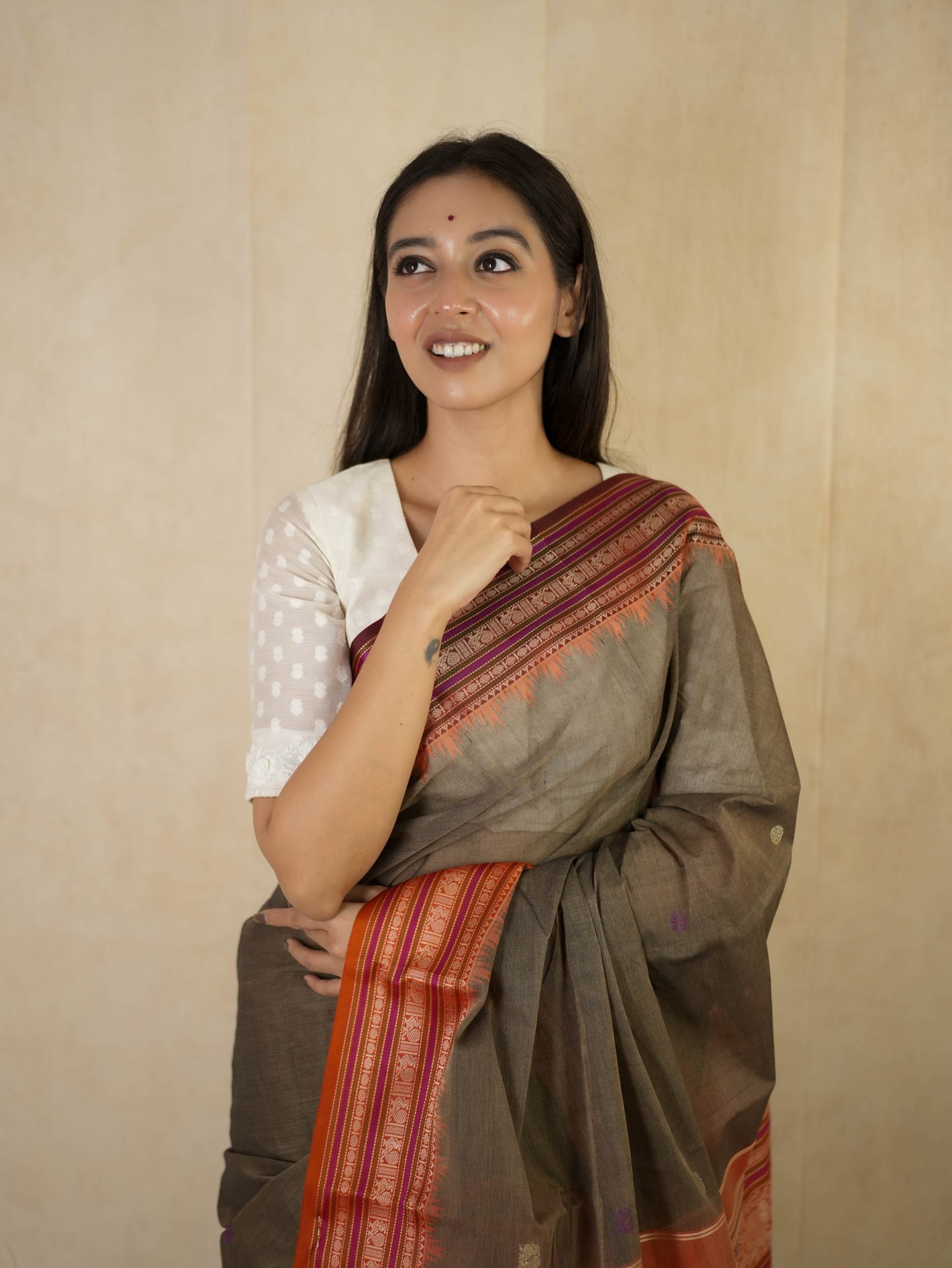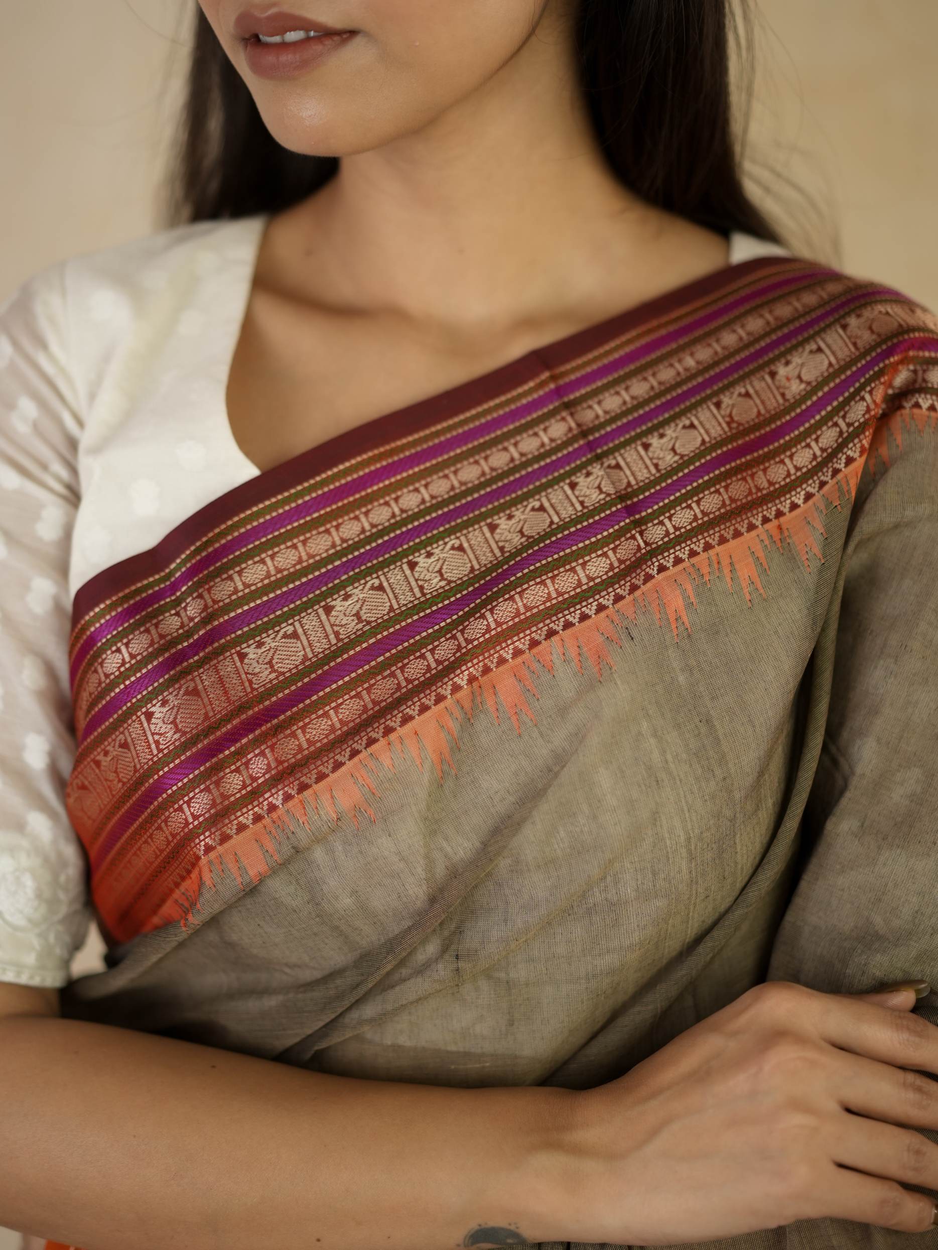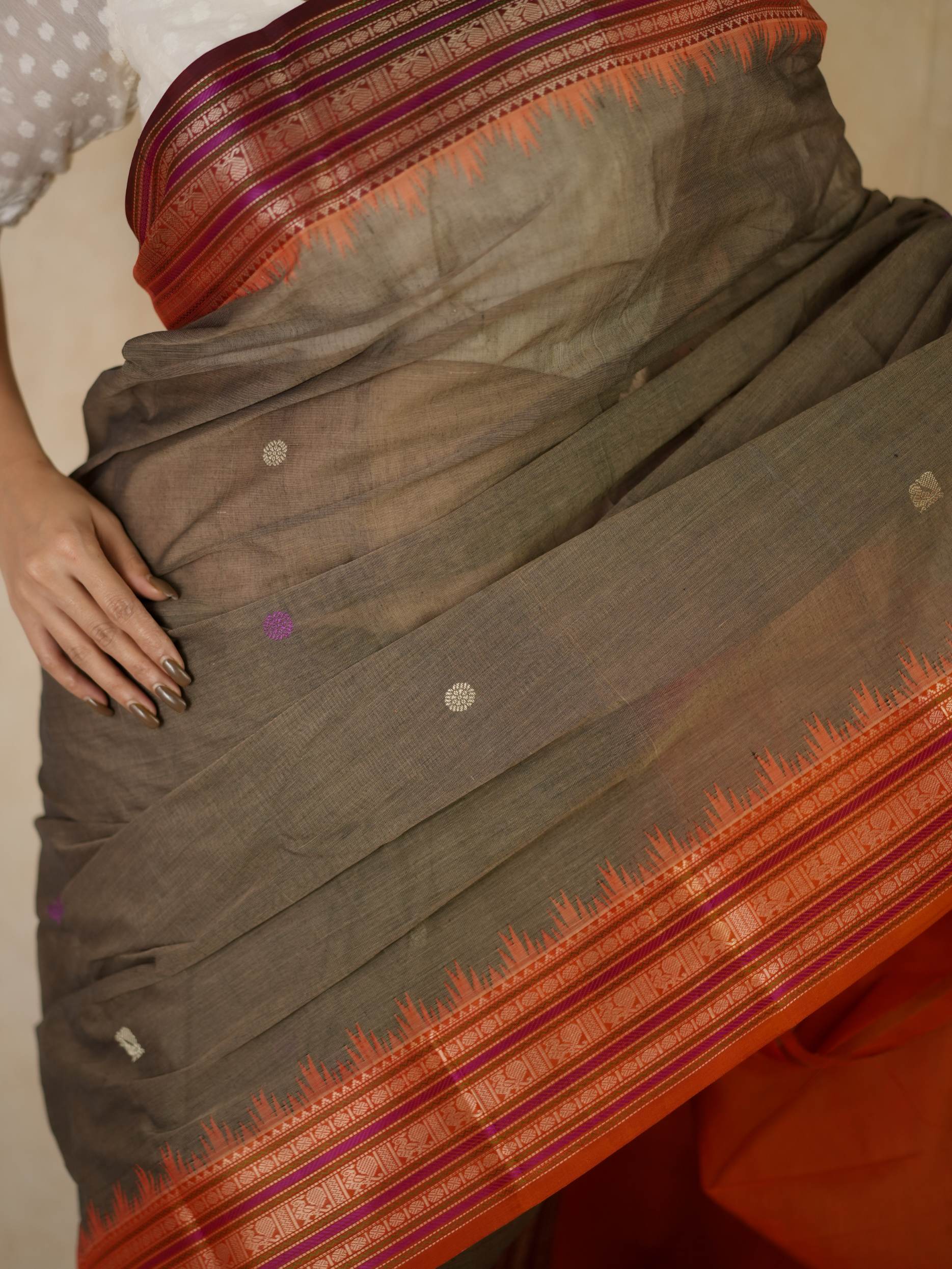 Introducing our elegant Kanchi sico saree featuring a subtle grey cotton body highlighted with delicate silver and purple butta motifs. It is framed by a rich rust-orange silk border with intricate silver thread work. The pallu showcases rust-orange panels adorned with traditional peacock motifs, creating a graceful and striking contrast.