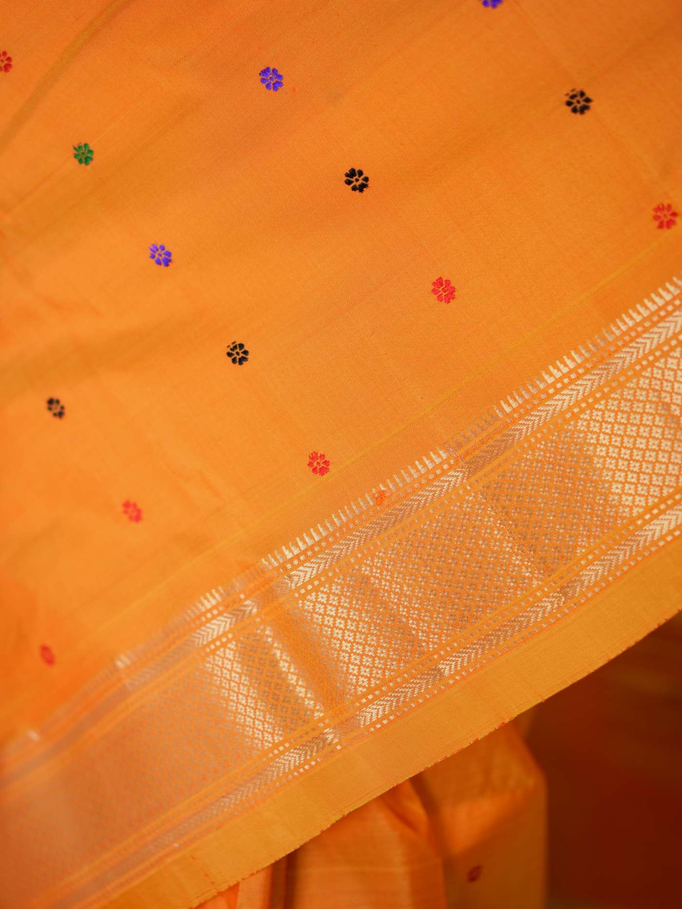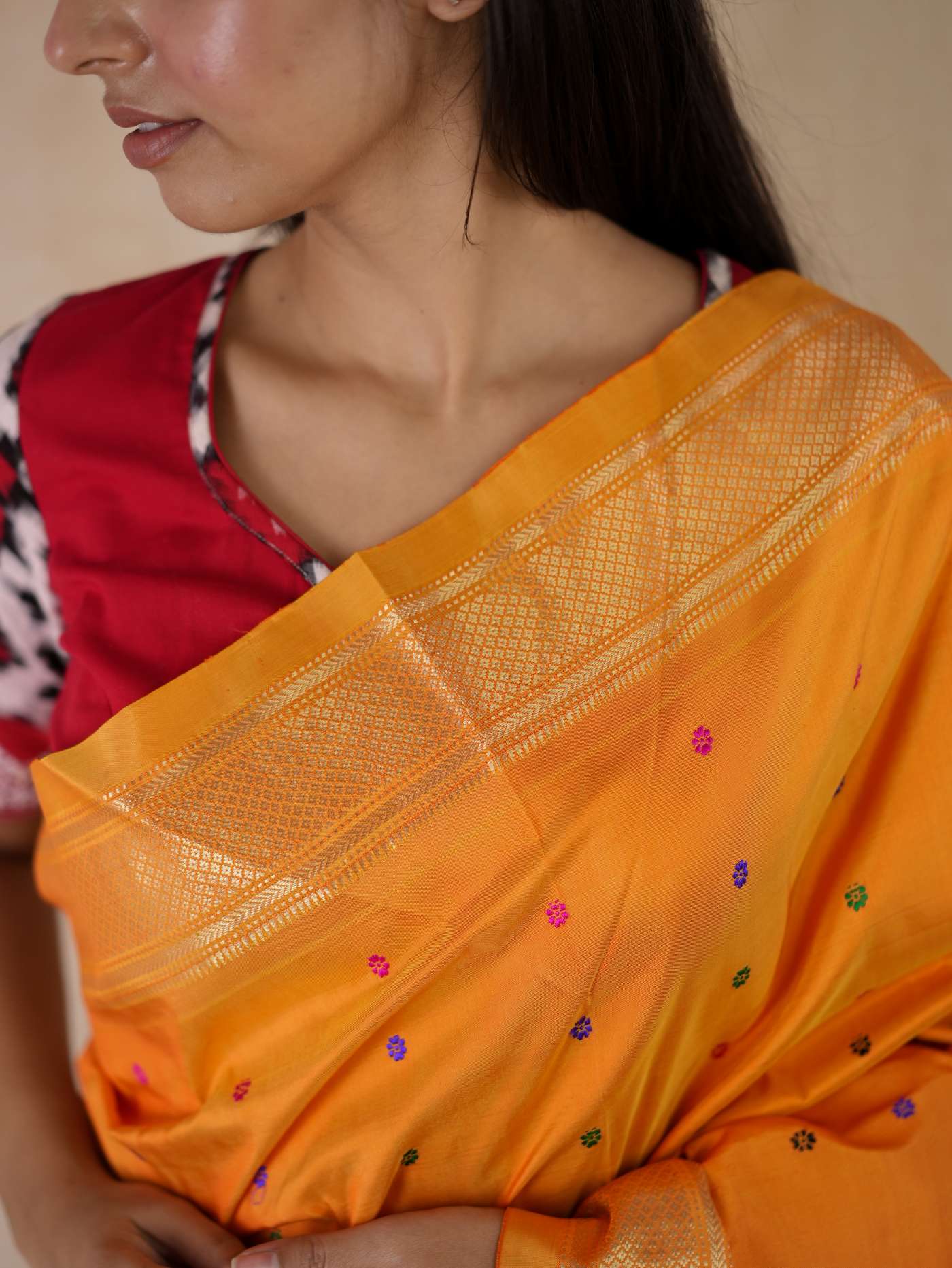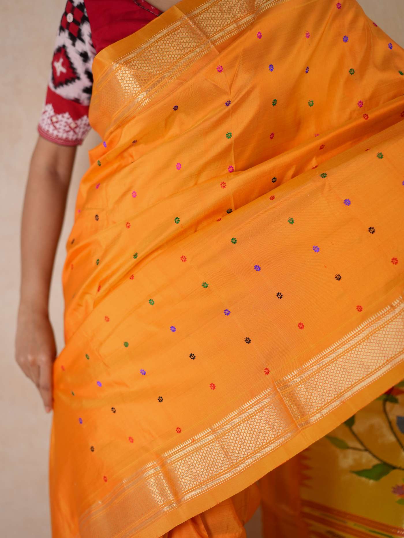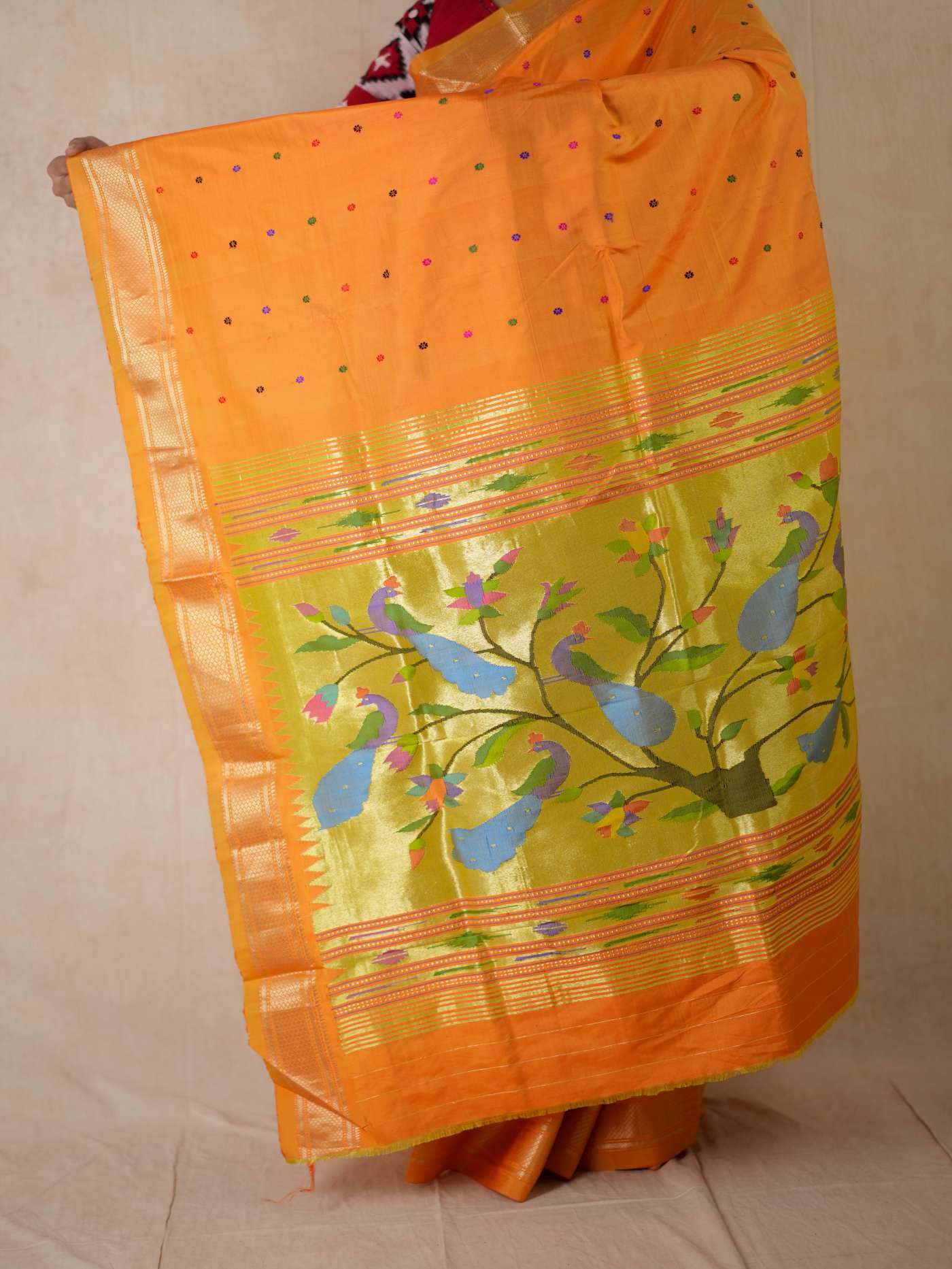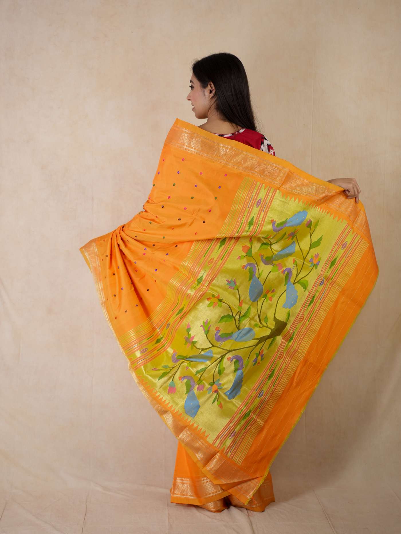 A timeless ode to Maratha heritage, this Paithani cotton saree in the shade of orangish yellow is a masterpiece of centuries-old craftsmanship, adorned with lustrous weaves and intricate motifs inspired by nature and royalty. Originating from the royal dynasties of the Satavahana era, each drape carries the grandeur of tradition, the richness of colour, and an elegance passed down through generations.