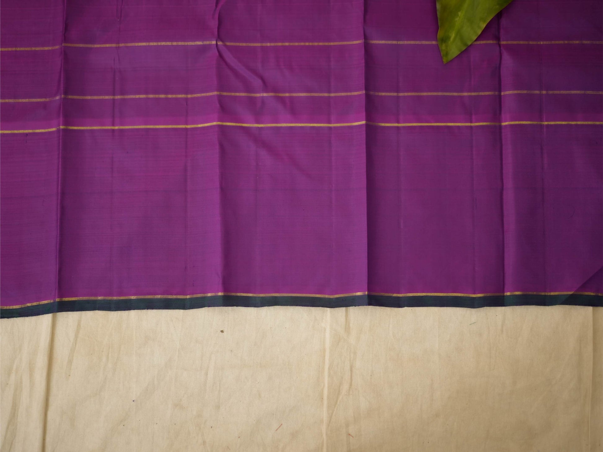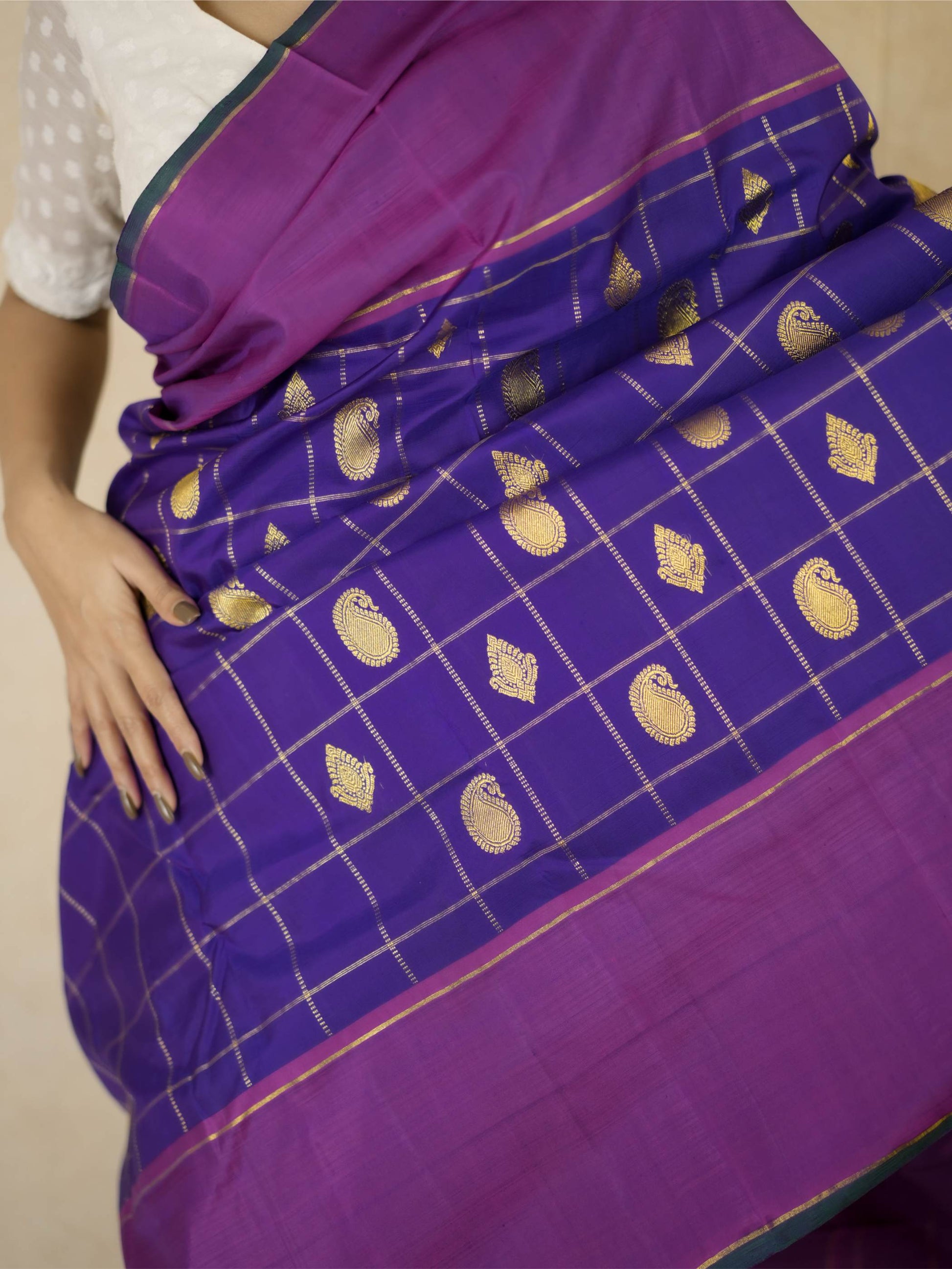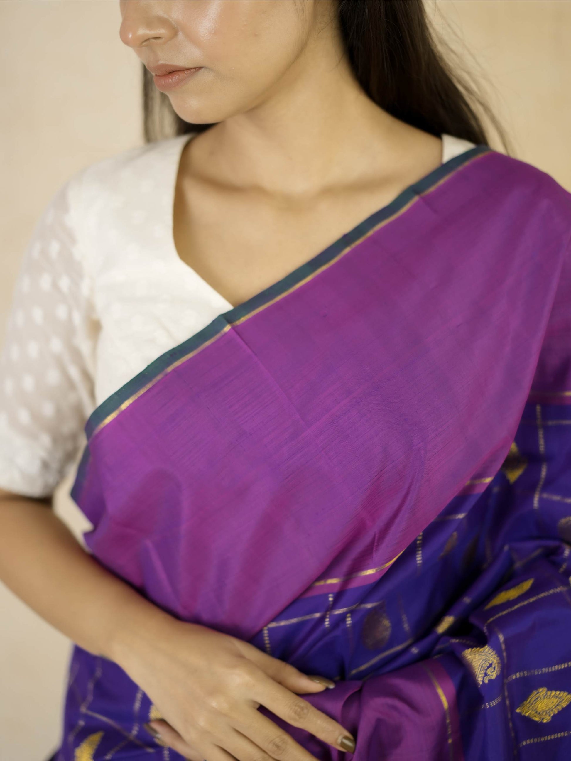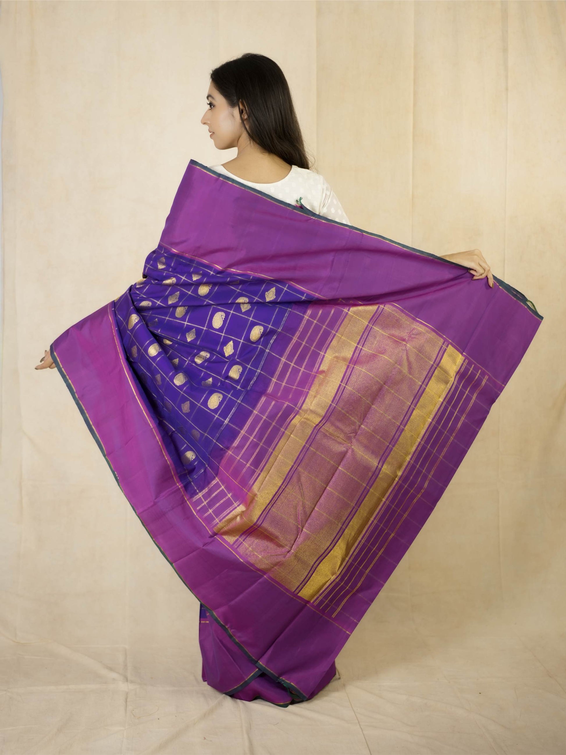 Indulge in the luxurious beauty of our purple and magenta dual tone silk Kanjeevaram saree, featuring elegant golden buttas and fine stripe patterns woven across the body. The saree is framed with a rich magenta border highlighted in golden zari, while the pallu showcases traditional paisley motifs intricately crafted in radiant golden zari, lending a classic and regal charm.