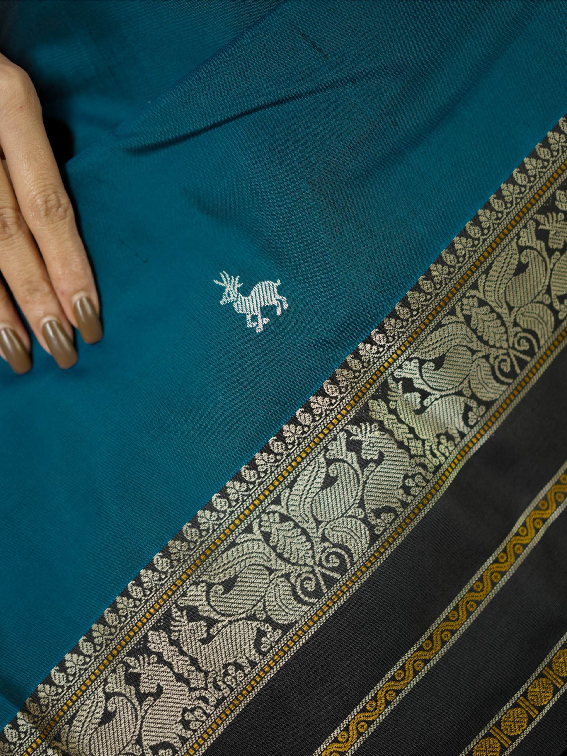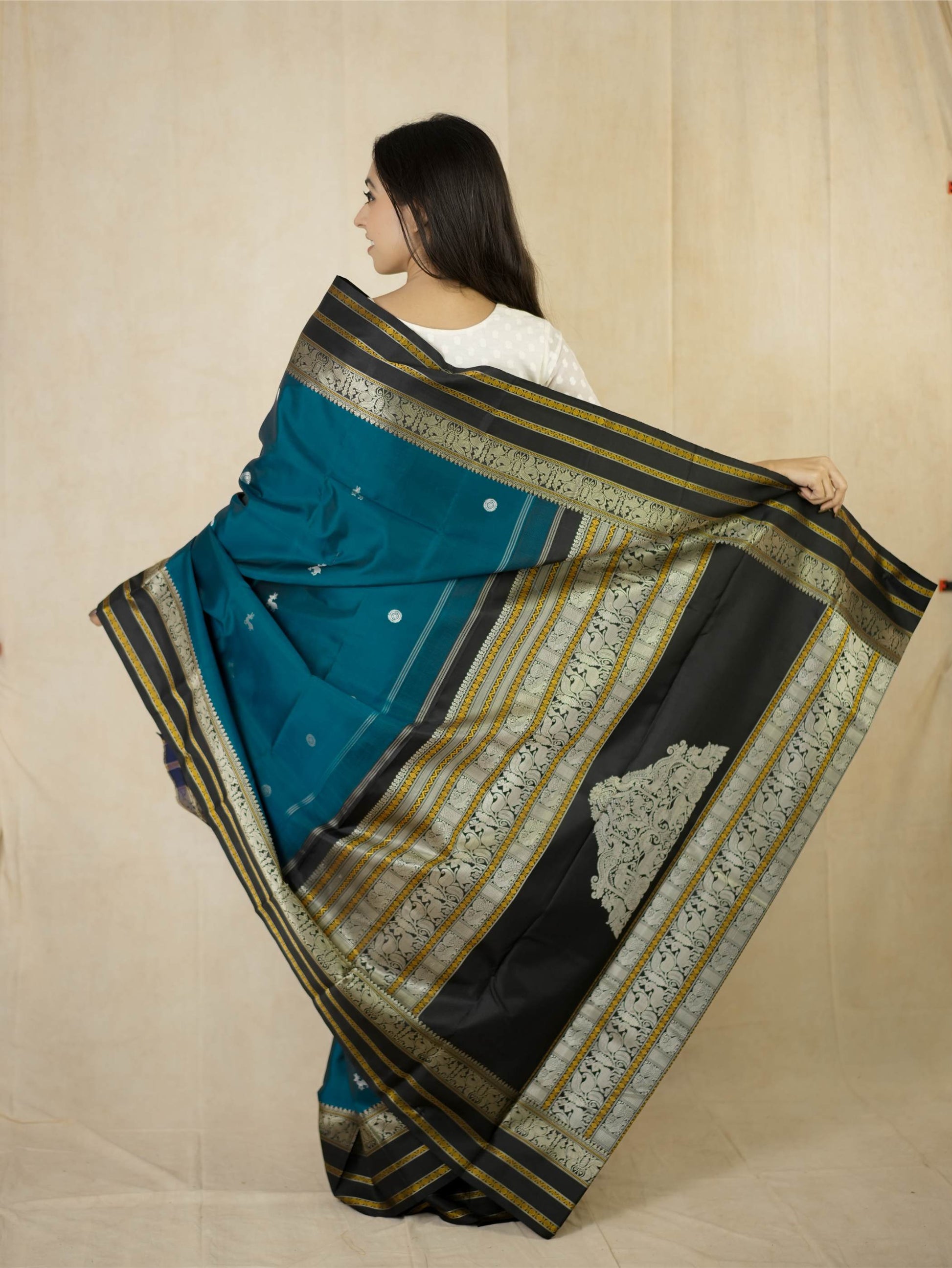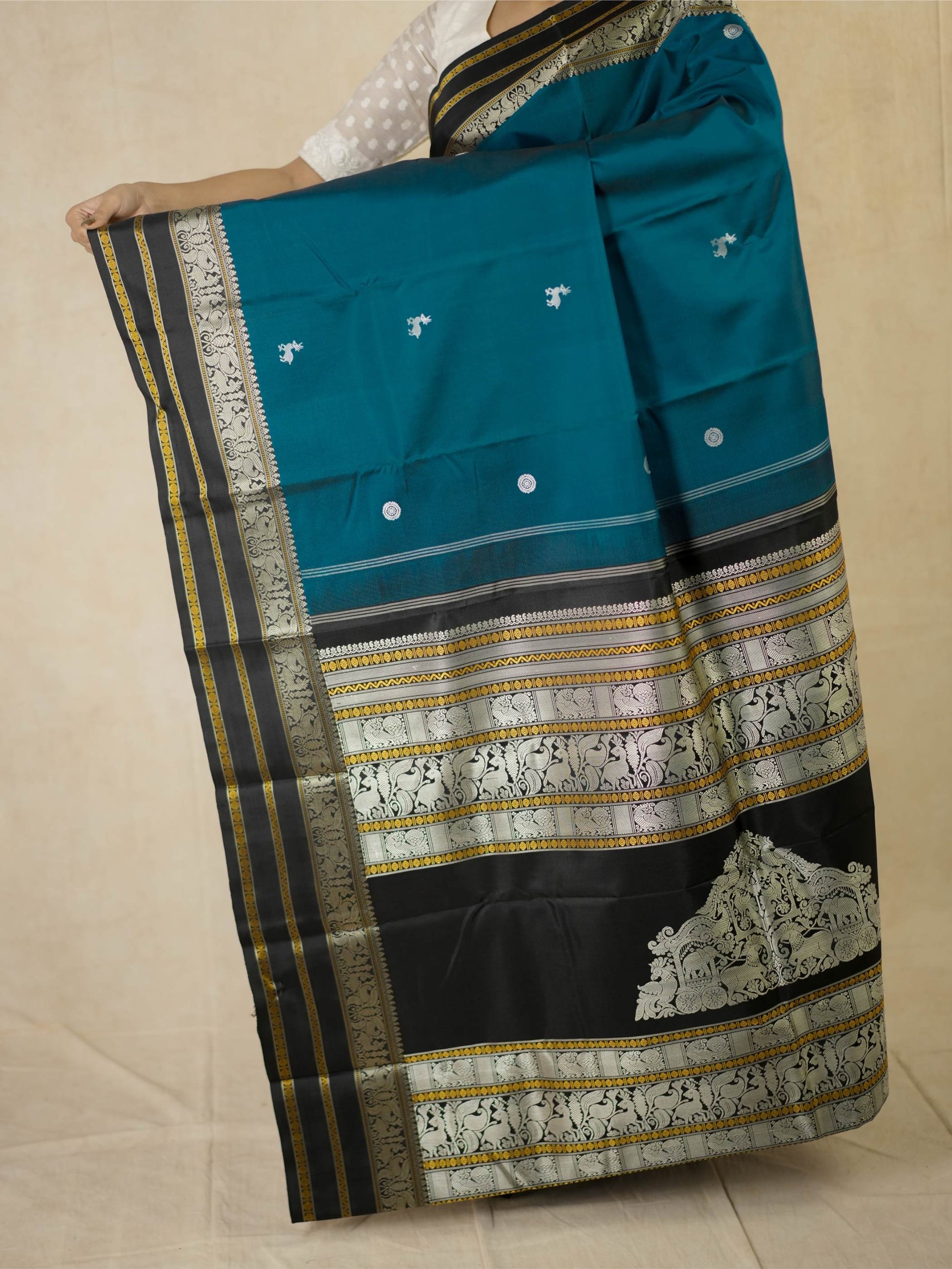 Indulge in the timeless charm of our teal blue silk Kanjeevaram saree, adorned with delicate silver-toned butta motifs across the body. It features a striking black border highlighted with silver and subtle gold accents. The pallu is richly woven with silver thread work showcasing traditional animal and floral motifs, crafted with zero zari for a graceful, elegant finish.
