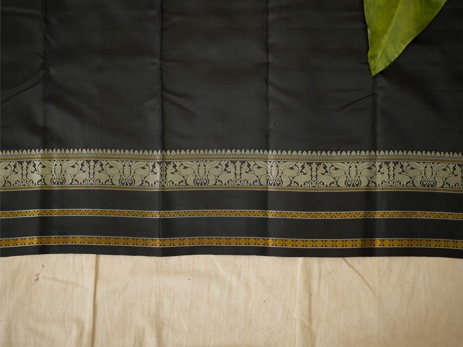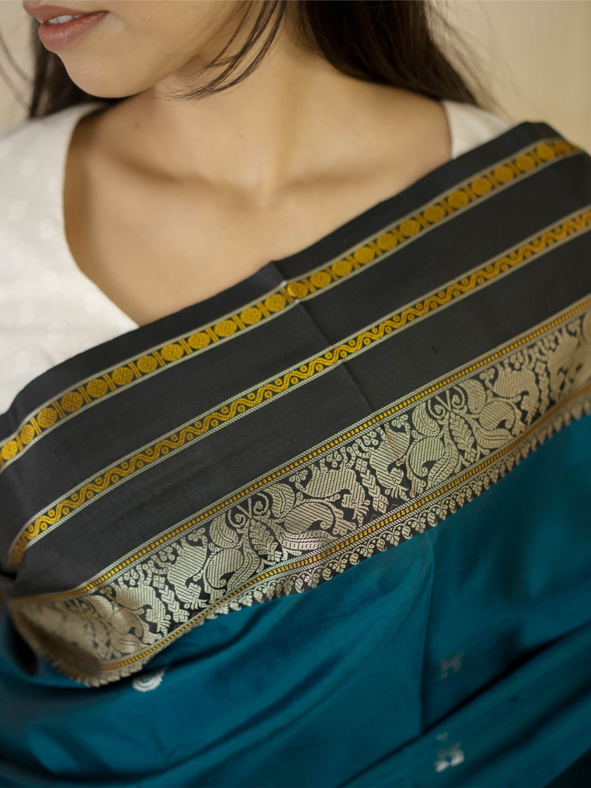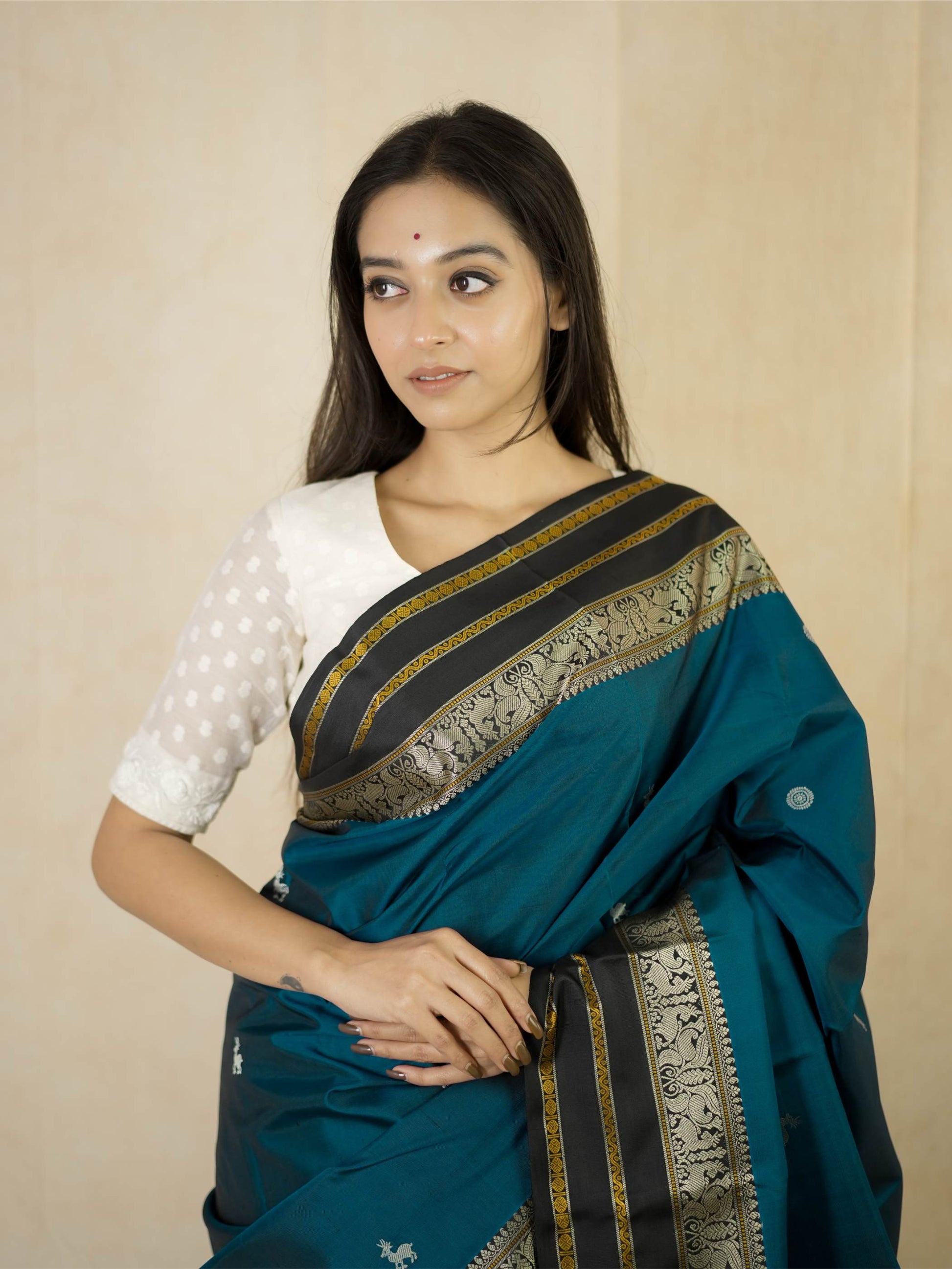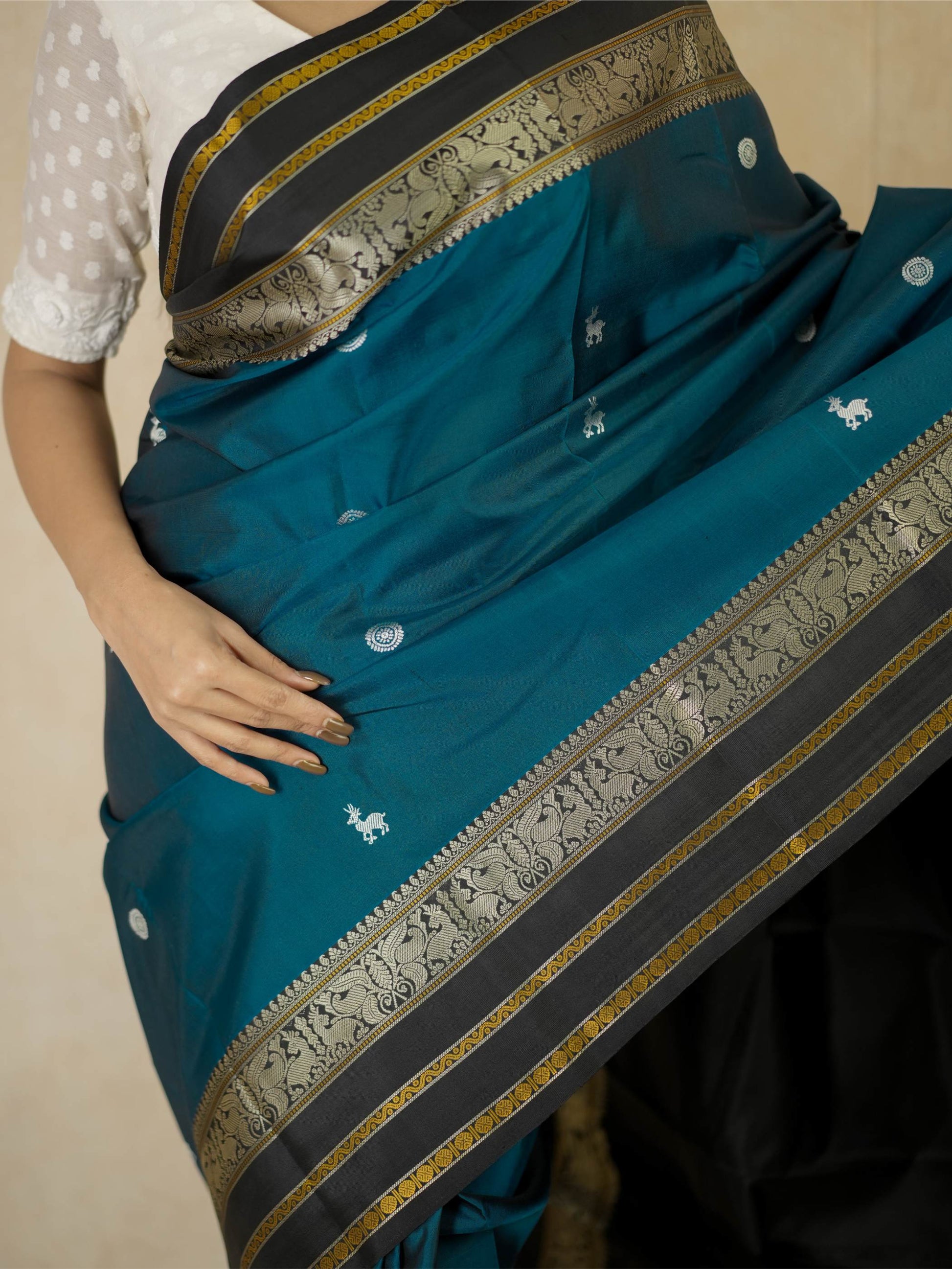 Indulge in the timeless charm of our teal blue silk Kanjeevaram saree, adorned with delicate silver-toned butta motifs across the body. It features a striking black border highlighted with silver and subtle gold accents. The pallu is richly woven with silver thread work showcasing traditional animal and floral motifs, crafted with zero zari for a graceful, elegant finish.