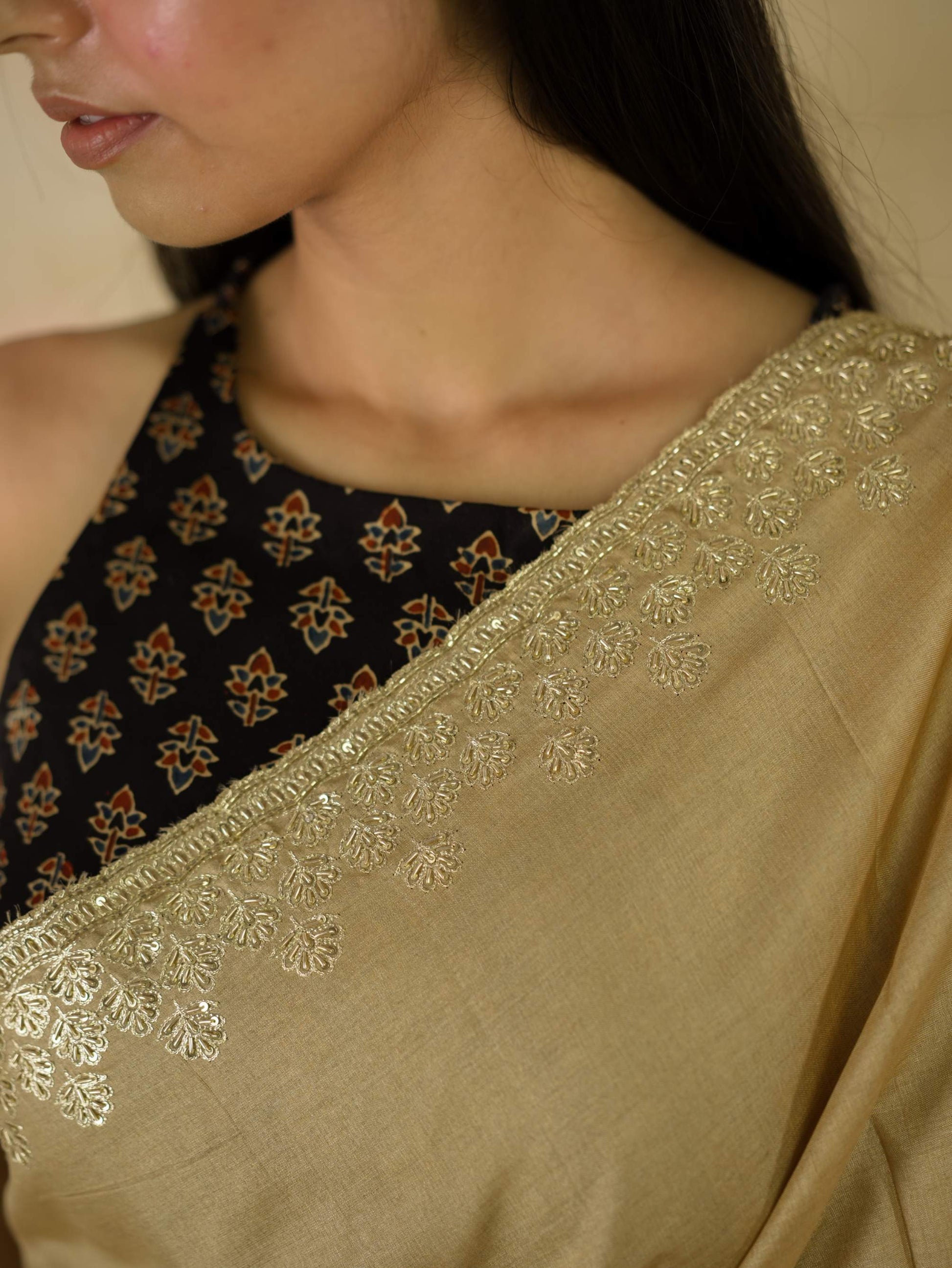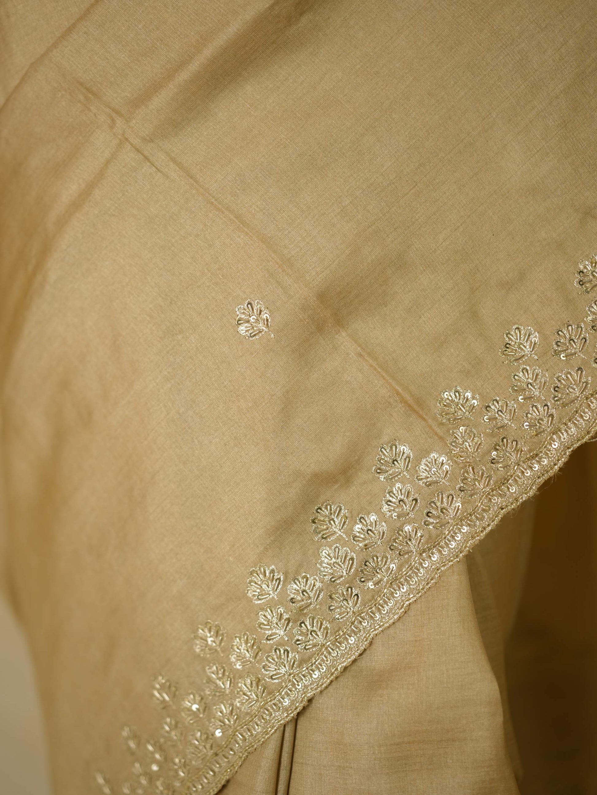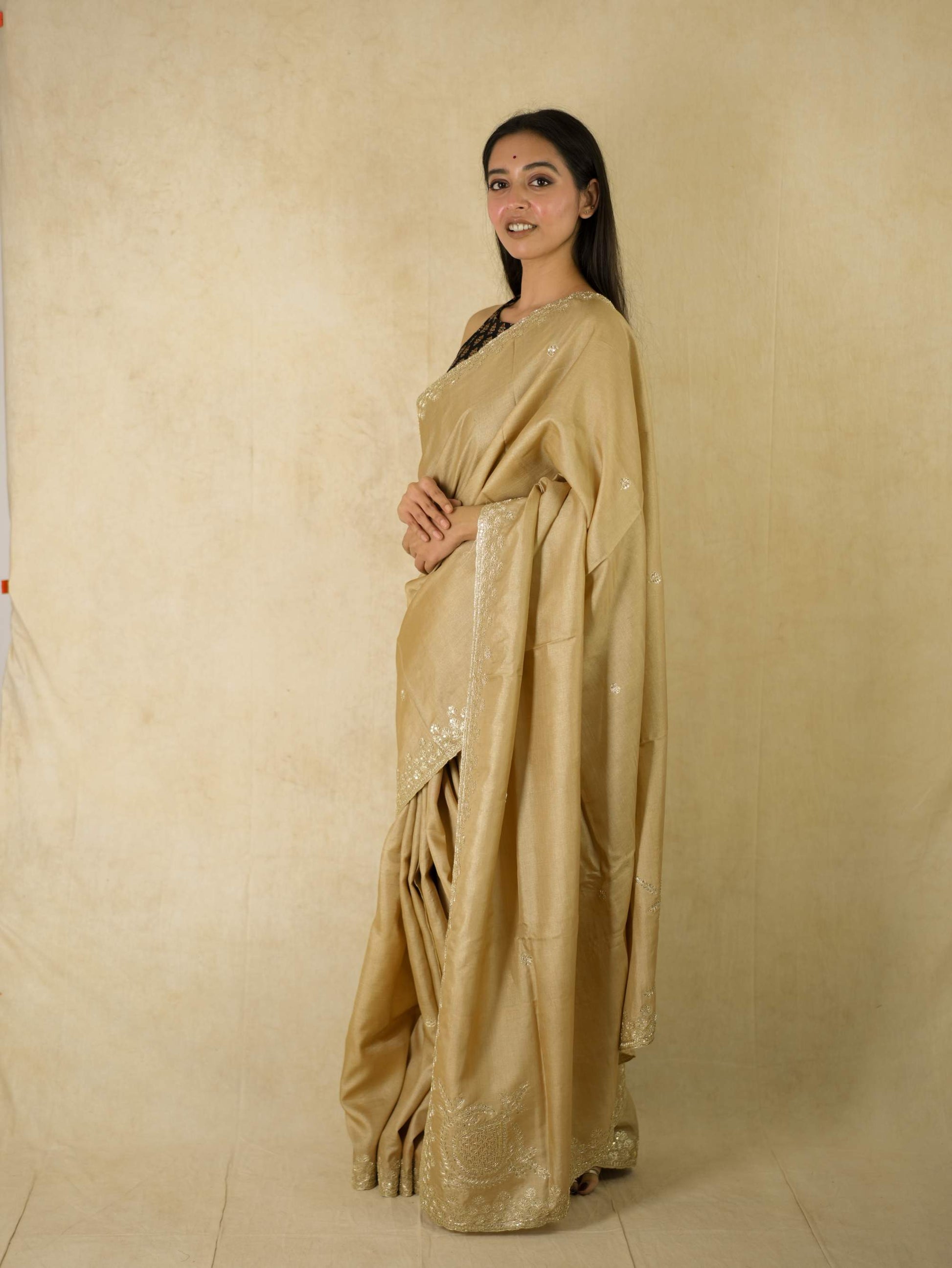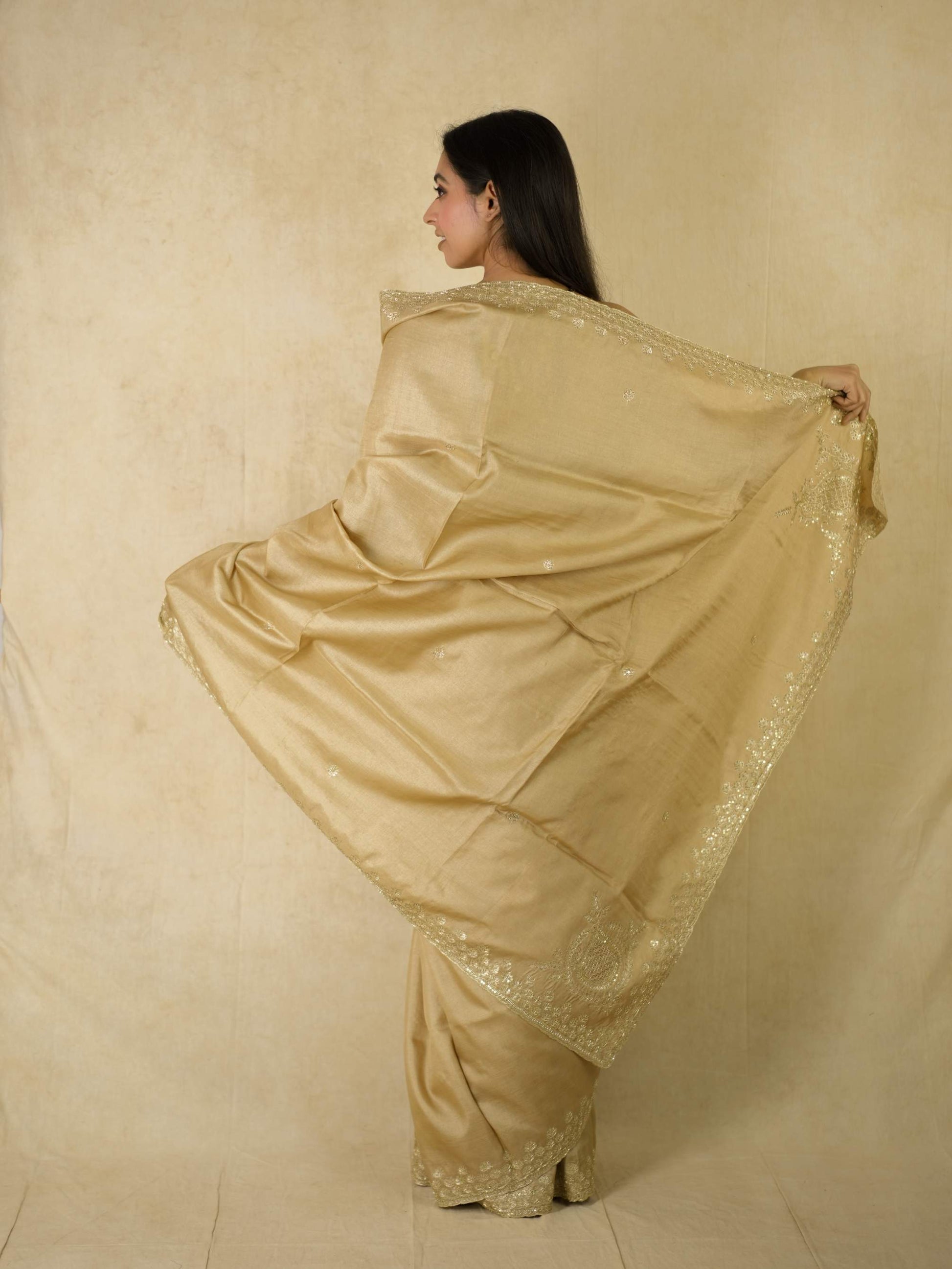Drape yourself in pure elegance with our beige luxurious Tussar silk saree, accentuated by exquisite hand pitai Zardosi embroidery. The natural texture of tussar silk paired with delicate detailing makes it a perfect ensemble for weddings, festive evenings, and grand celebrations. A true statement of timeless artistry and sophistication.