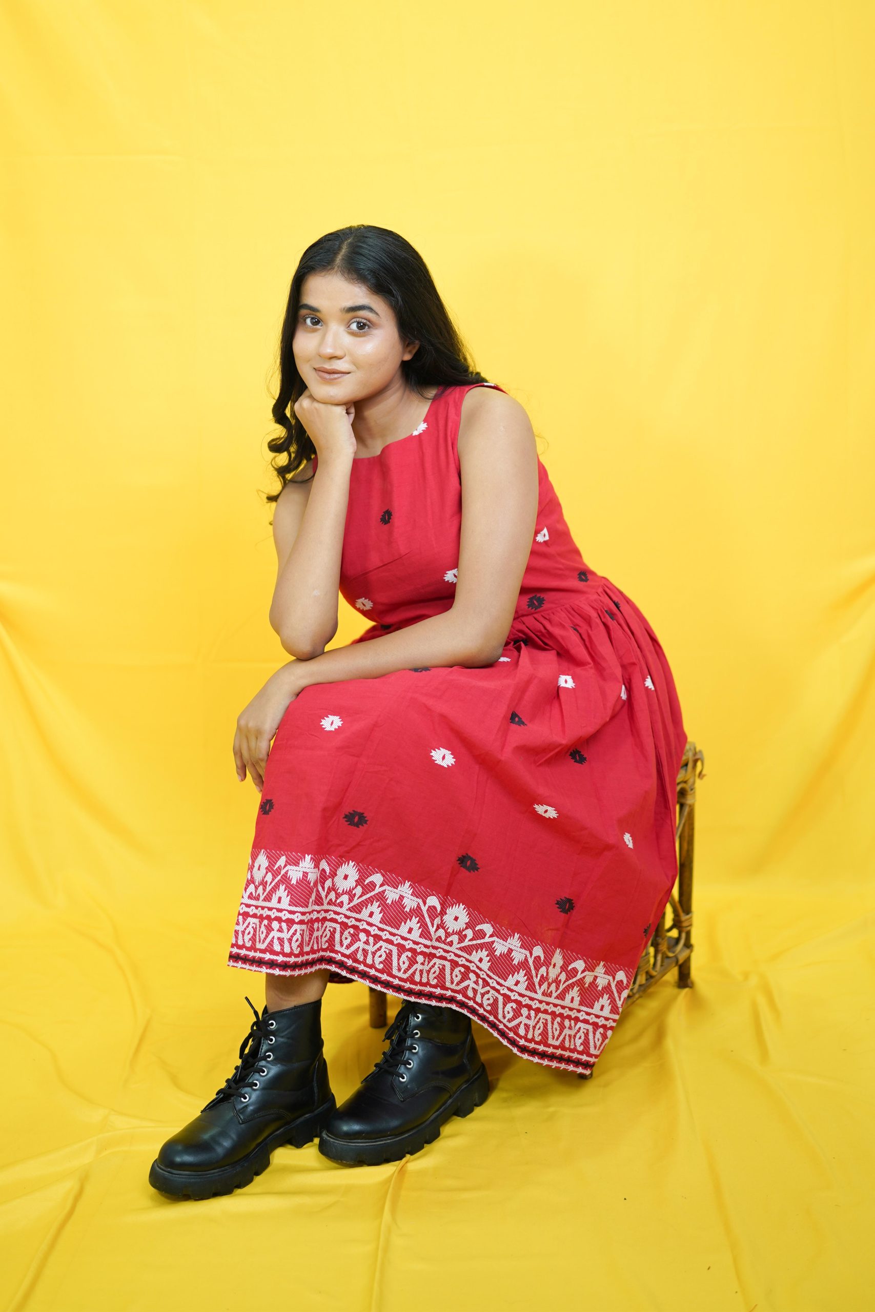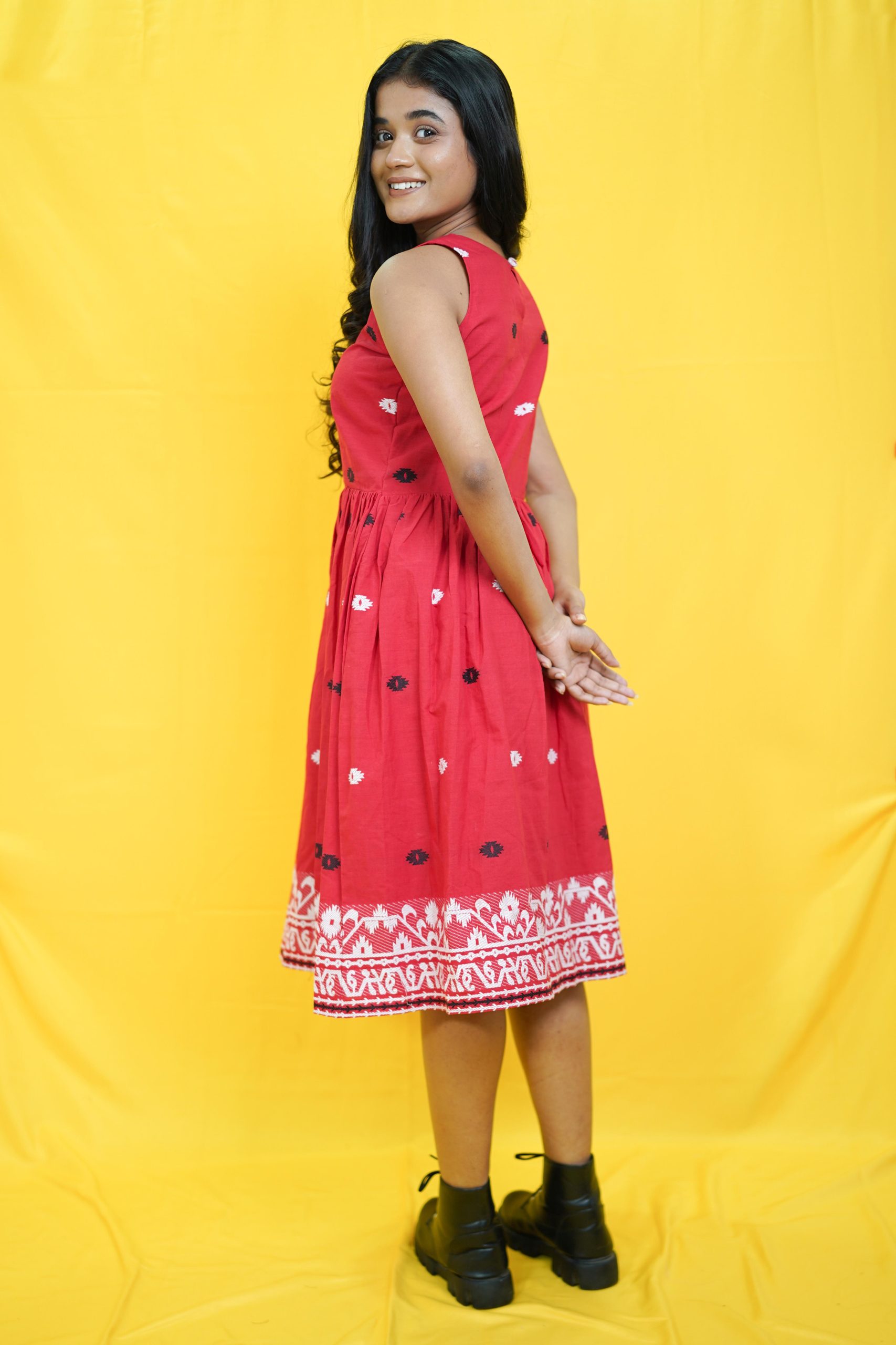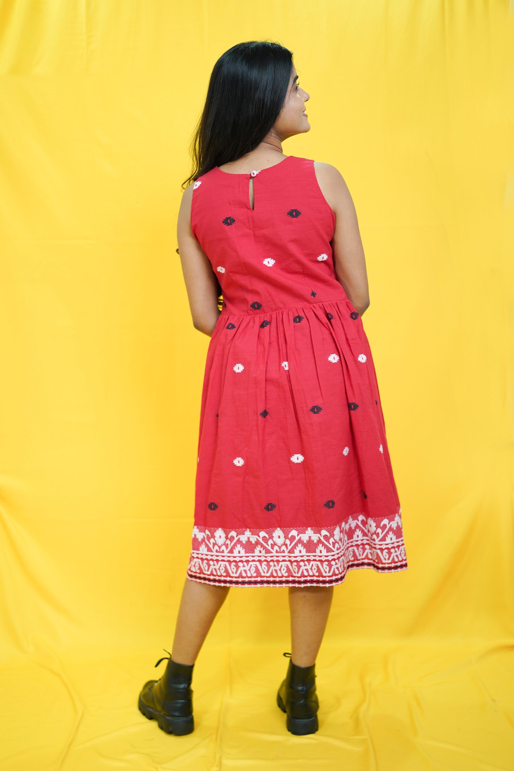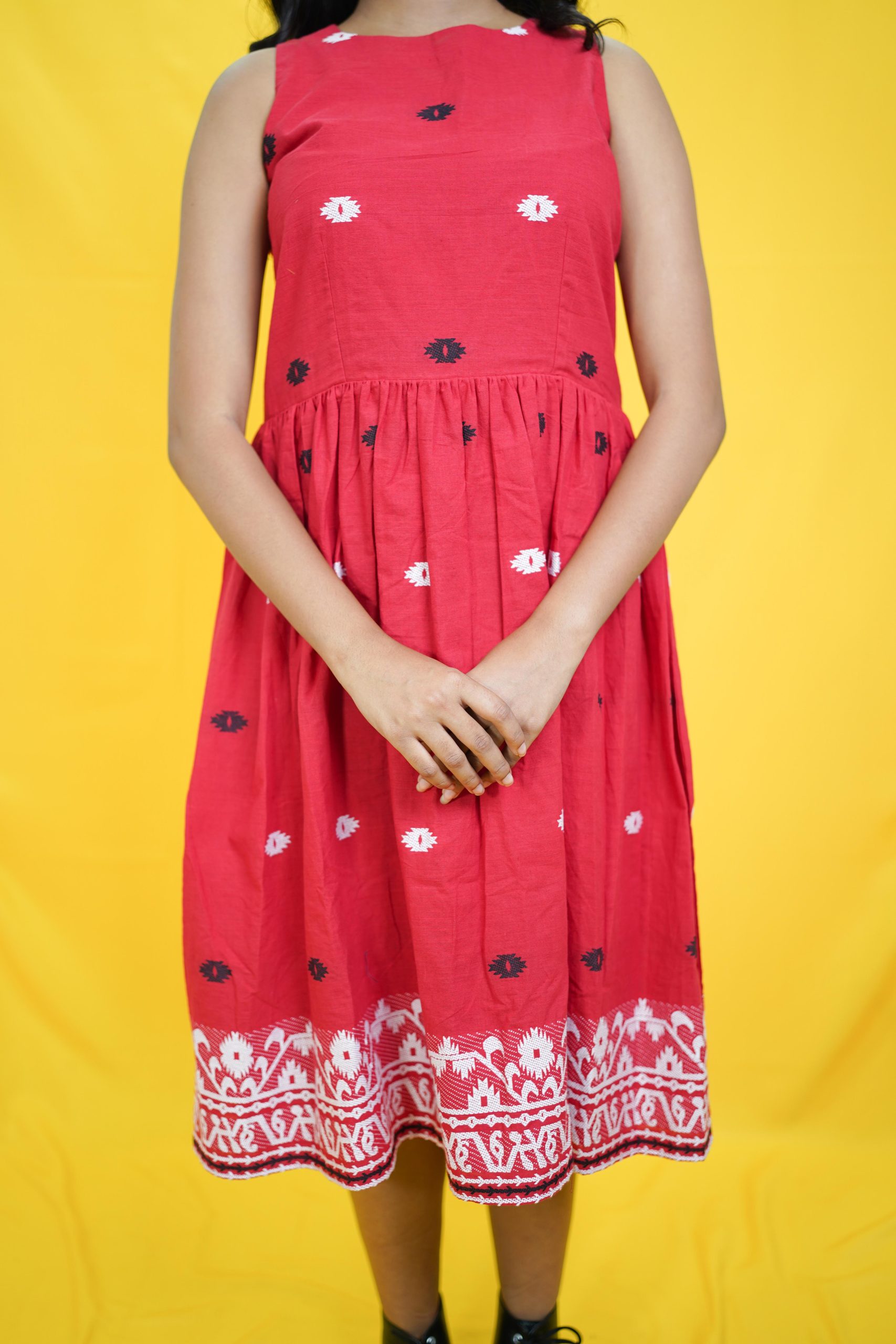 Made from pure cotton, this loose fit Jamdani midi dress, can be your top pick for an elegant yet relaxed vibe. Can be styled with a pair of mules & a cross-body sling for an effortless look. Available in colours other variant colours