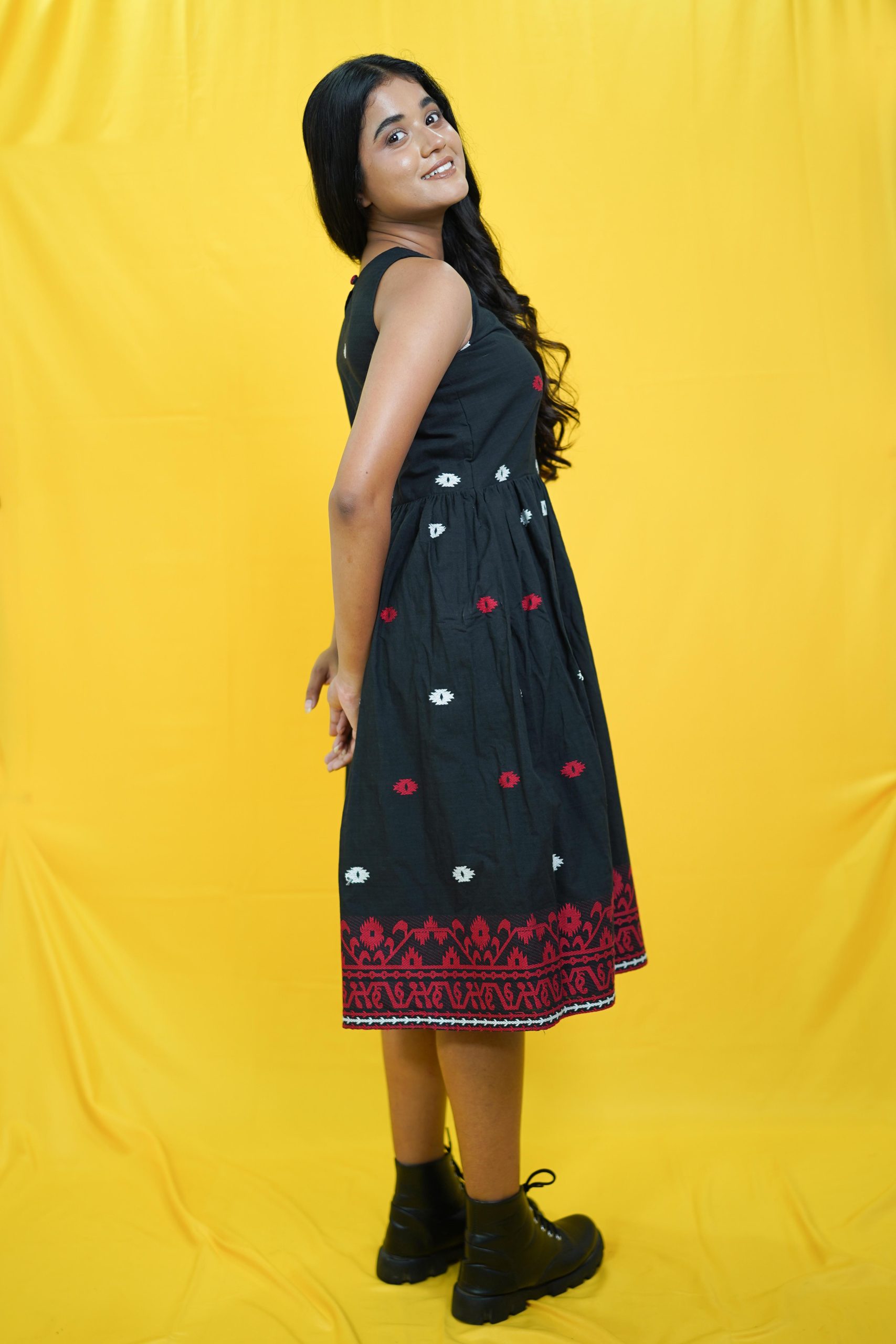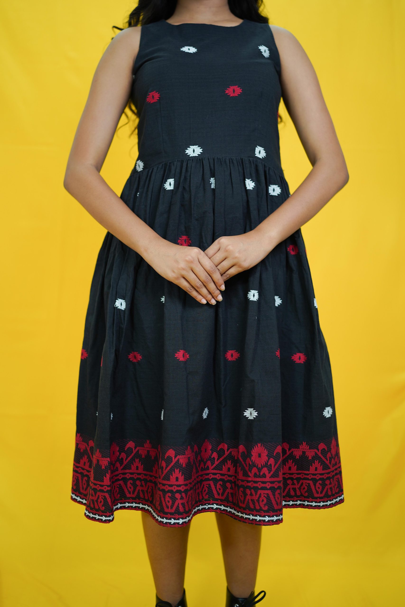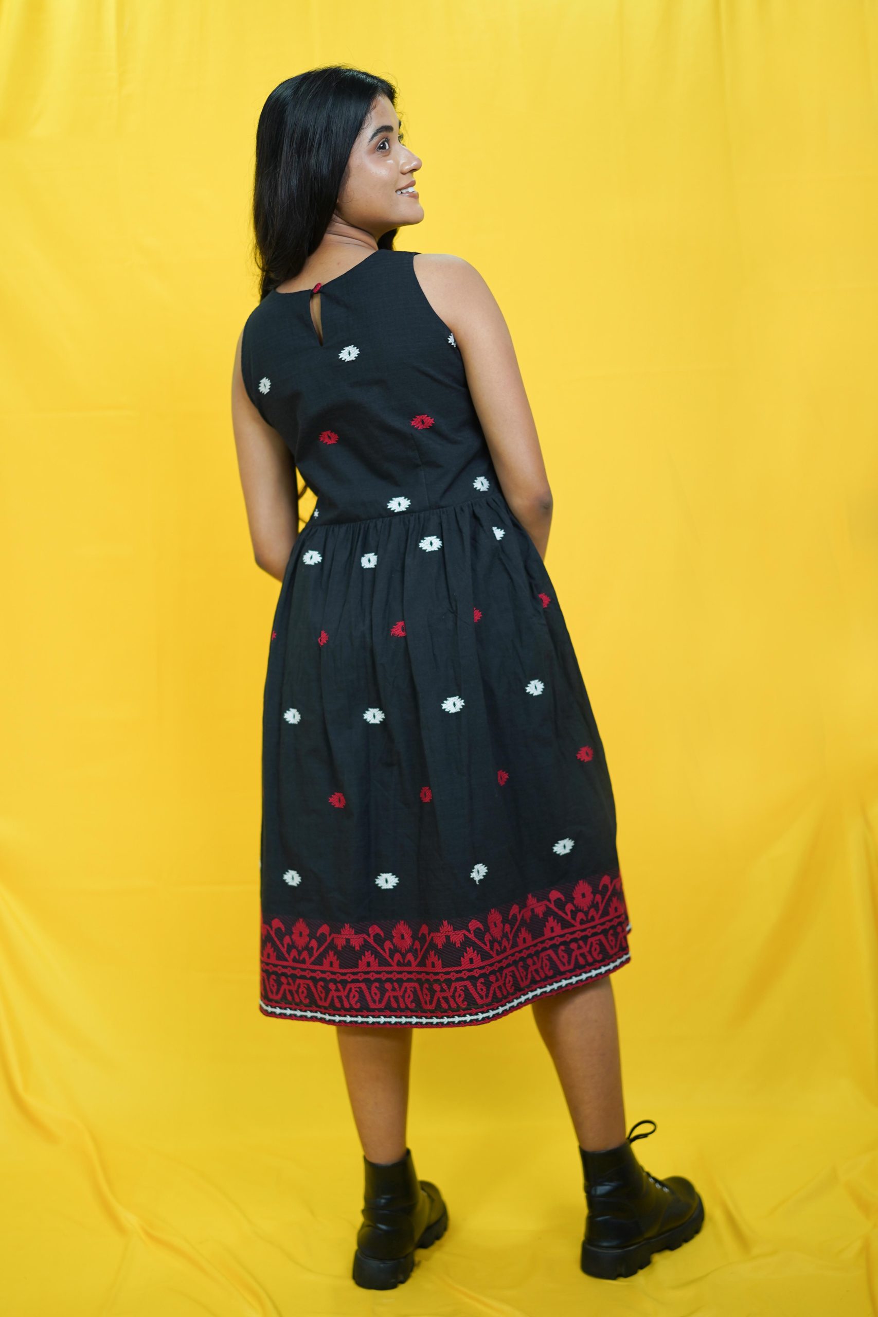 Made from pure cotton, this loose fit Jamdani midi dress, can be your top pick for an elegant yet relaxed vibe. Can be styled with a pair of mules & a cross-body sling for an effortless look. Available in colours other variant colours