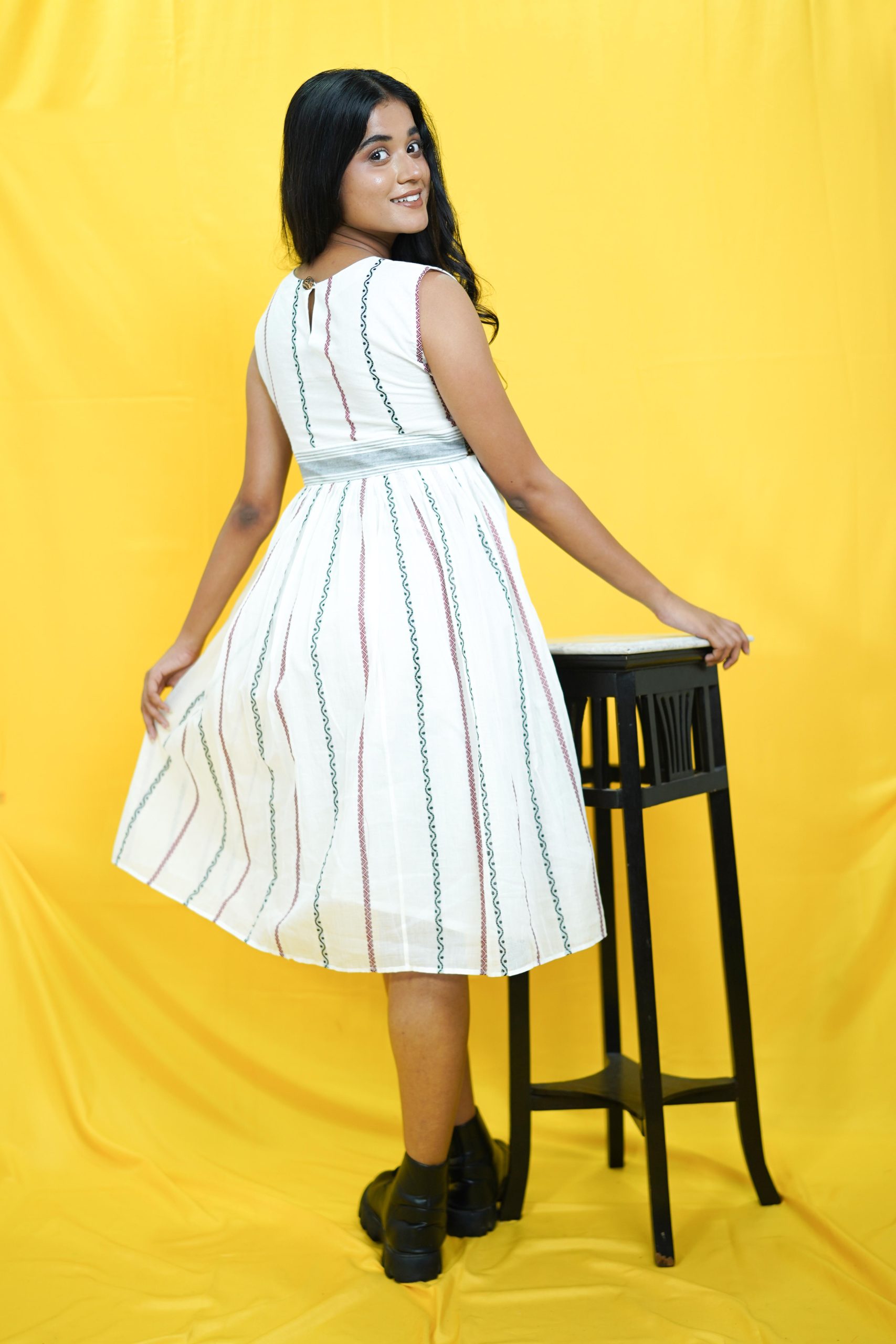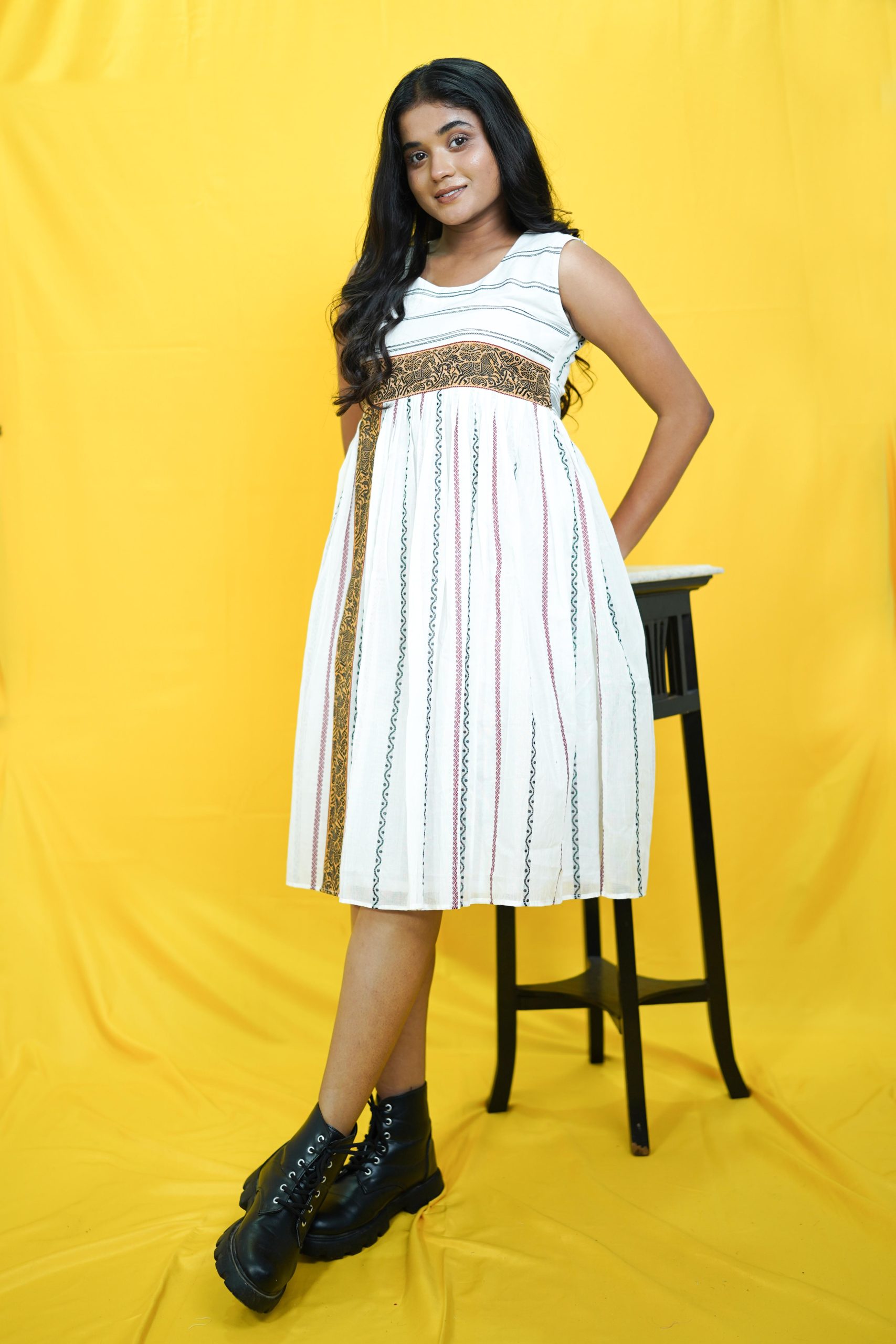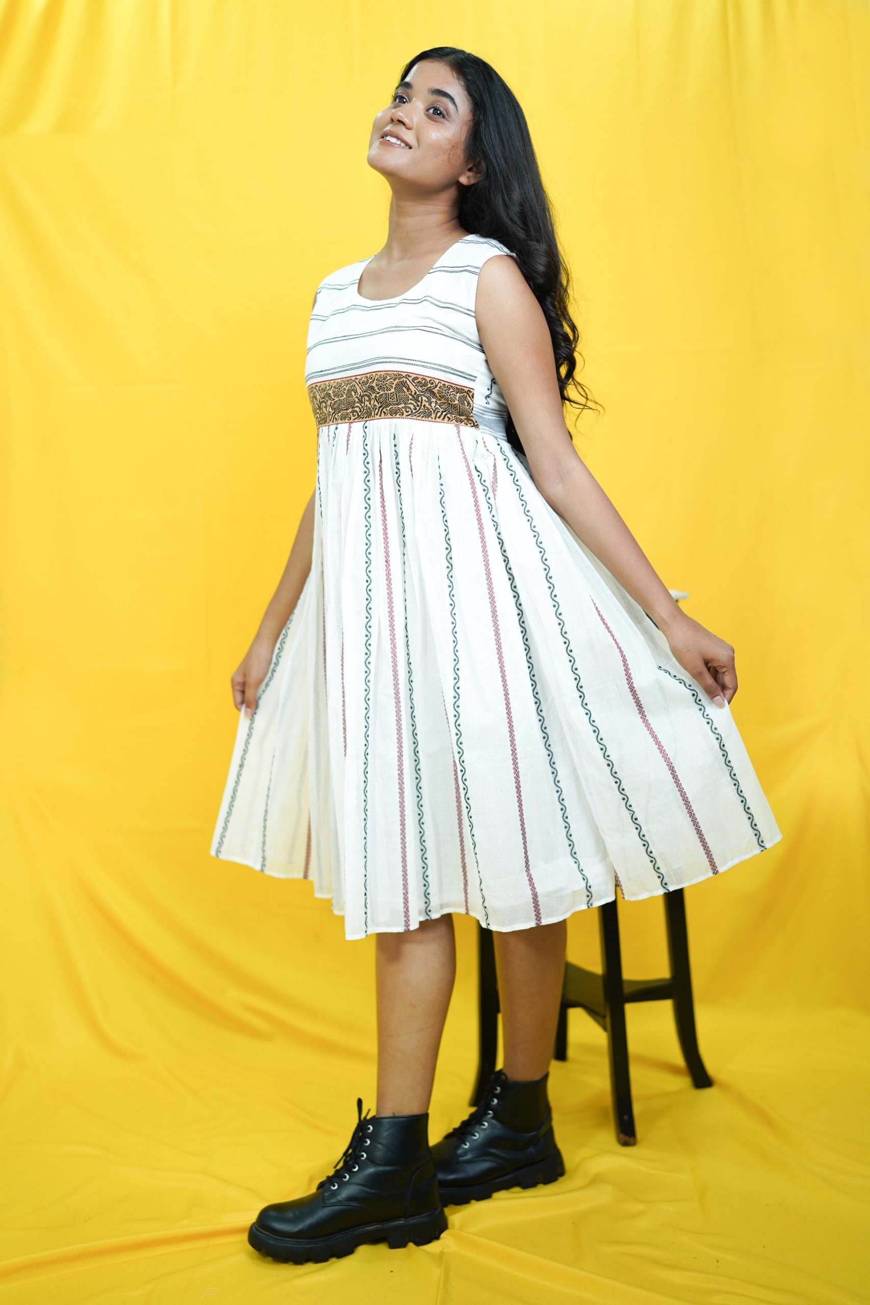 “Crafted from pure Chettinad cotton, this charming dress features traditional Kanchipuram motifs like horses and Nelli stripes, which run vertically for a graceful silhouette. Designed for both style and convenience, it comes with functional side pockets, making it a perfect blend of traditional elegance and everyday comfort.