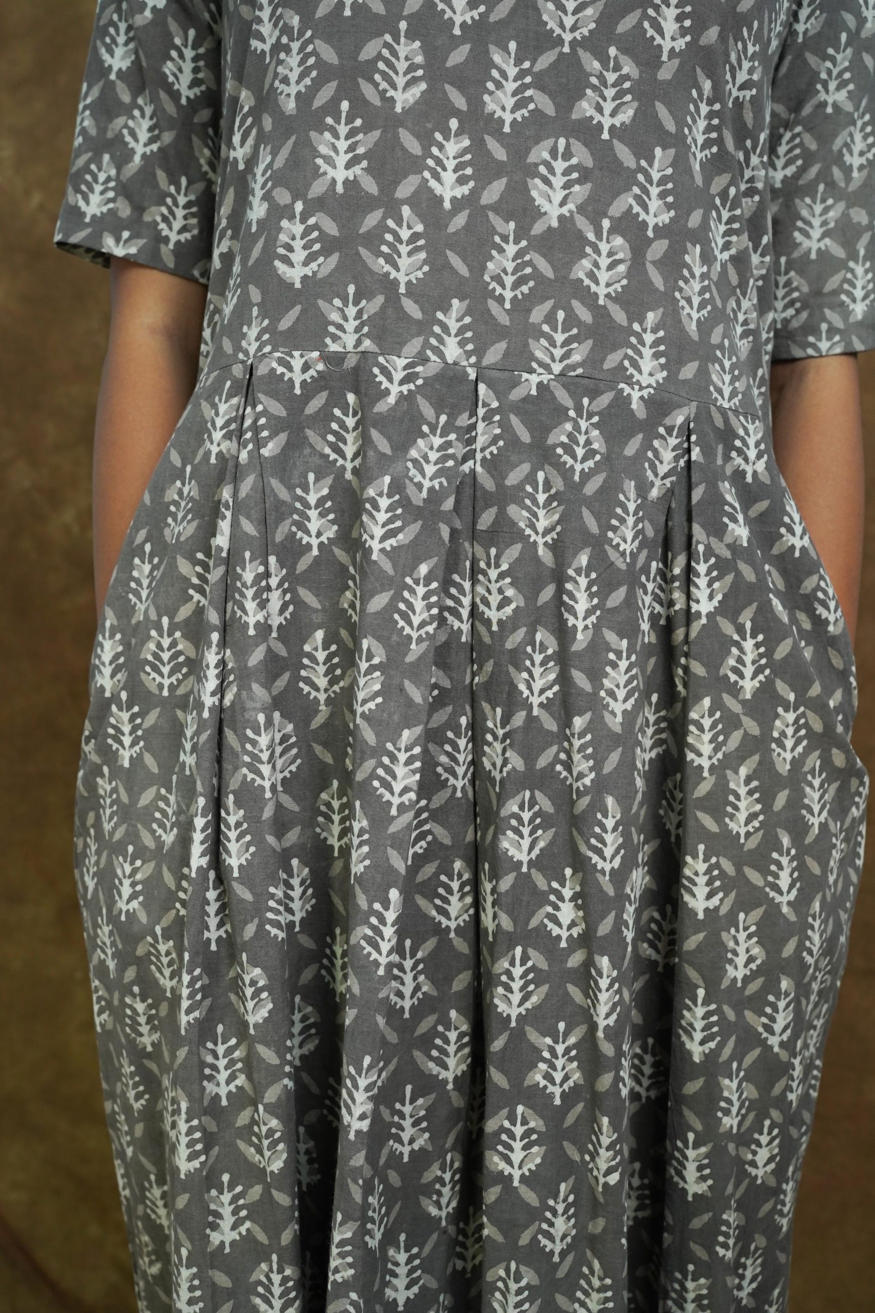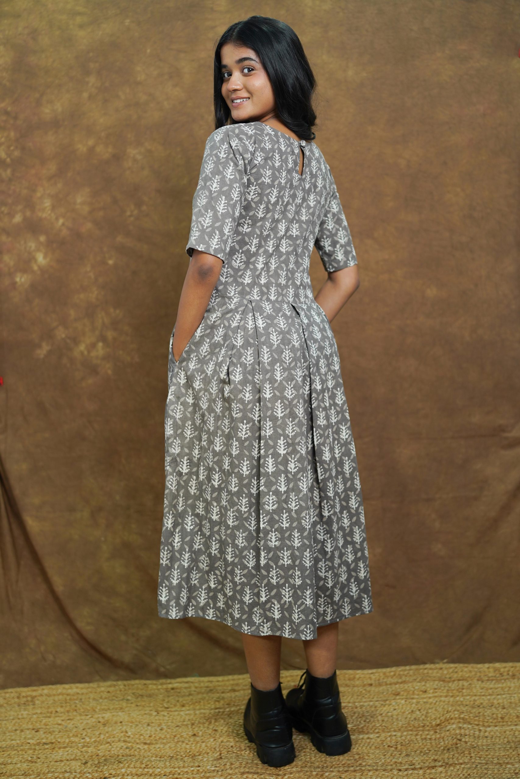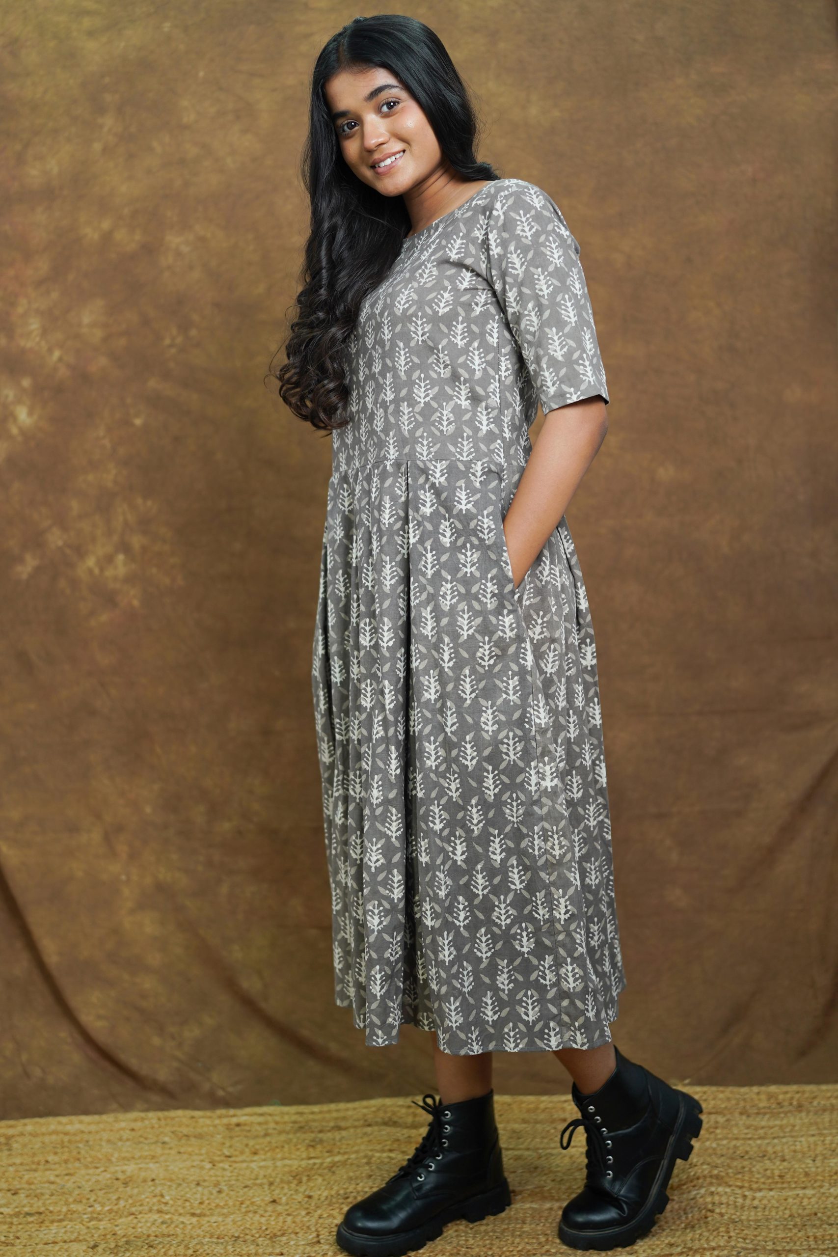 This cotton hand-block pure cotton printed dress can be your go to dress for work wear. Pair it with a wide belt and classic mules for a polished look.