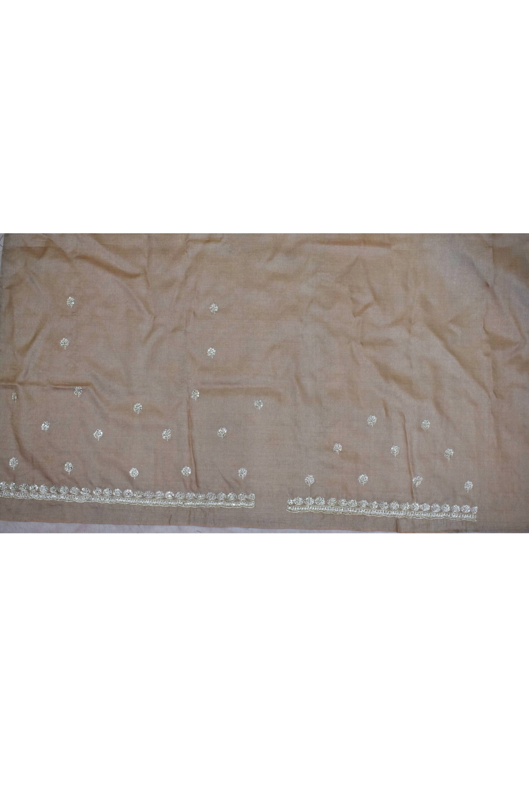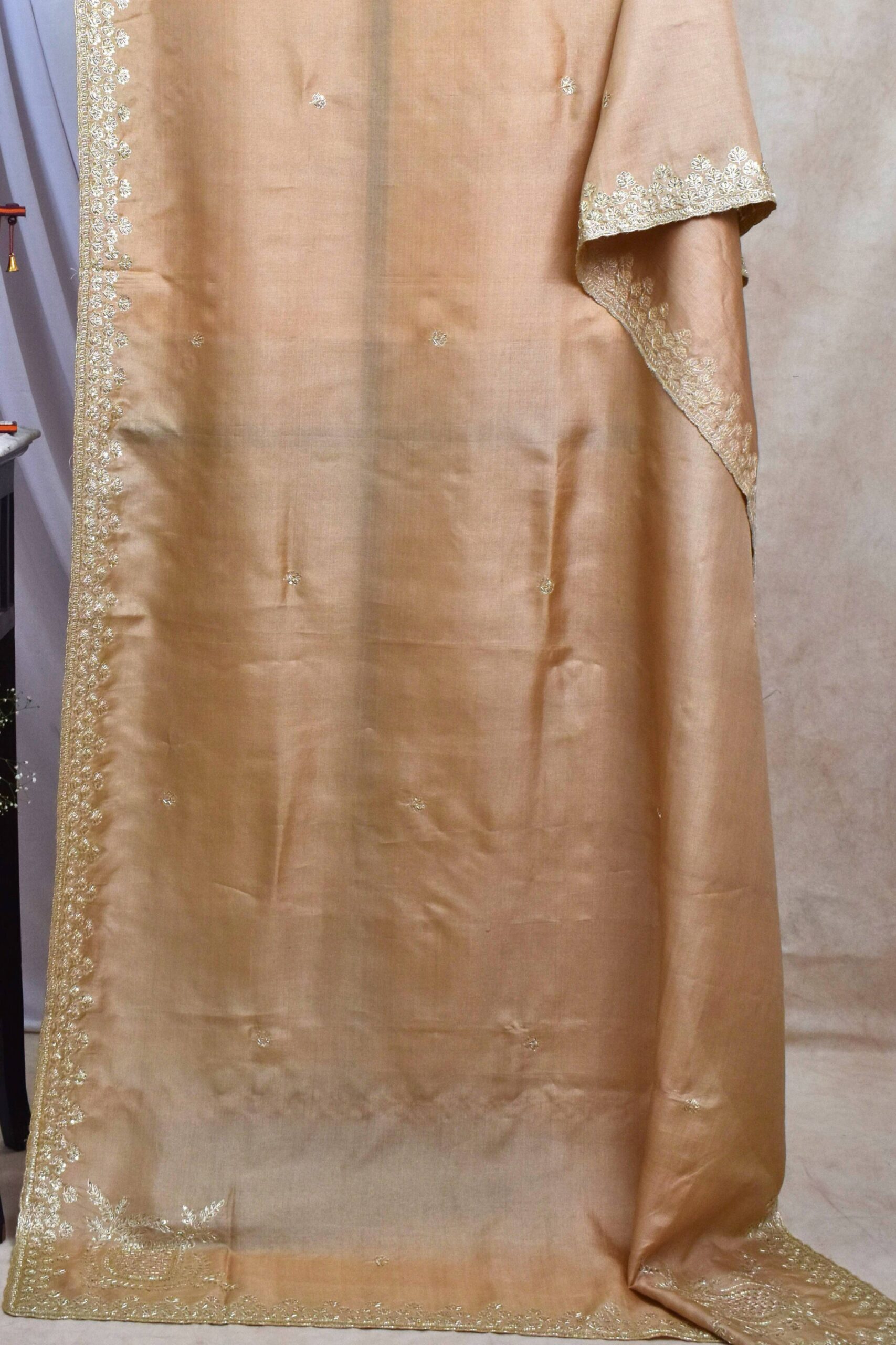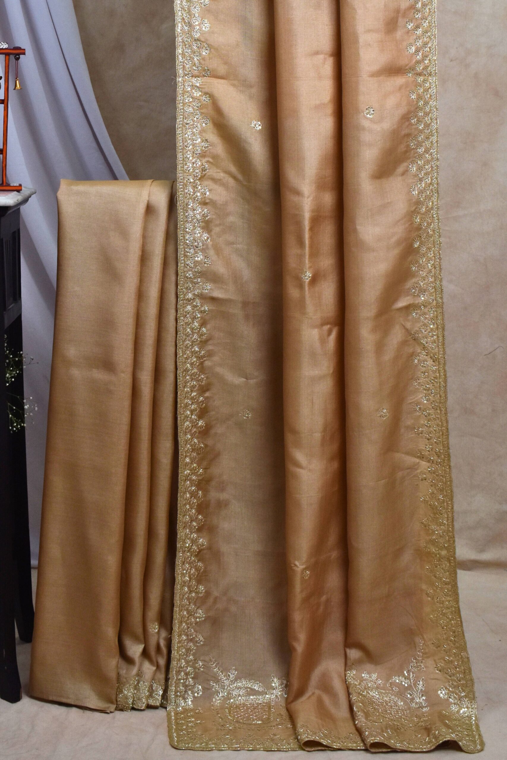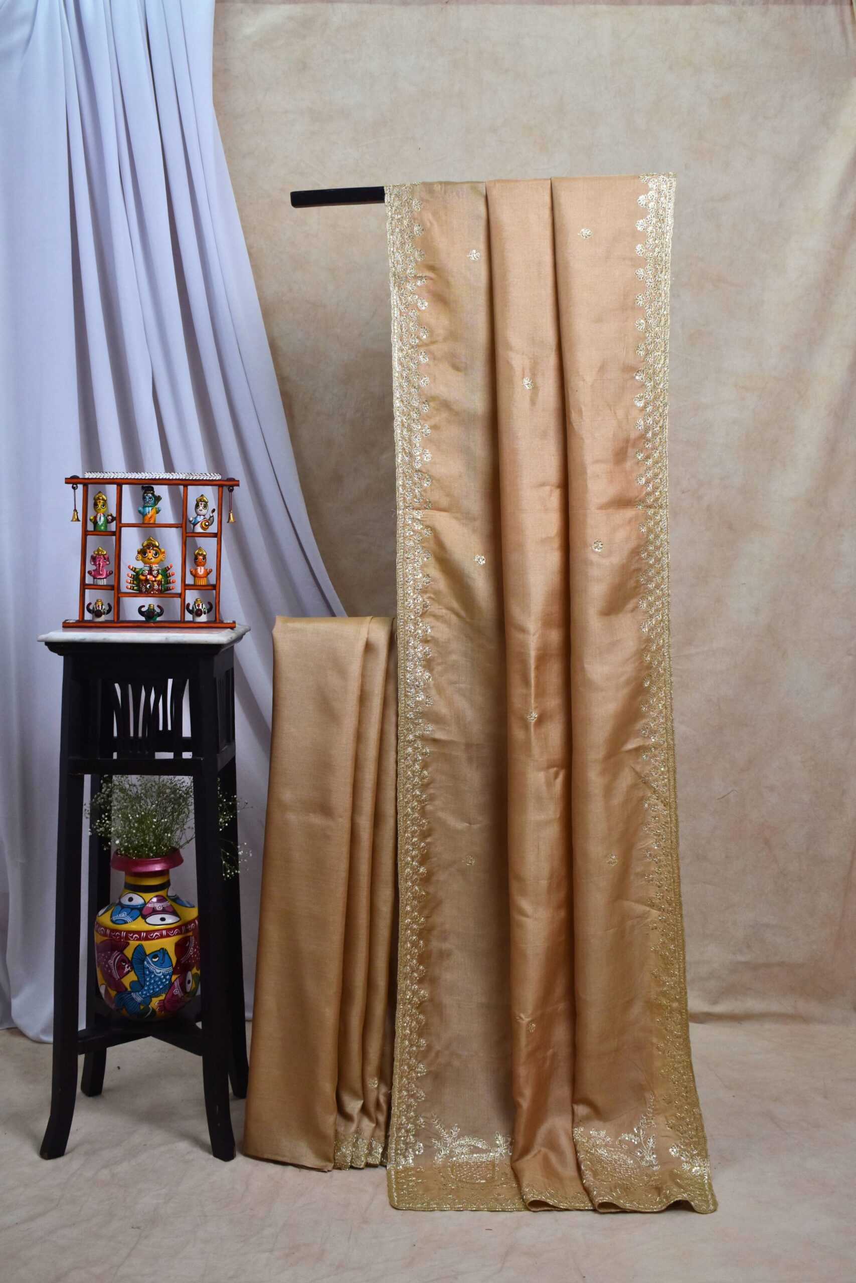 Drape yourself in pure elegance with our beige luxurious Tussar silk saree, accentuated by exquisite hand pitai Zardosi embroidery. The natural texture of tussar silk paired with delicate detailing makes it a perfect ensemble for weddings, festive evenings, and grand celebrations. A true statement of timeless artistry and sophistication.