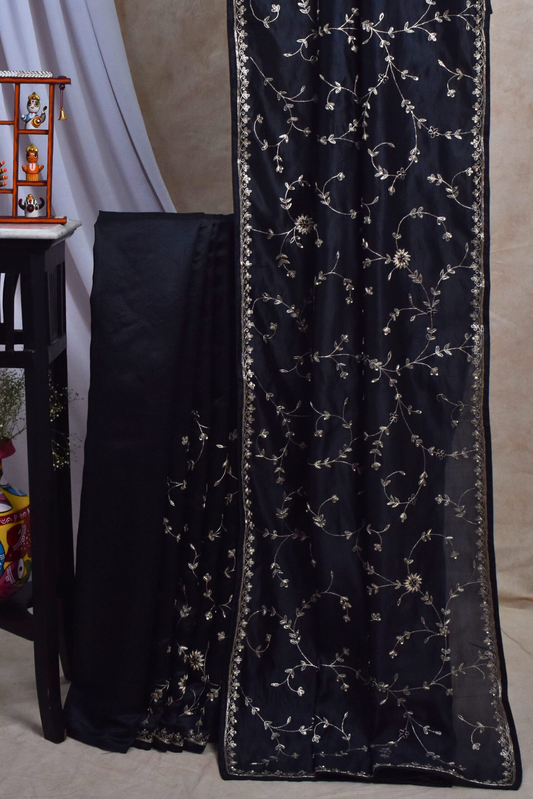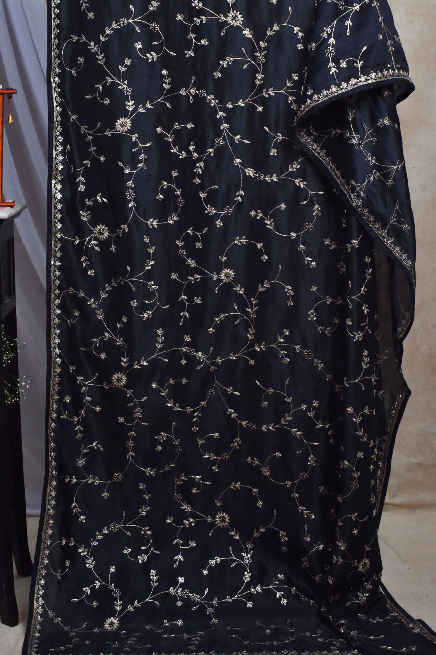 Drape yourself in pure elegance with our black luxurious Tussar silk saree, accentuated by exquisite hand pitai Zardosi embroidery. The natural texture of tussar silk paired with delicate detailing makes it a perfect ensemble for weddings, festive evenings, and grand celebrations. A true statement of timeless artistry and sophistication.