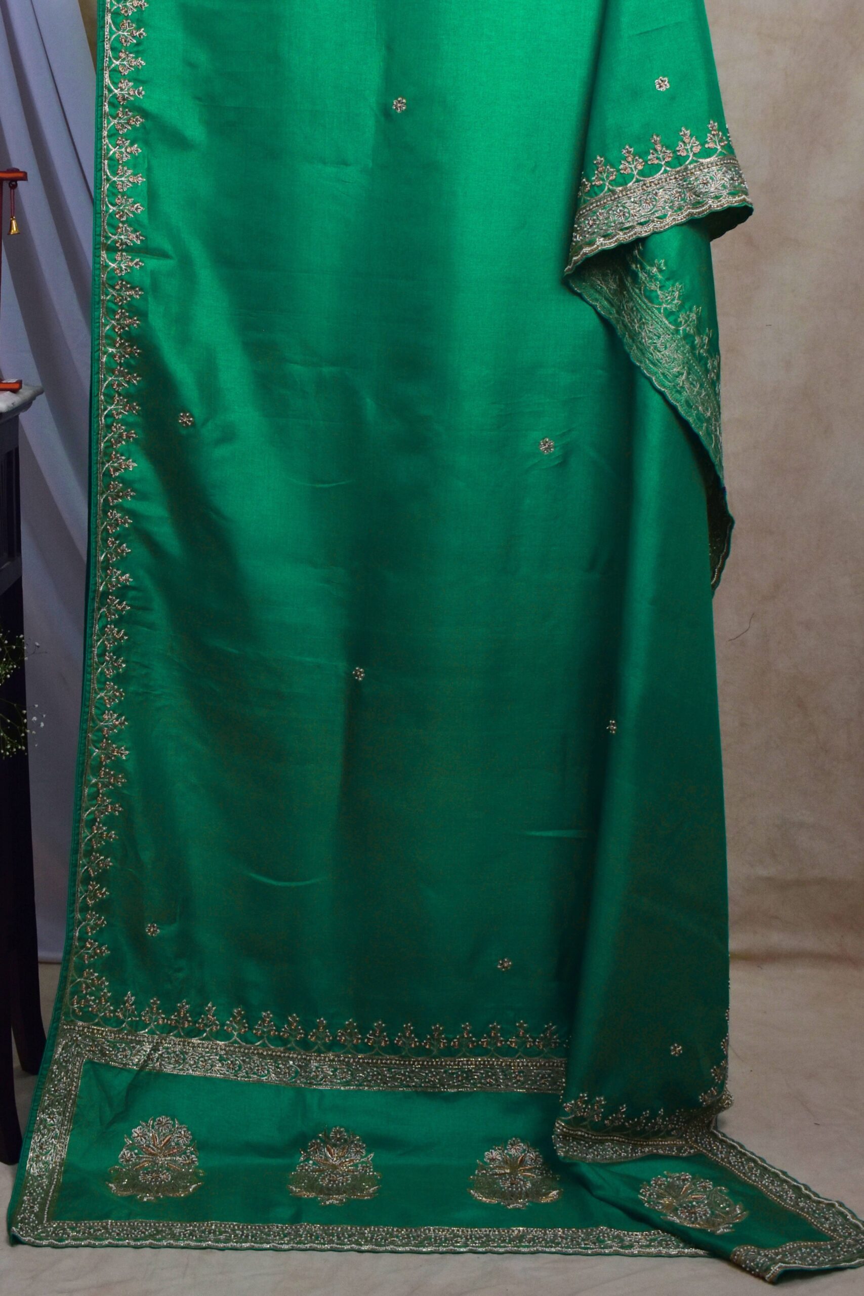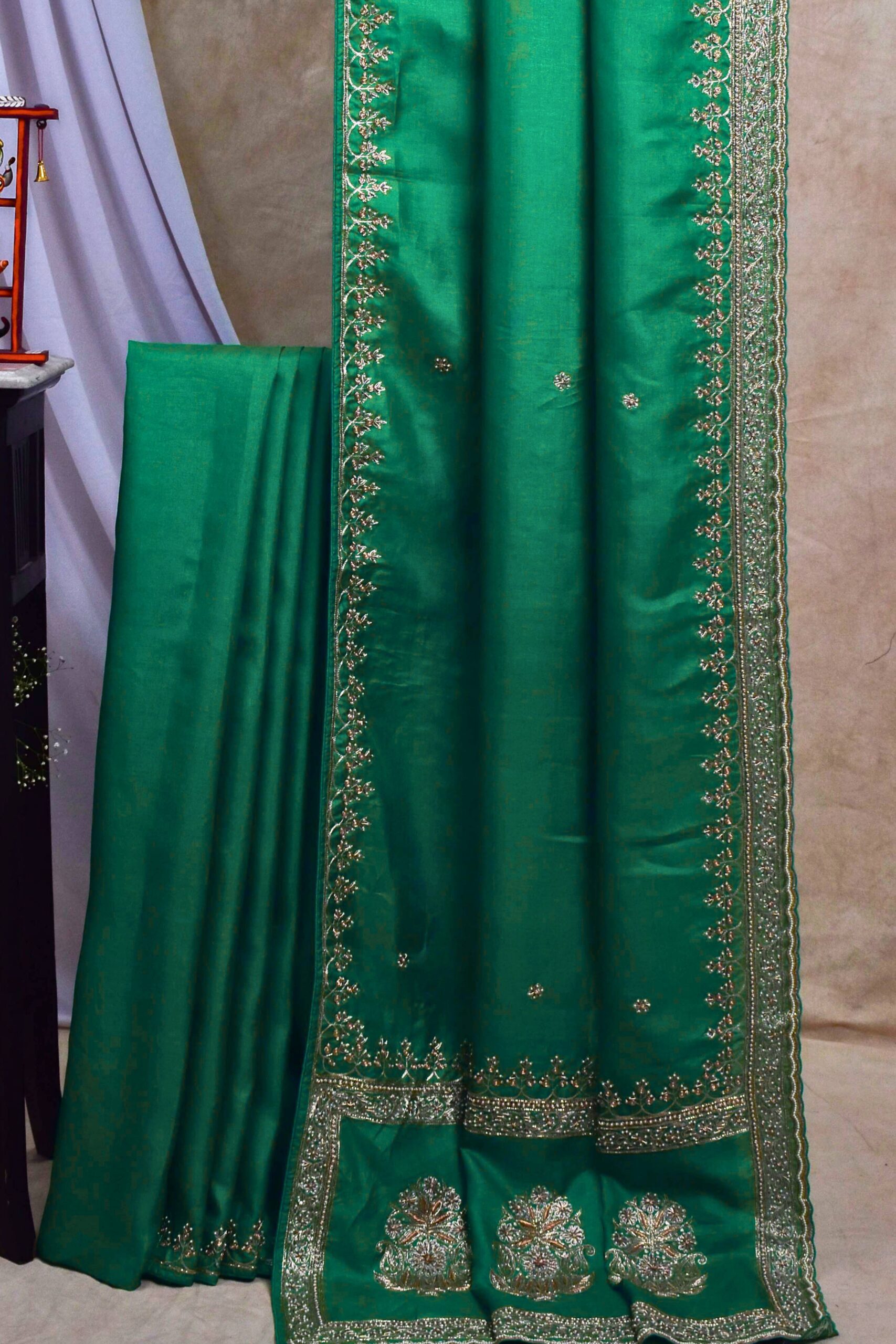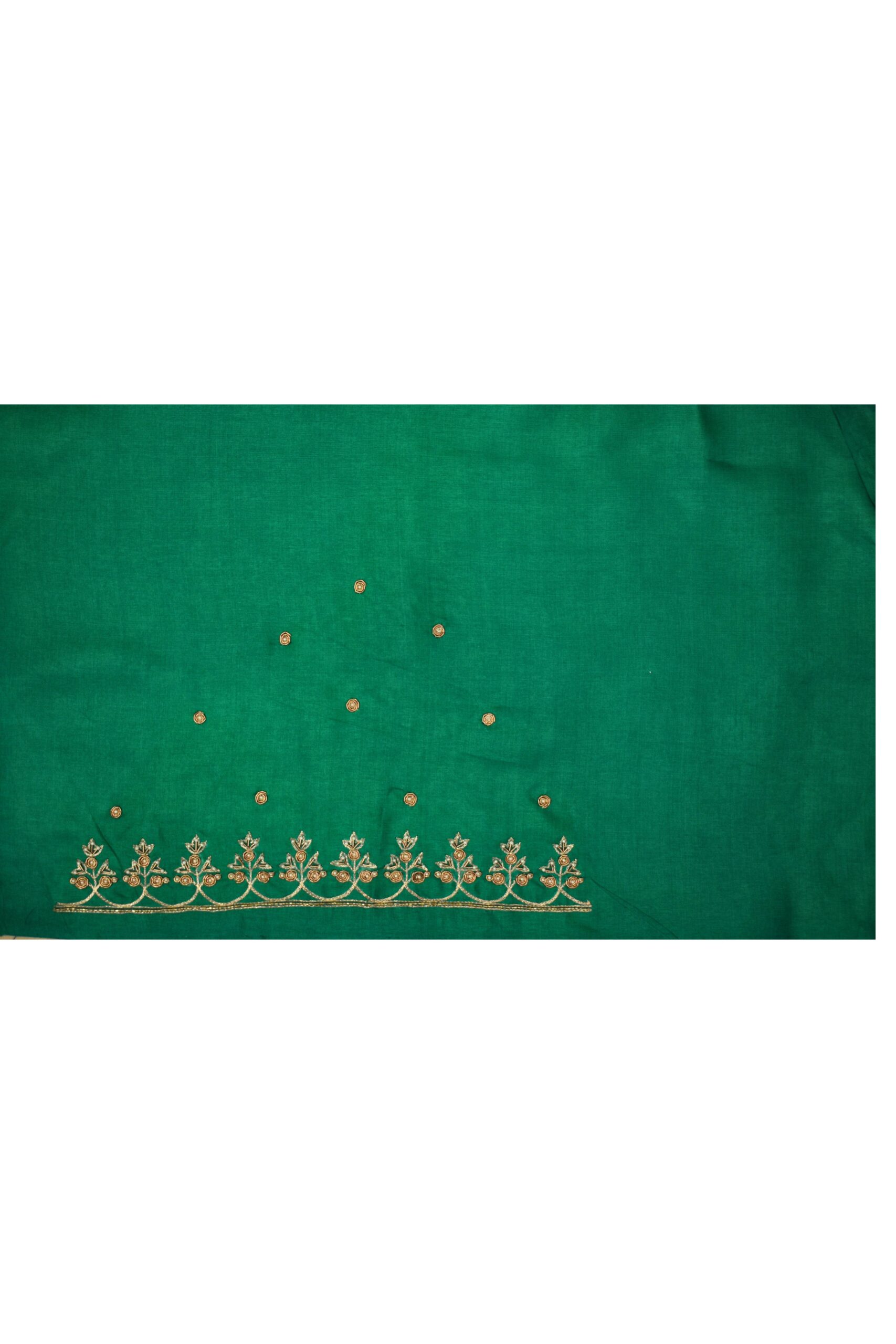 Drape yourself in pure elegance with our green luxurious Tussar silk saree, accentuated by exquisite hand pitai Zardosi embroidery. The natural texture of tussar silk paired with delicate detailing makes it a perfect ensemble for weddings, festive evenings, and grand celebrations. A true statement of timeless artistry and sophistication.
