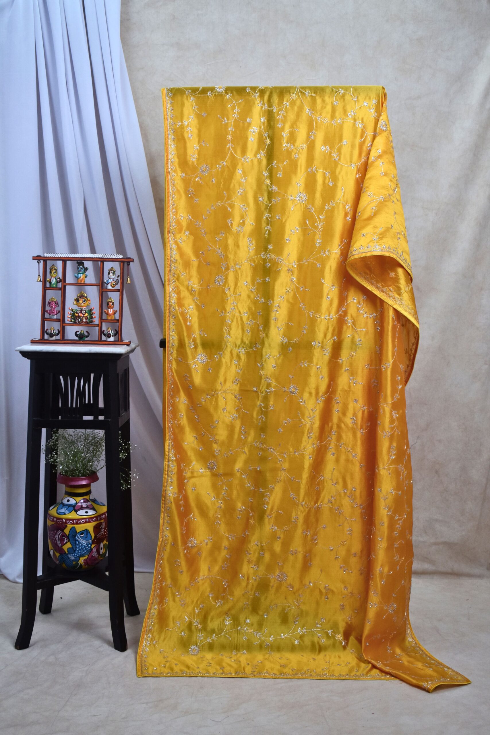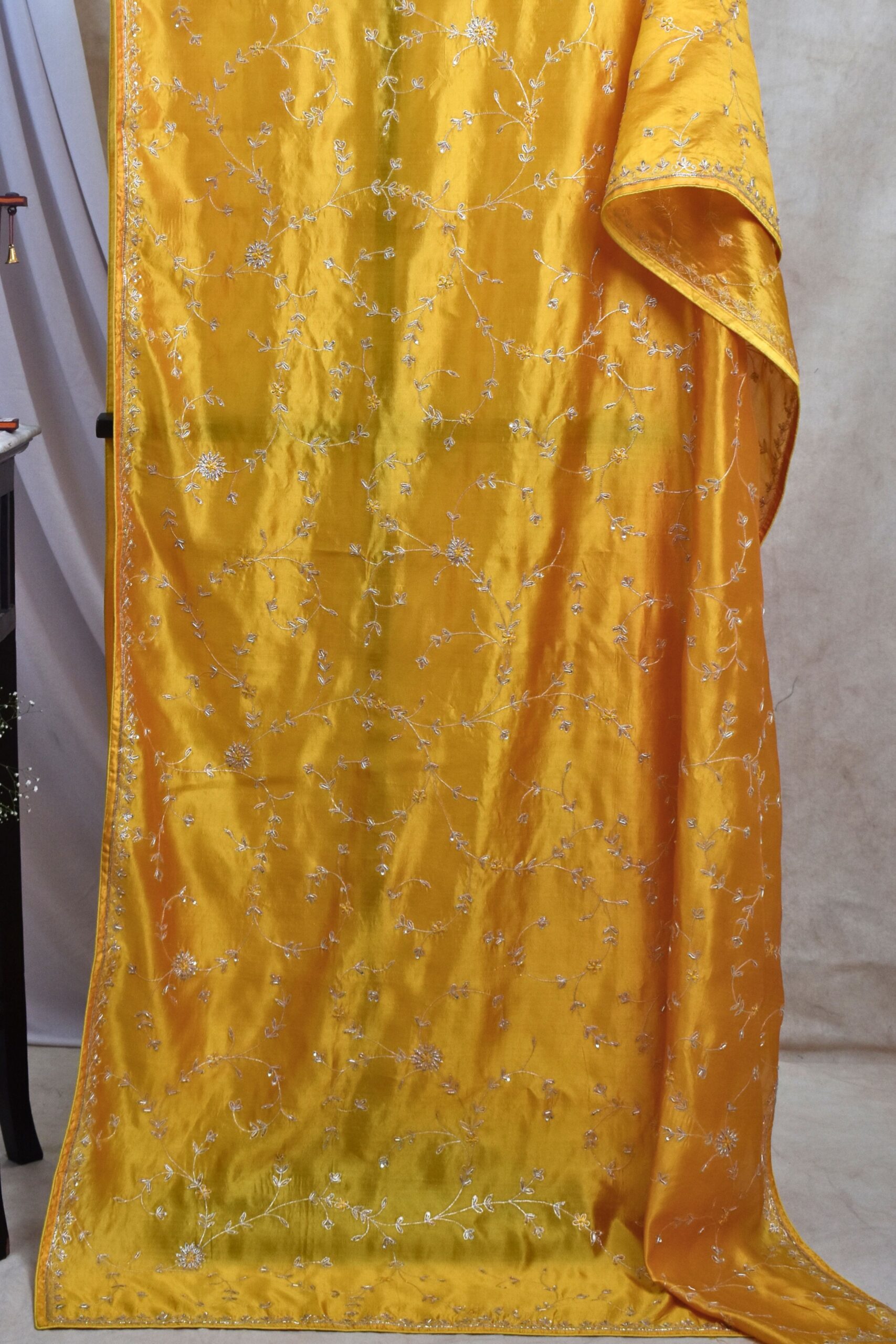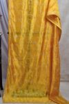 Drape yourself in pure elegance with our yellow luxurious Tussar silk saree, accentuated by exquisite hand pitai Zardosi embroidery. The natural texture of tussar silk paired with delicate detailing makes it a perfect ensemble for weddings, festive evenings, and grand celebrations. A true statement of timeless artistry and sophistication.