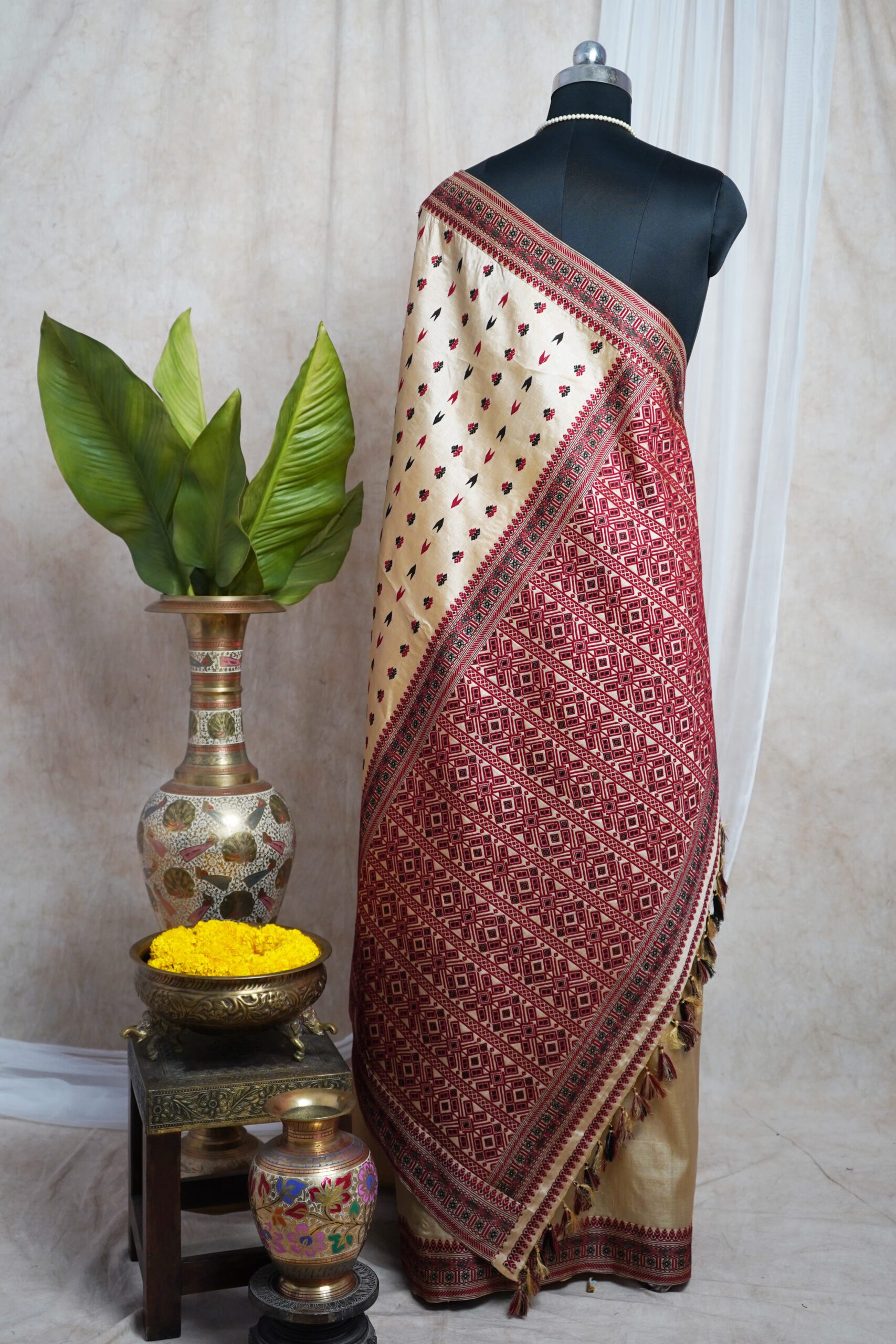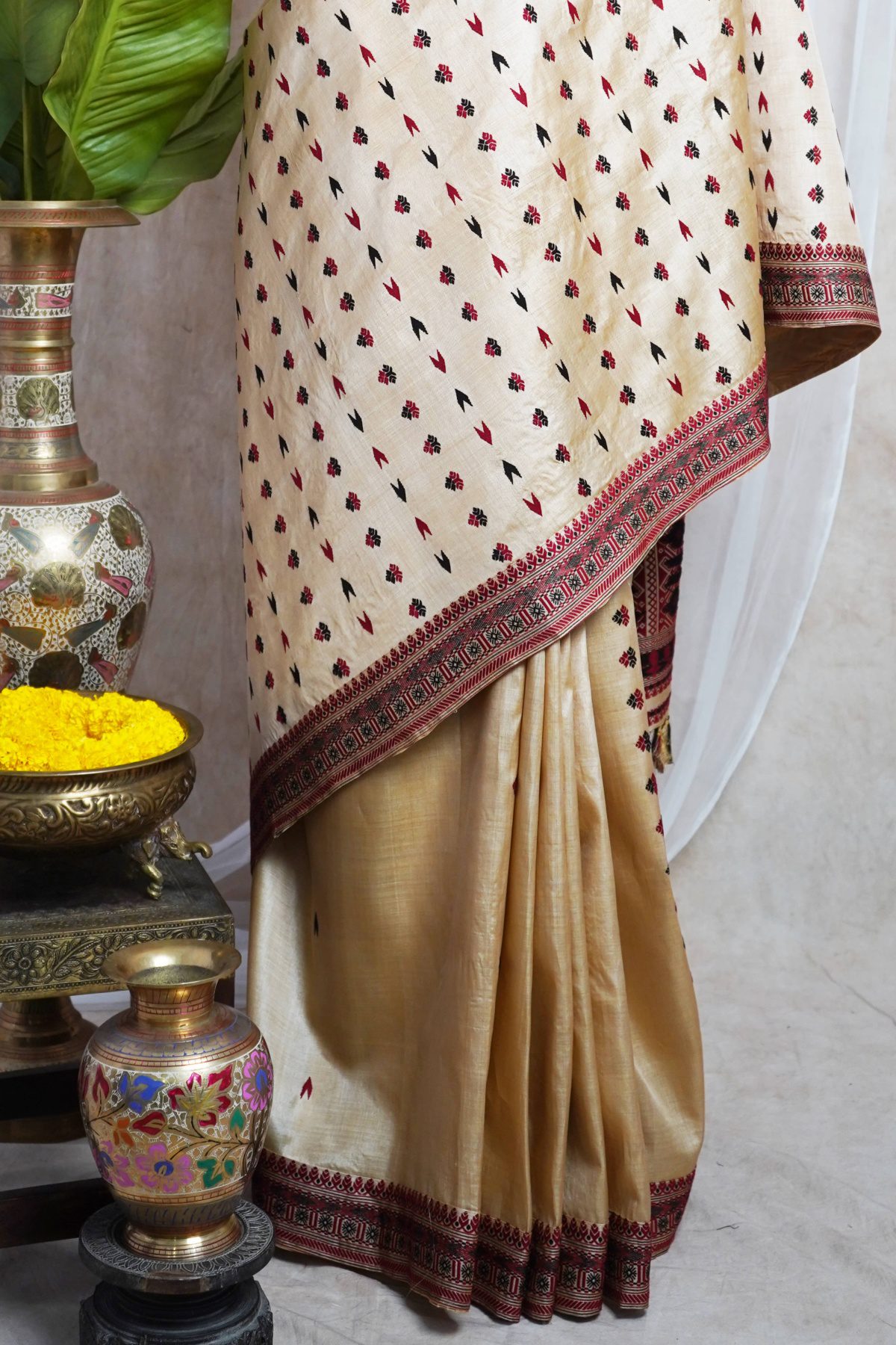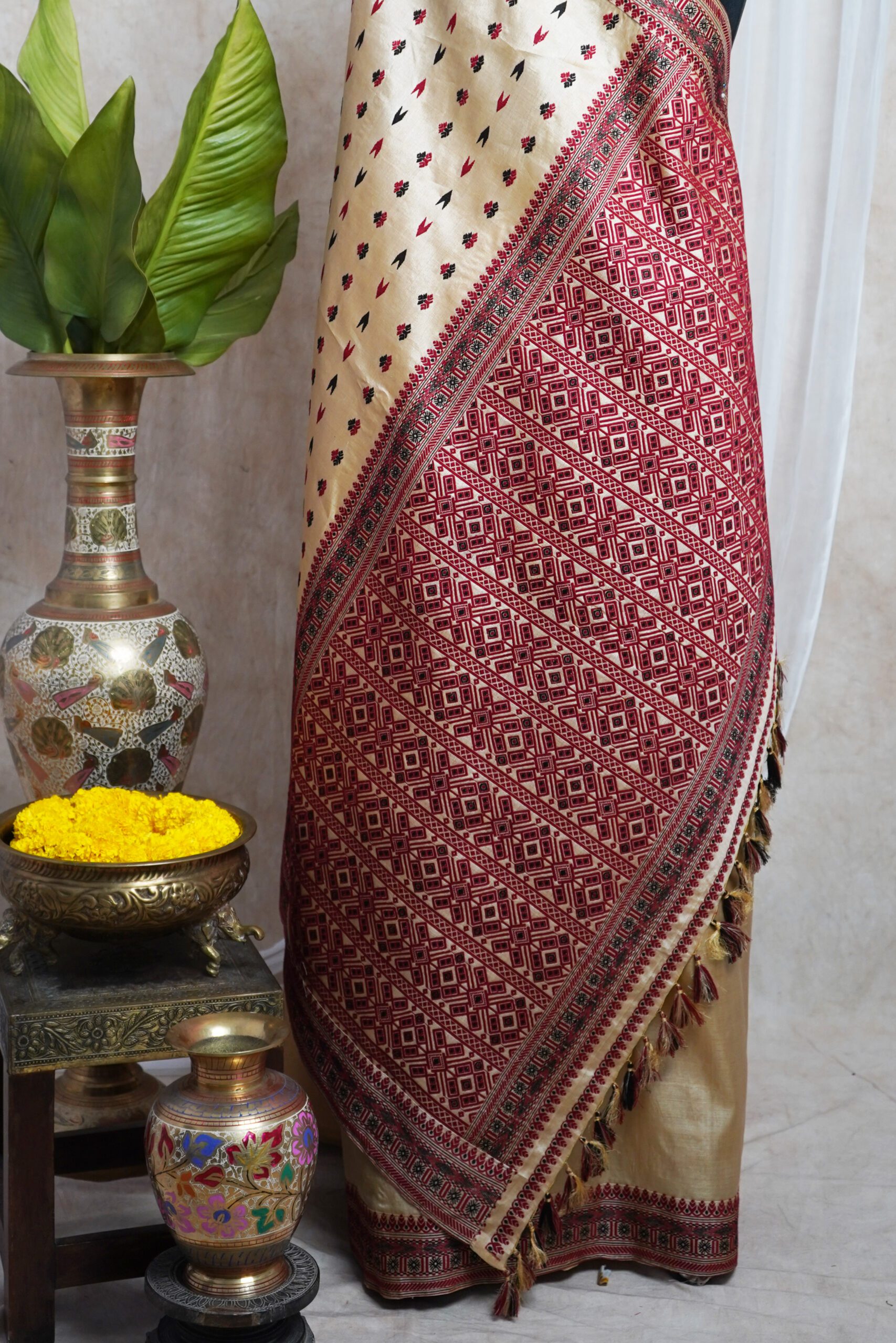 Woven with tradition and craftsmanship, this exquisite Assam saree in the shade of beige & cream is a tribute to the region’s rich textile heritage. Crafted from pure Tussar silk, it embodies the artistry that Assam’s weavers have perfected over generations.Add this timeless masterpiece to your collection — a true reflection of Assam’s enduring artistry