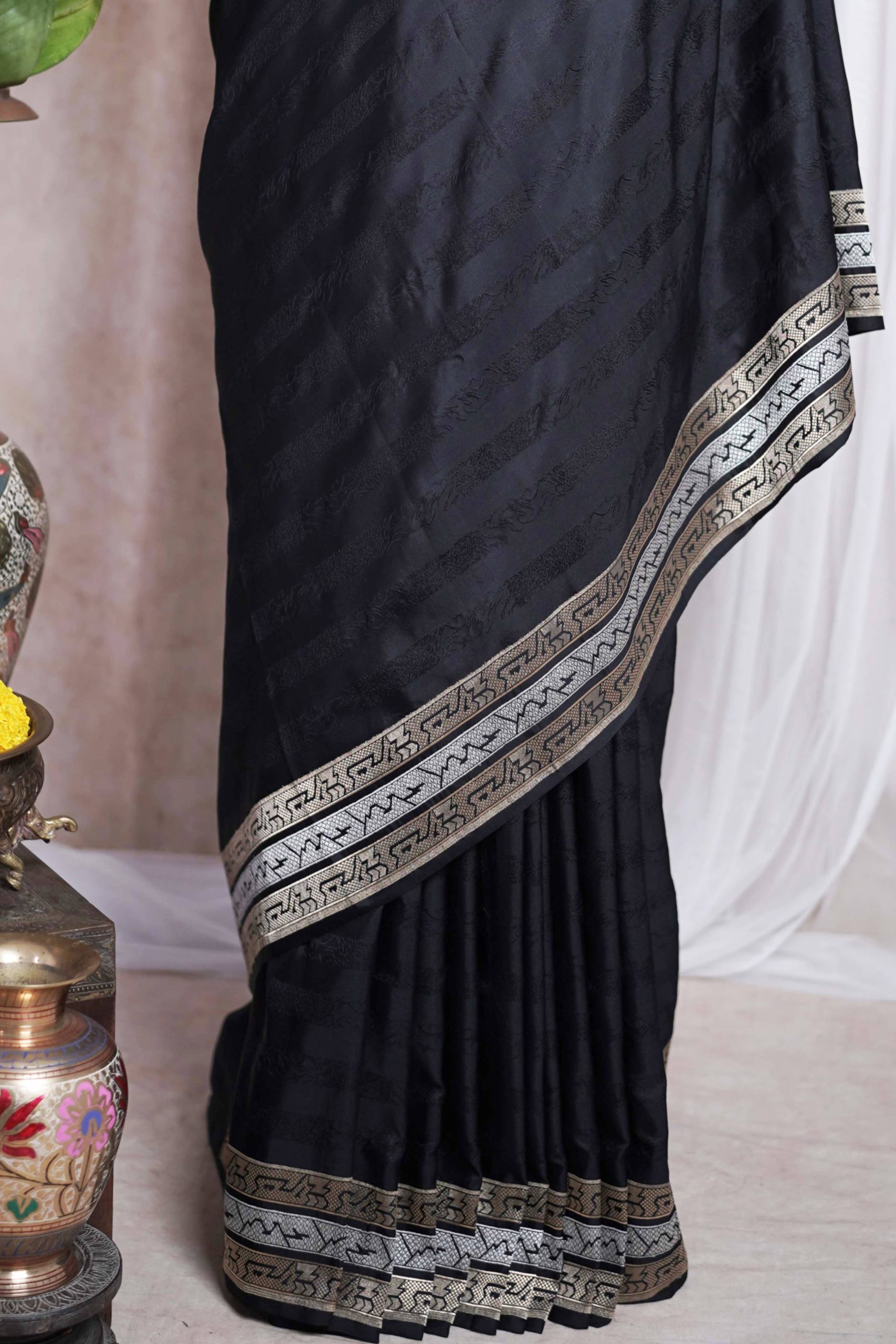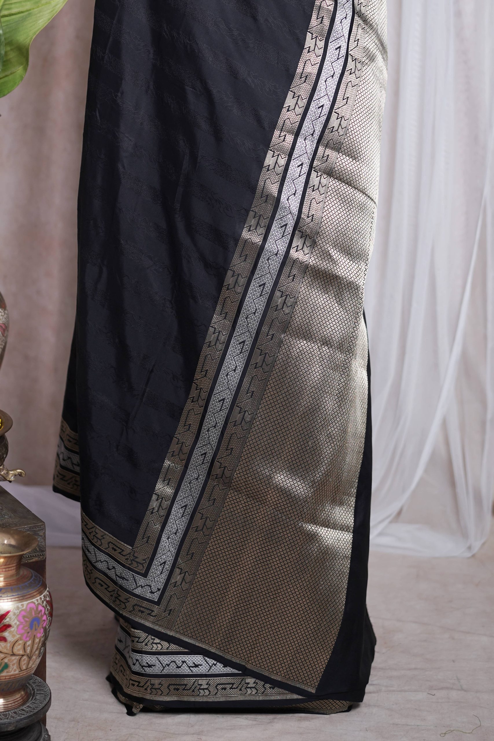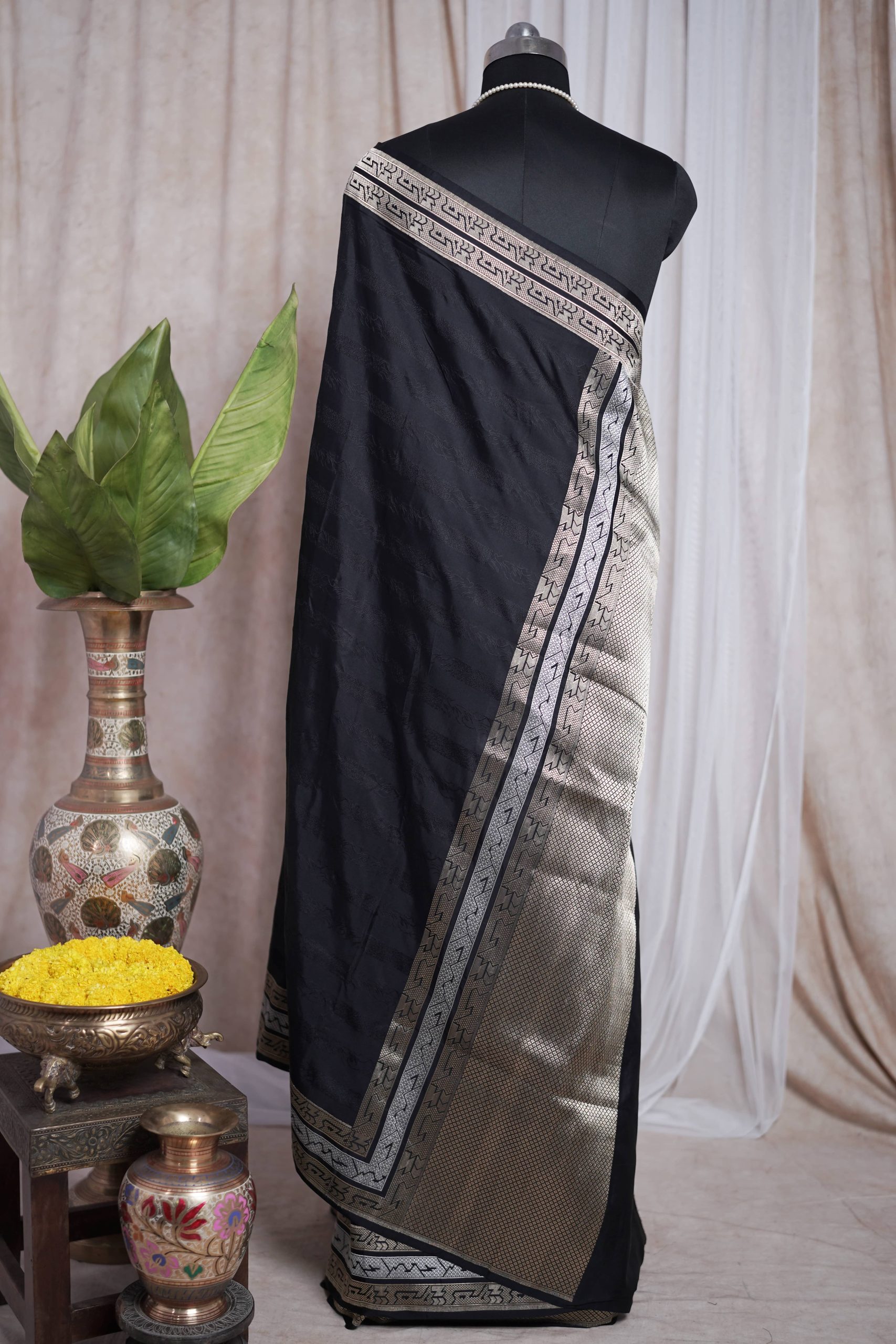 Experience timeless elegance with our handcrafted black Banarasi silk saree, showcasing intricate zari work on mashru silk . Inspired by the rich heritage of Varanasi, this saree features exquisite patterns that blend tradition with sophistication. Perfect for weddings and special occasions, it embodies grace and opulence.