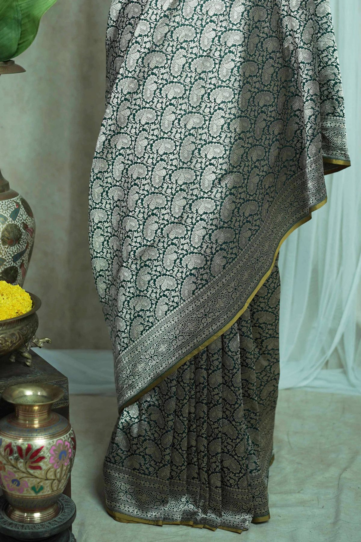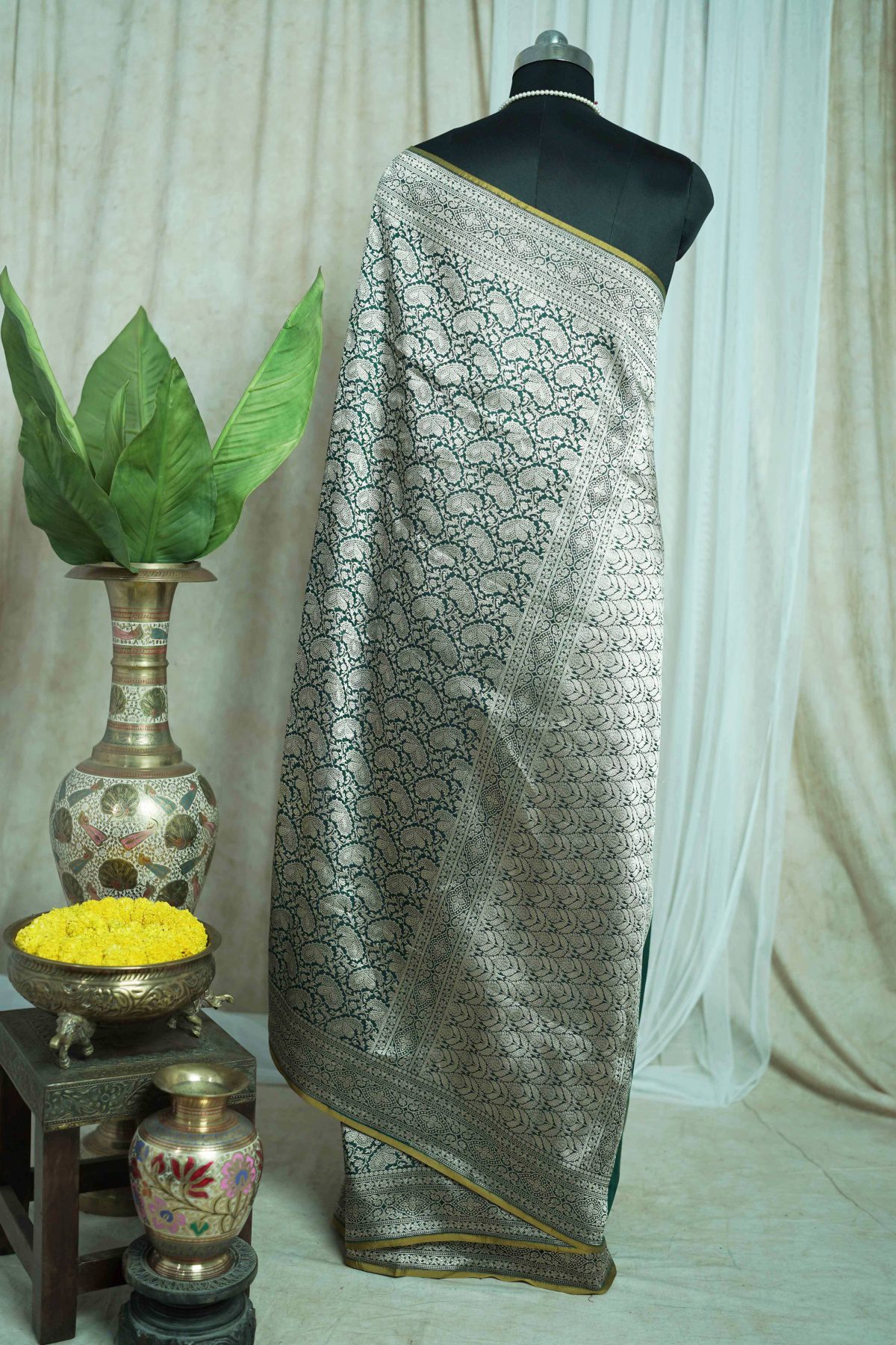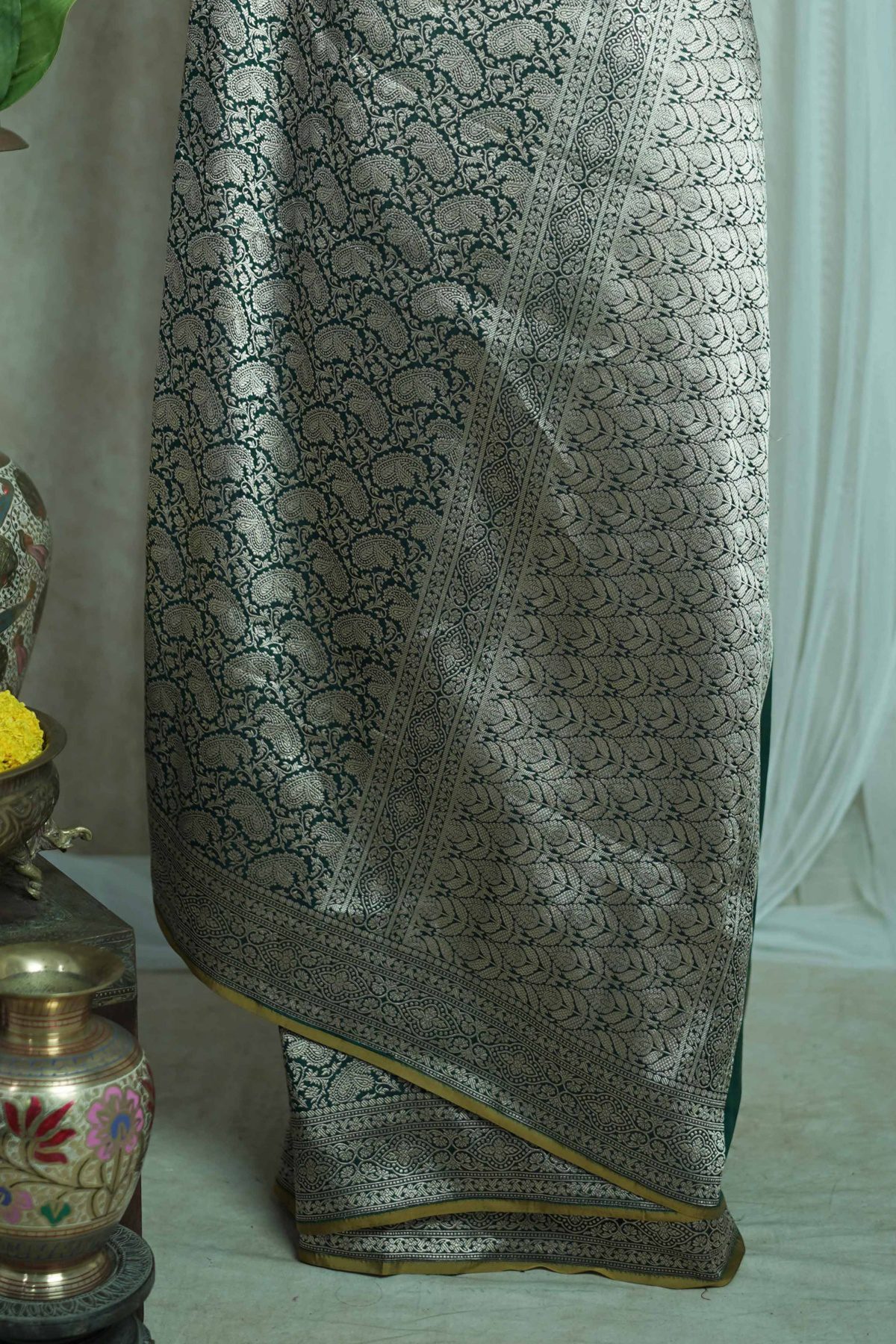 Experience timeless elegance with our handcrafted green Banarasi silk saree, showcasing intricate silver zari work on katan silk . Inspired by the rich heritage of Varanasi, this saree features exquisite patterns that blend tradition with sophistication. The yellow selvedge gives an unique vibrancy to the very look of the saree. Perfect for weddings and special occasions, it embodies grace and opulence.
