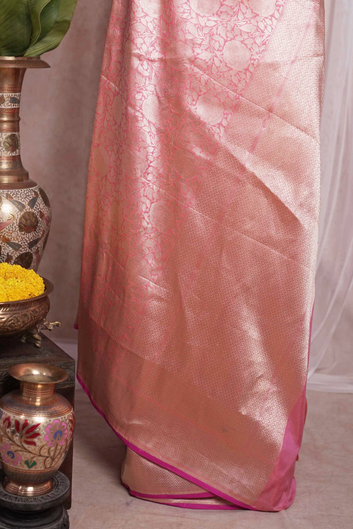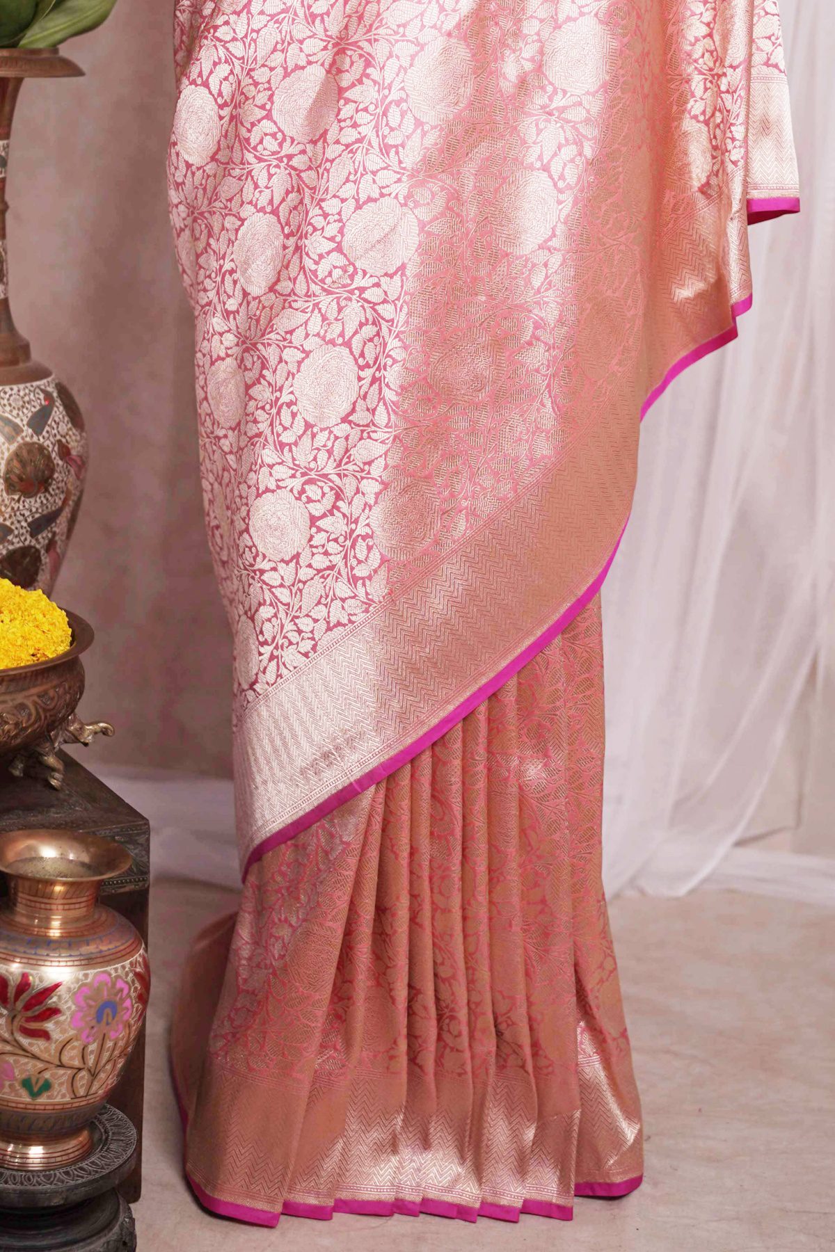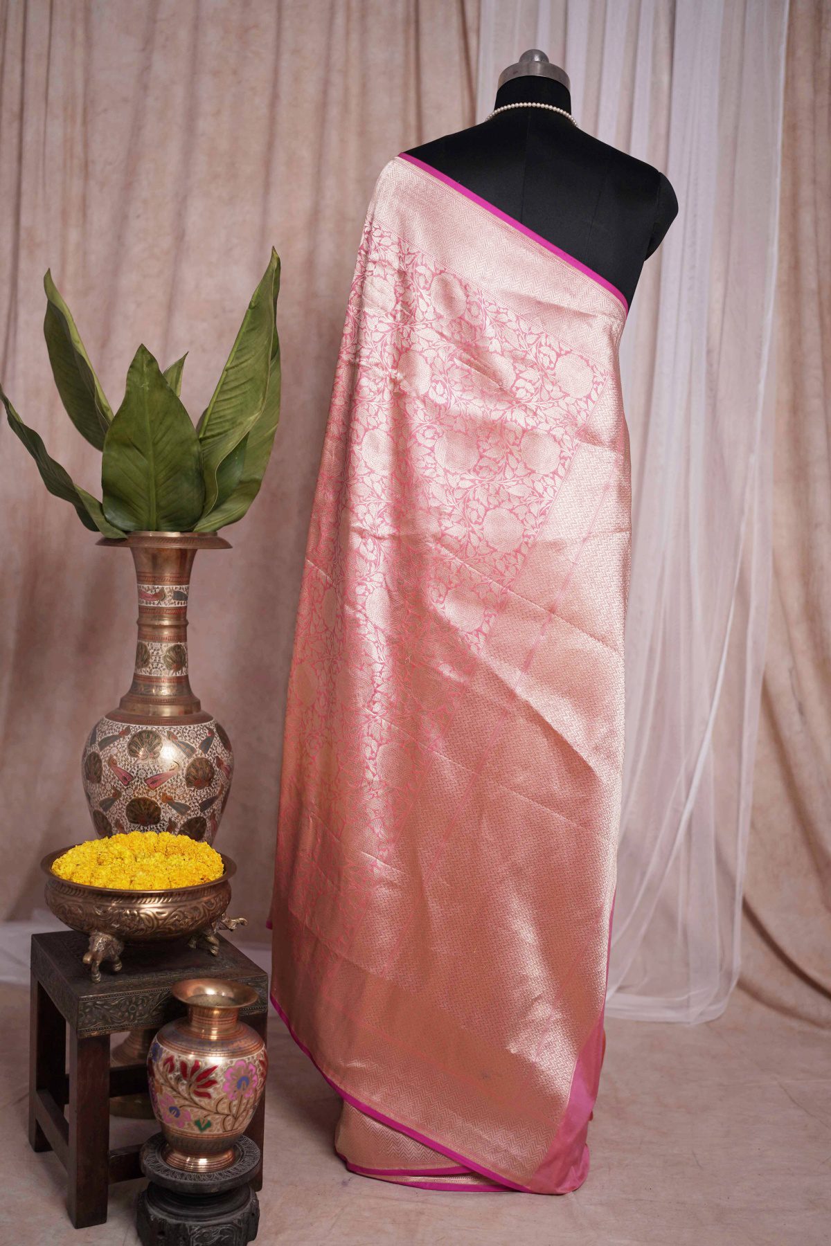 Experience timeless elegance with our handcrafted light pink Banarasi silk saree, showcasing intricate zari work on katan silk . Inspired by the rich heritage of Varanasi, this saree features exquisite patterns that blend tradition with sophistication. The pink selvedge gives an unique vibrancy to the very look of the saree. Perfect for weddings and special occasions, it embodies grace and opulence.