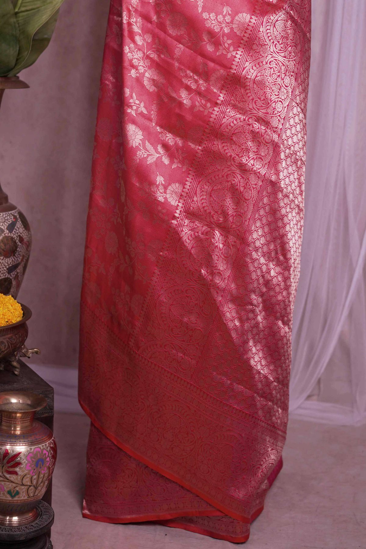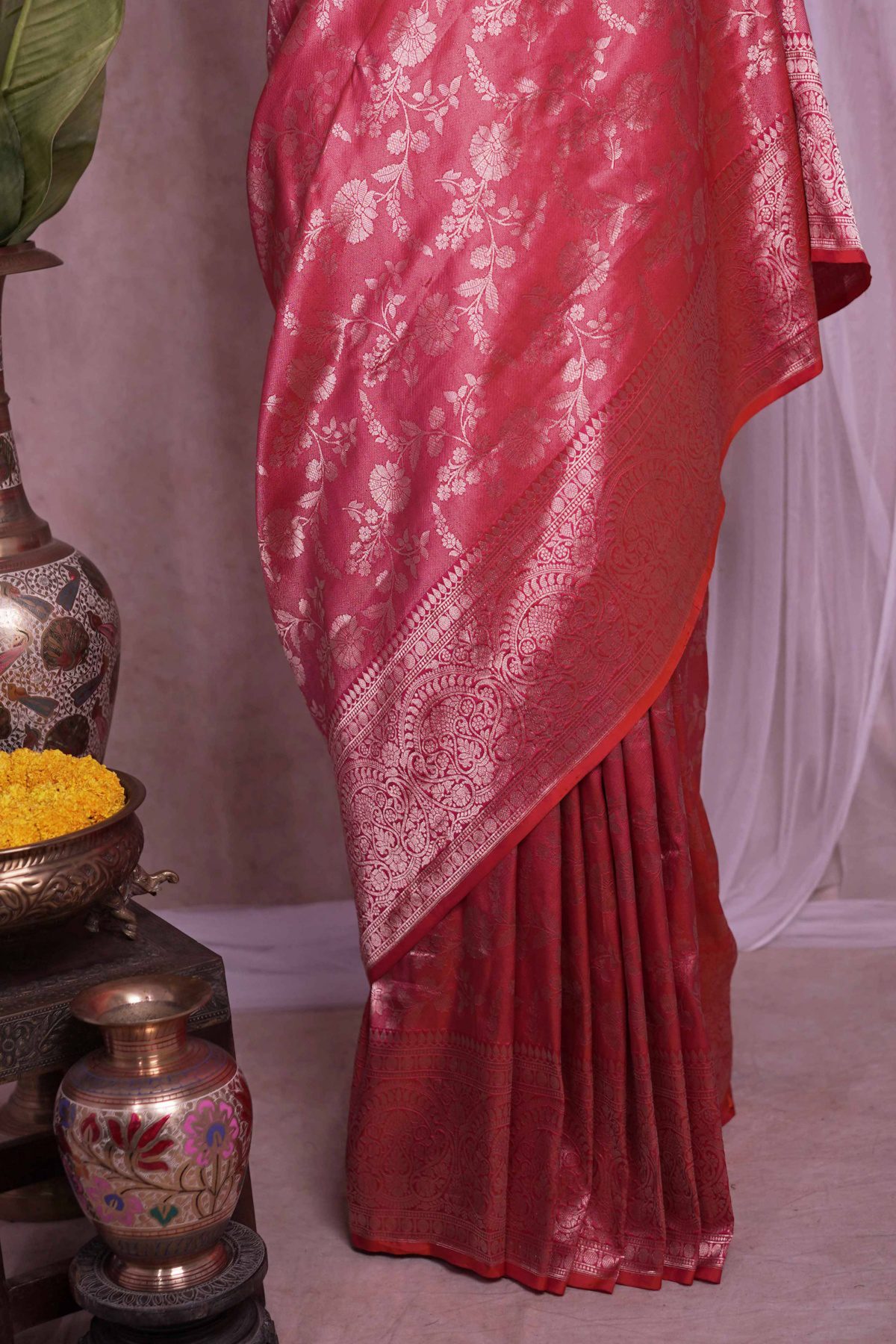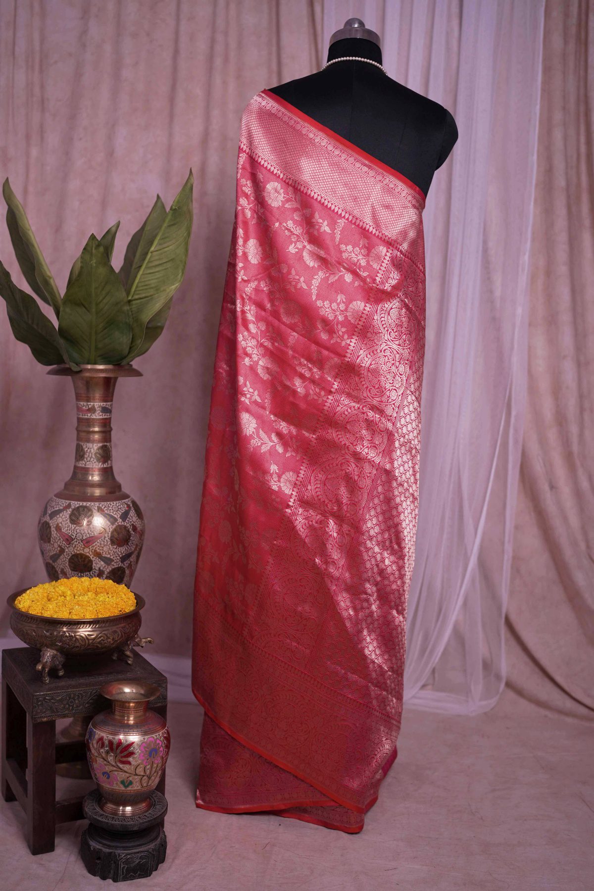 Experience timeless elegance with our handcrafted orange & pink dual toned Banarasi silk saree, showcasing intricate floral motif zari work on katan silk . Inspired by the rich heritage of Varanasi, this saree features exquisite patterns that blend tradition with sophistication. The red selvedge gives an unique vibrancy to the very look of the saree. Perfect for weddings and special occasions, it embodies grace and opulence.