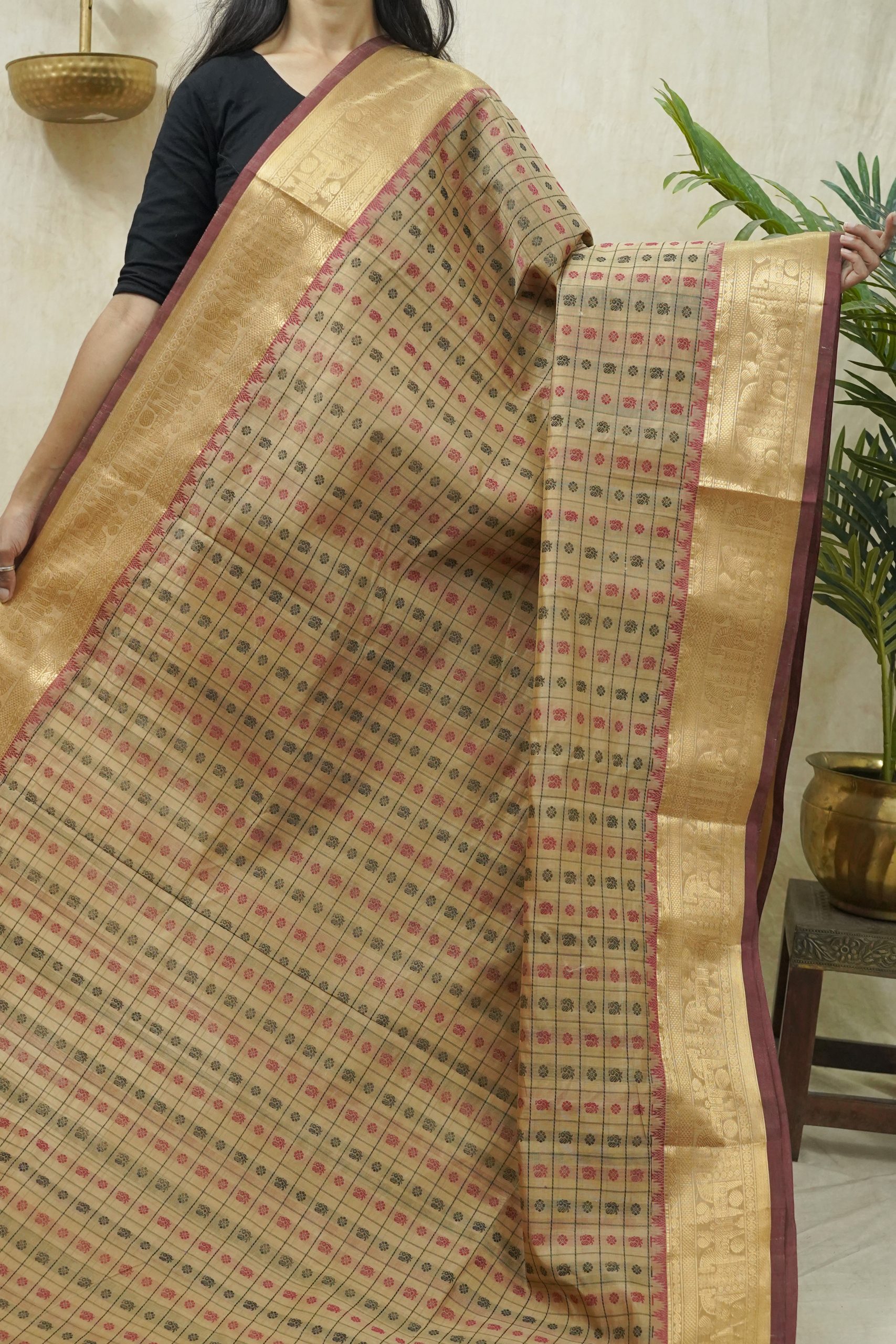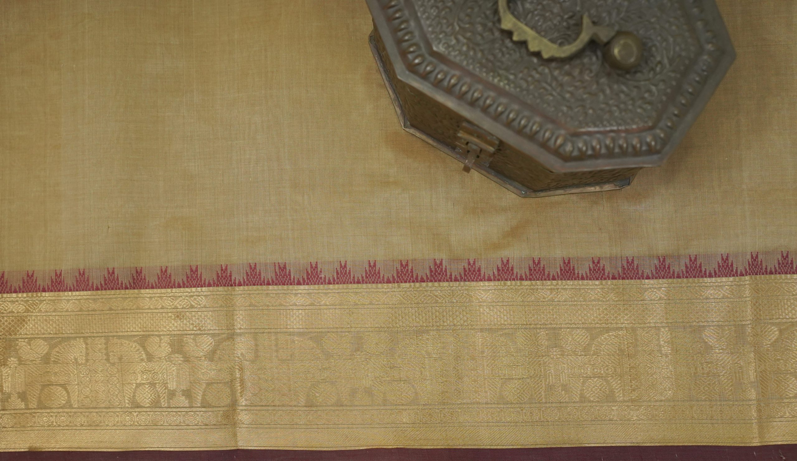 Introducing our vibrant Kanchipuram sico saree in a stunning beige colour featuring elegant golden zari border. The pallu is embellished with traditional golden zari. This provides a striking contrast, enhancing the saree’s grandeur.