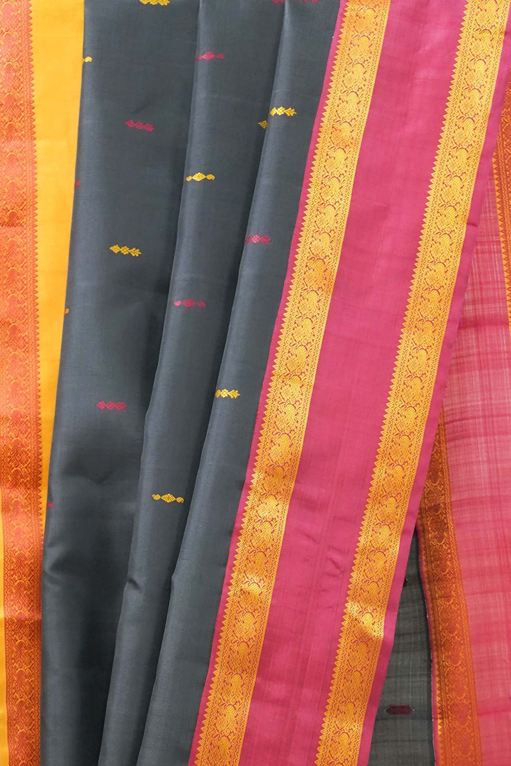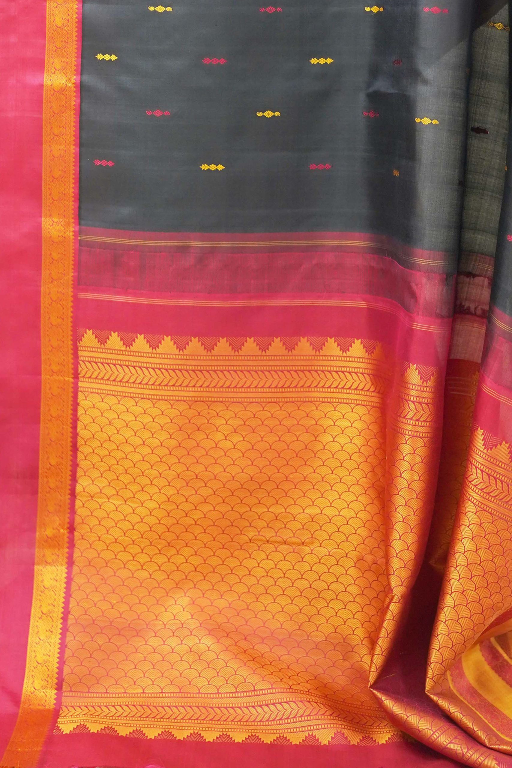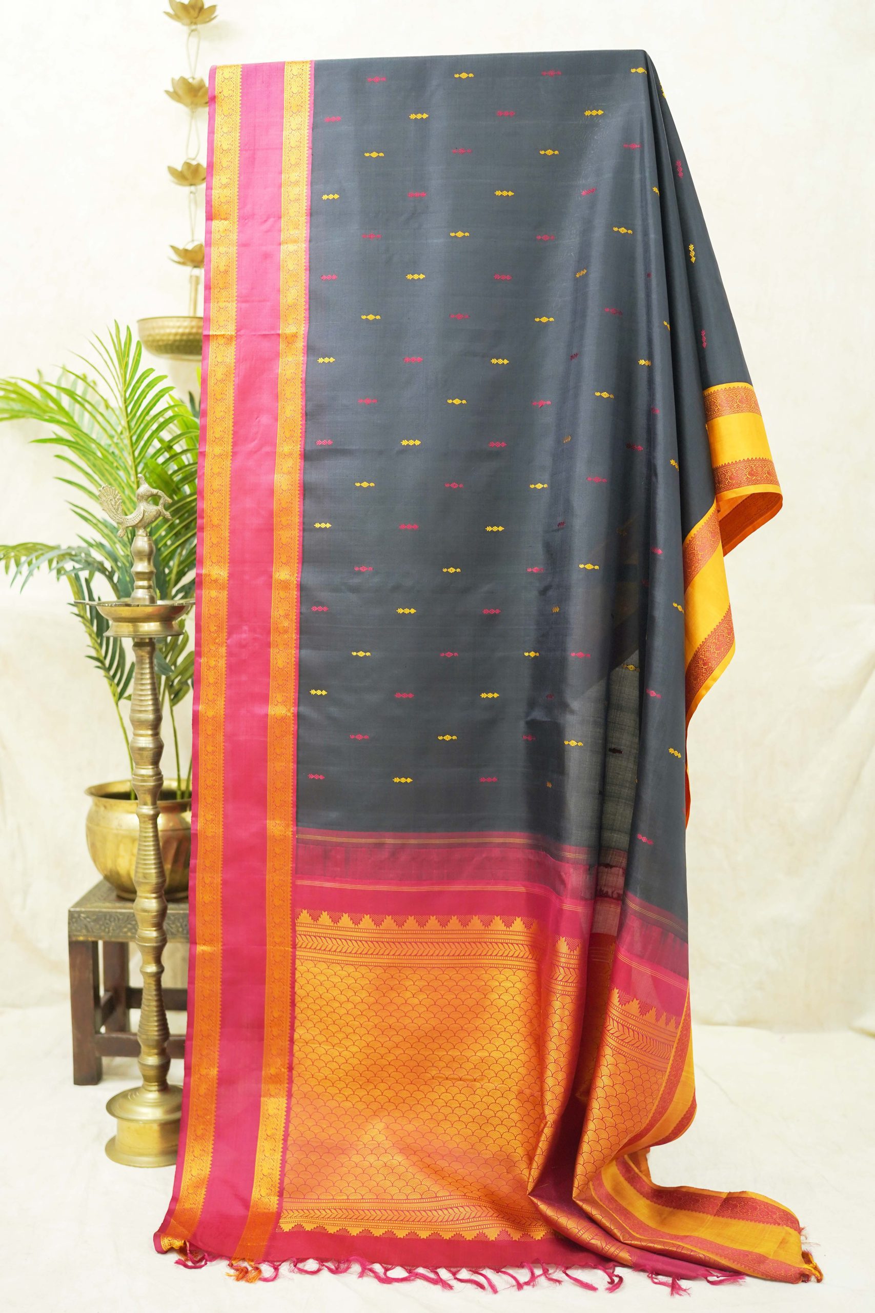 Our exquisite black Kanjeevaram silk saree is designed with floral motif all across the body in thread work . The pallu is adorned with intricate thread work, adding a unique and charming touch. The red coloured border adds a striking contrast to the very look of the saree.