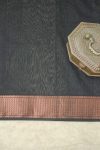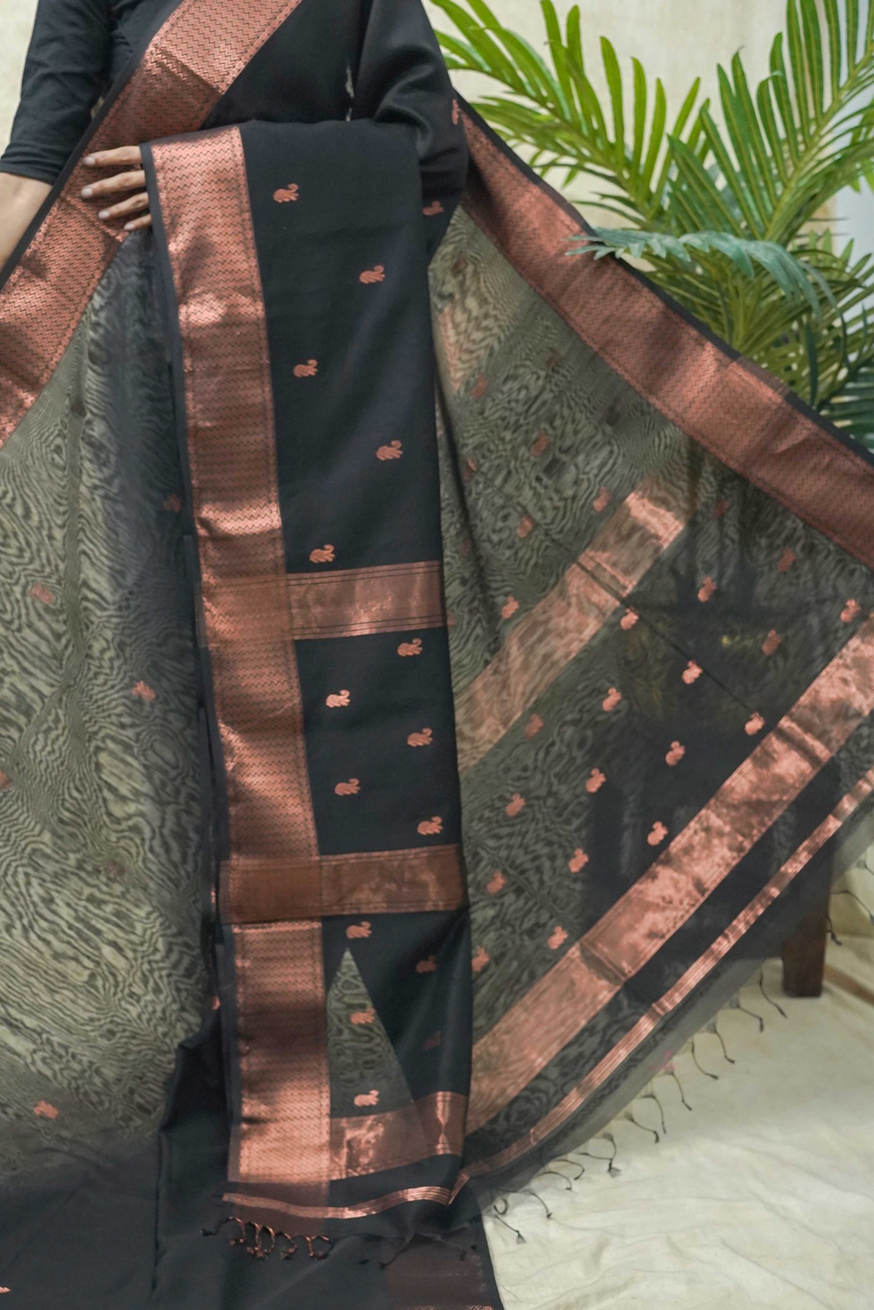 Elevate your ethnic wardrobe with our black Maheshwari sico saree, featuring intricate woven butis, a classic Narmada copper zari border, and a striking stripped copper zari palla. This saree beautifully blends traditional artistry with modern elegance, making it an ideal choice for festive celebrations and special occasions.
