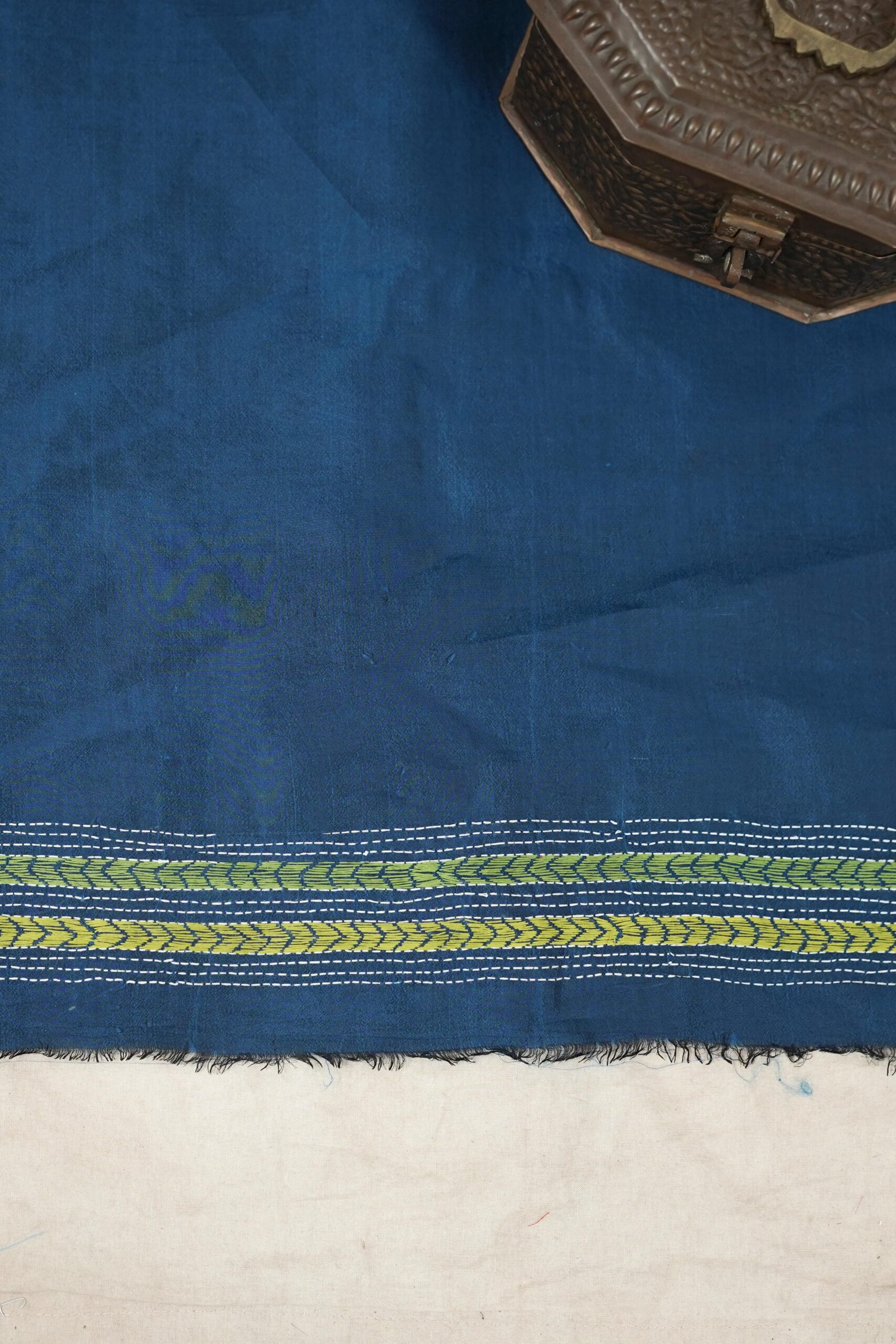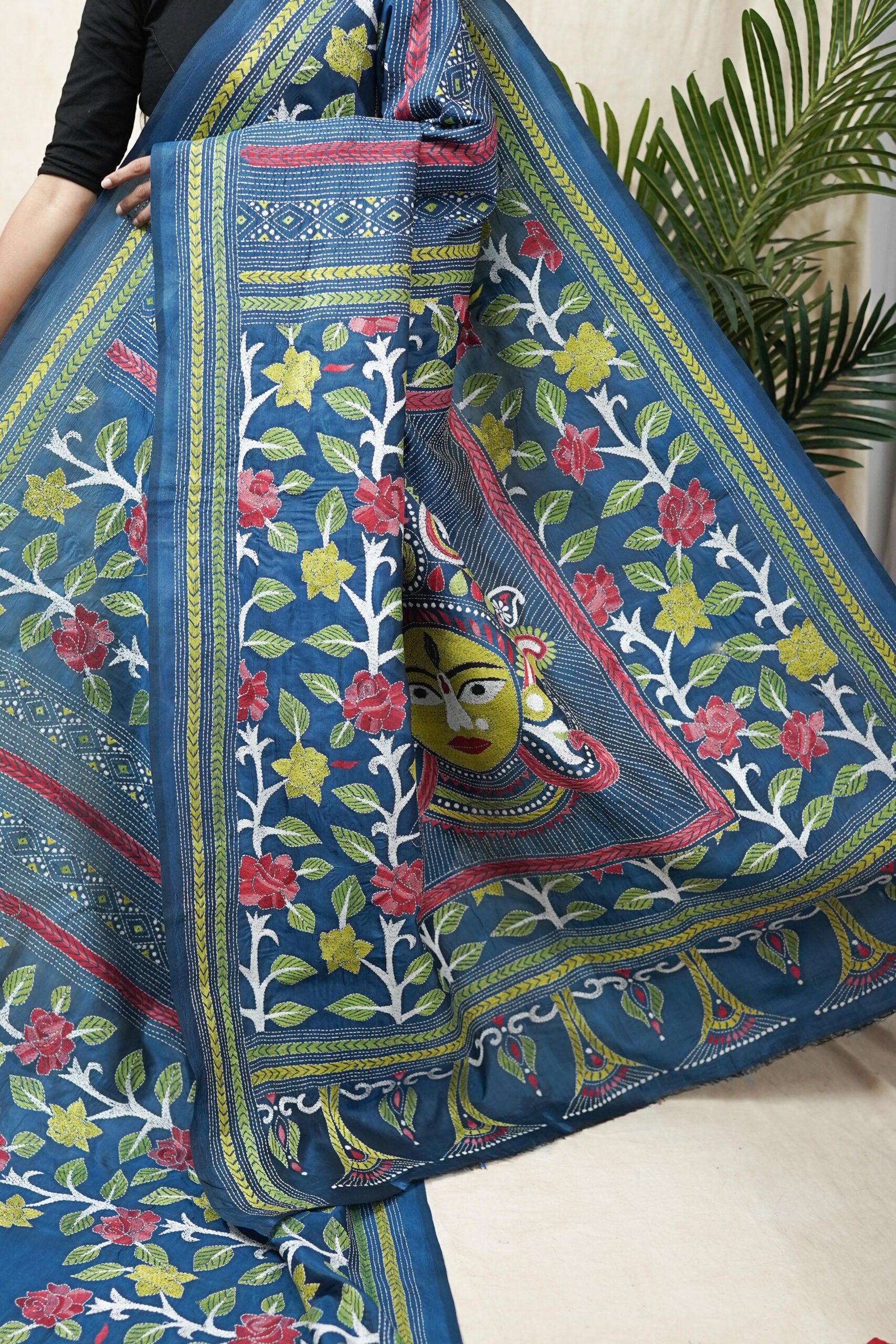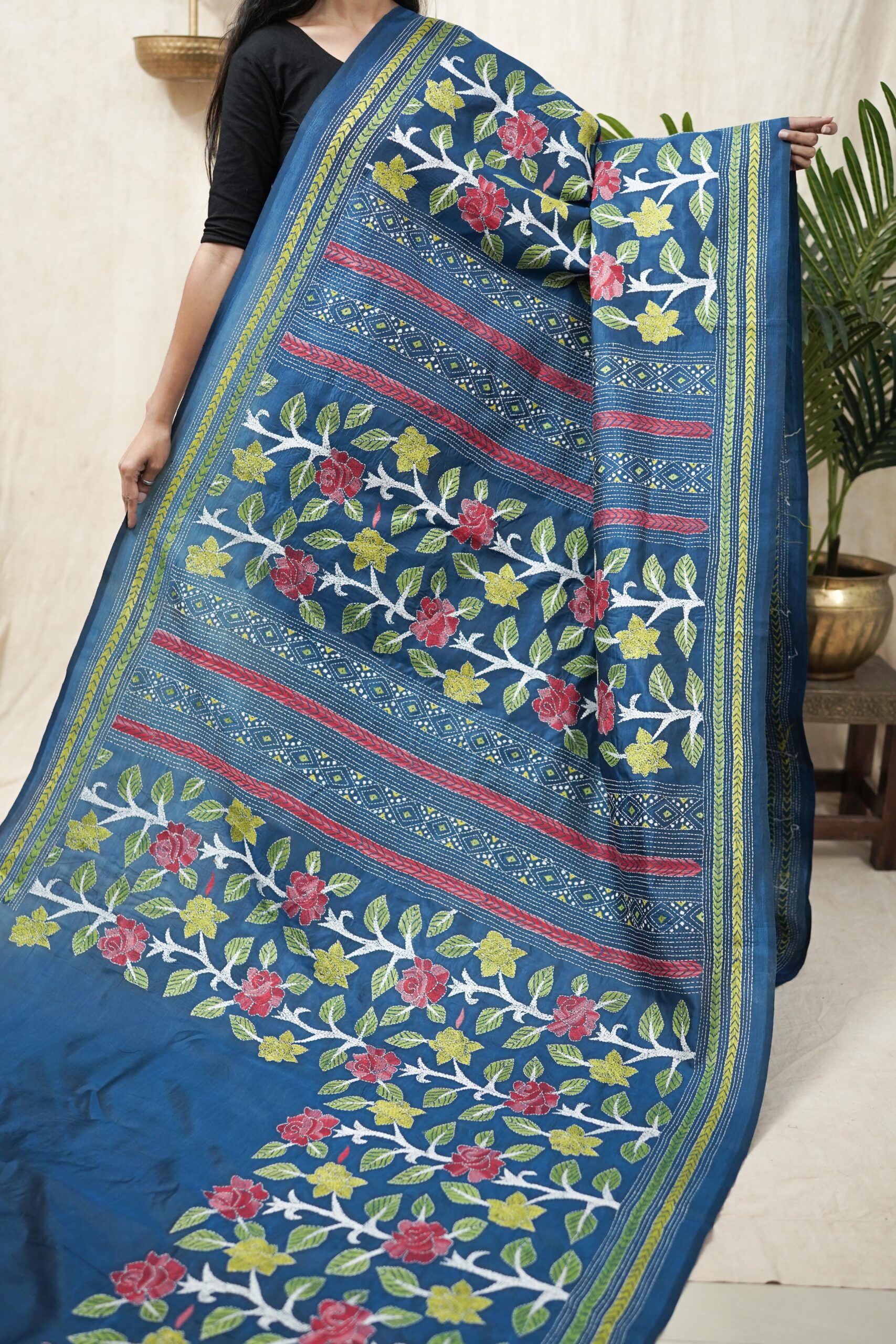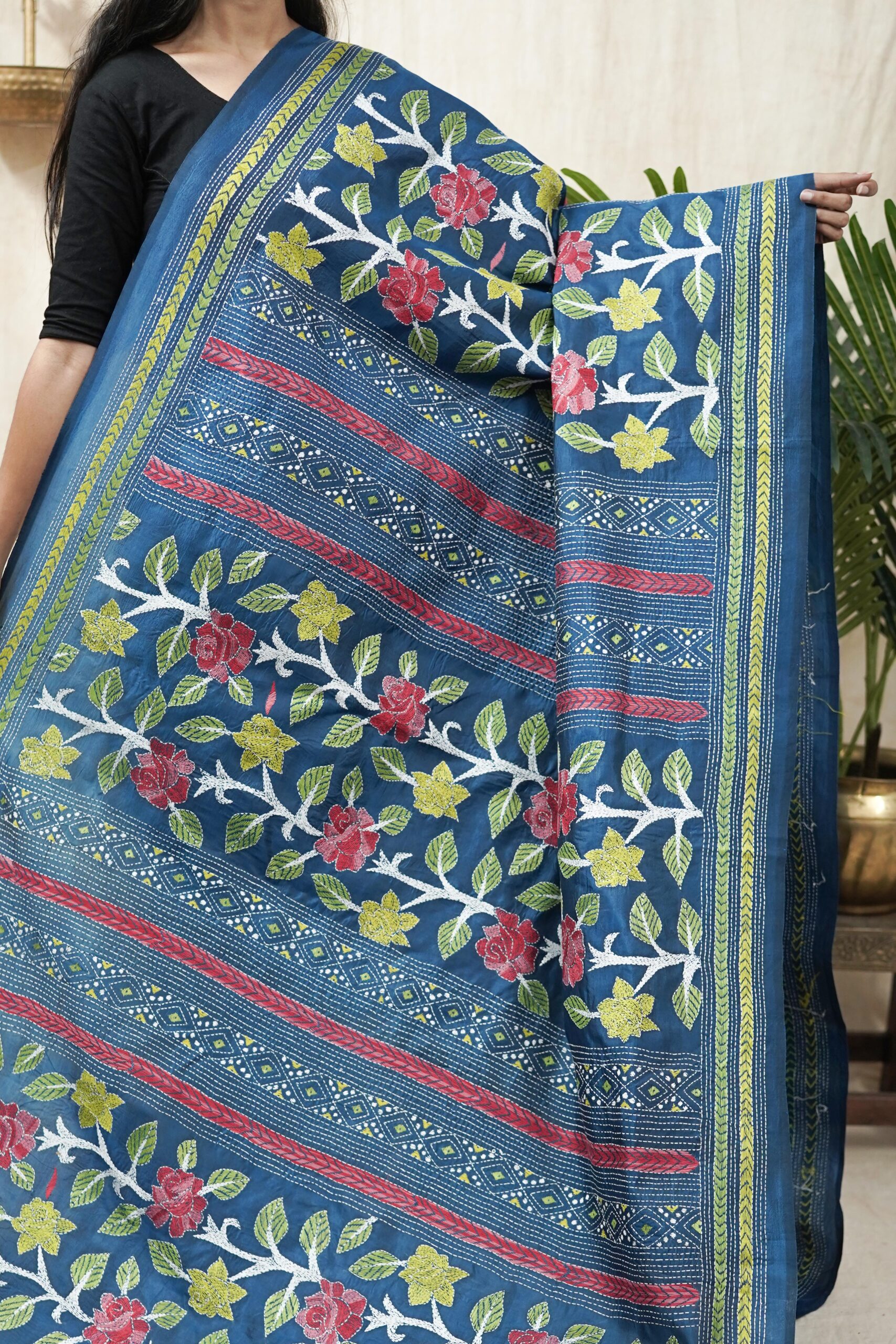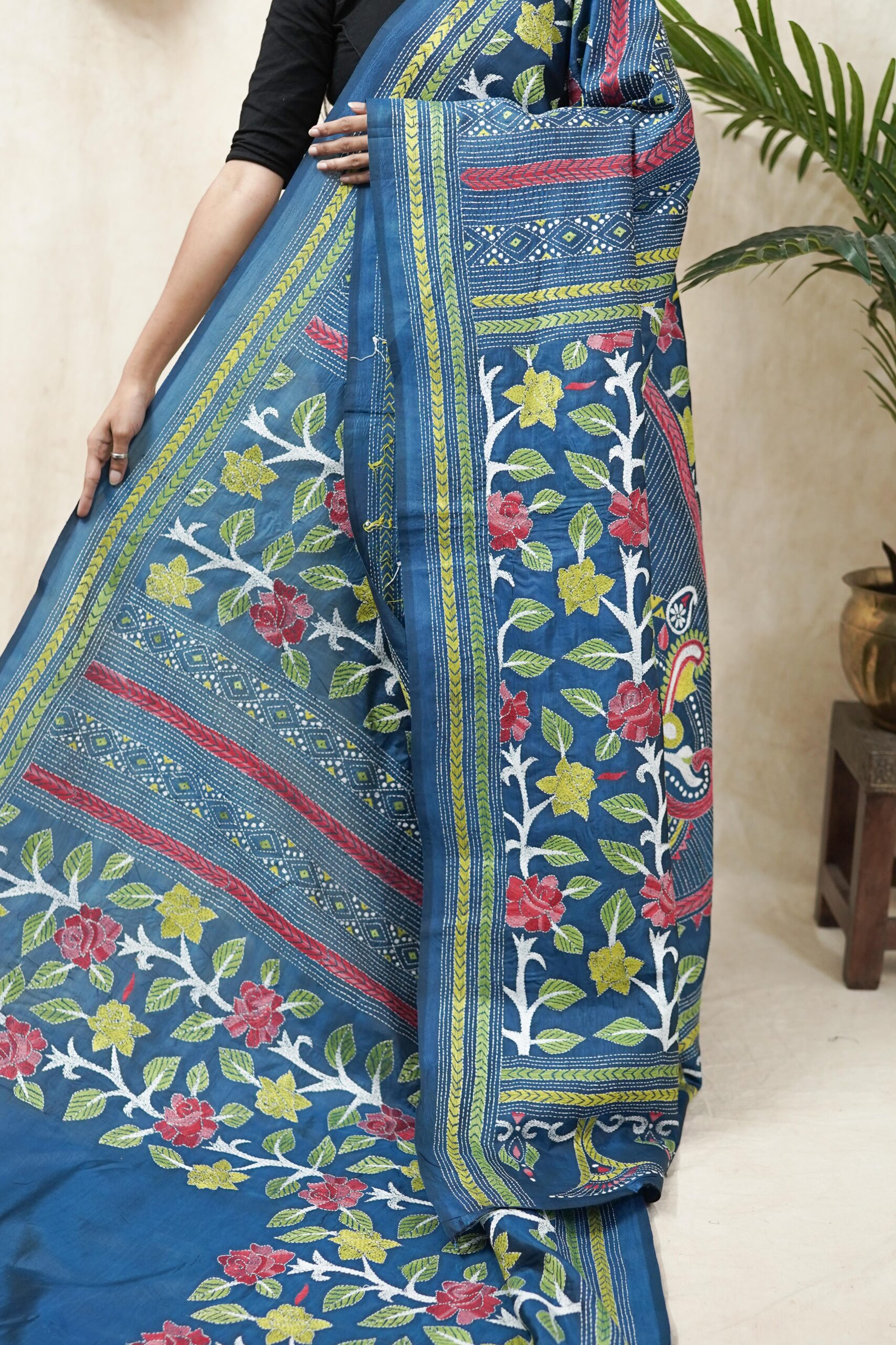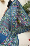 Our exquisite tussar silk saree in the shade of blue is adorned with delicate Kantha hand embroidery, featuring intricate motifs that reflect the rich craft heritage of Nanoor, West Bengal. The natural texture of tussar blends beautifully with the fine stitches, creating an elegant drape perfect for cultural gatherings, festive occasions, or timeless everyday grace.