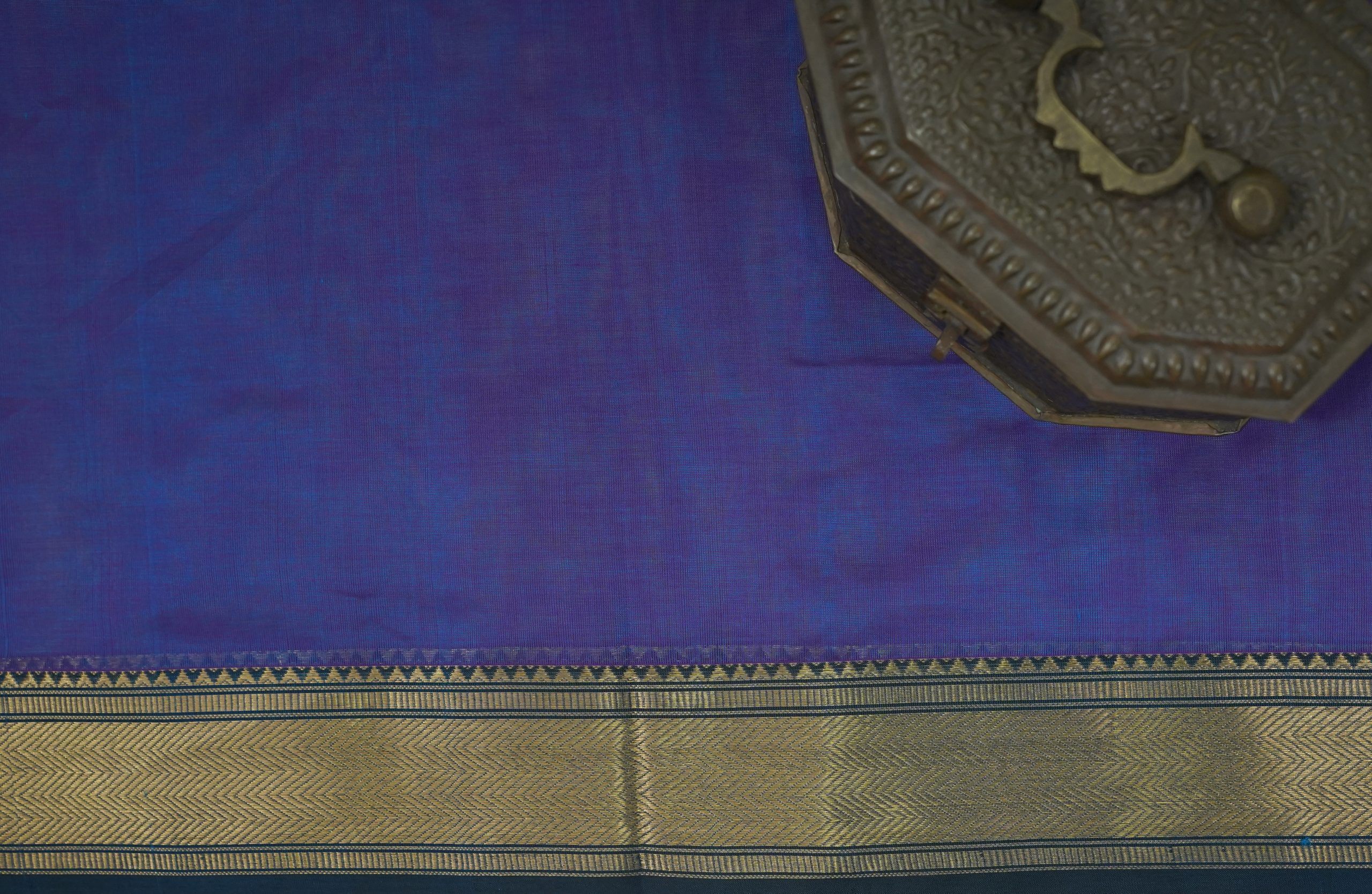Introducing our vibrant Kanchipuram sico saree in a stunning blue-pink dual tone, featuring elegant golden zari in prussian blue coloured border. The pallu is embellished with traditional golden zari. This provides a striking contrast, enhancing the saree’s grandeur.