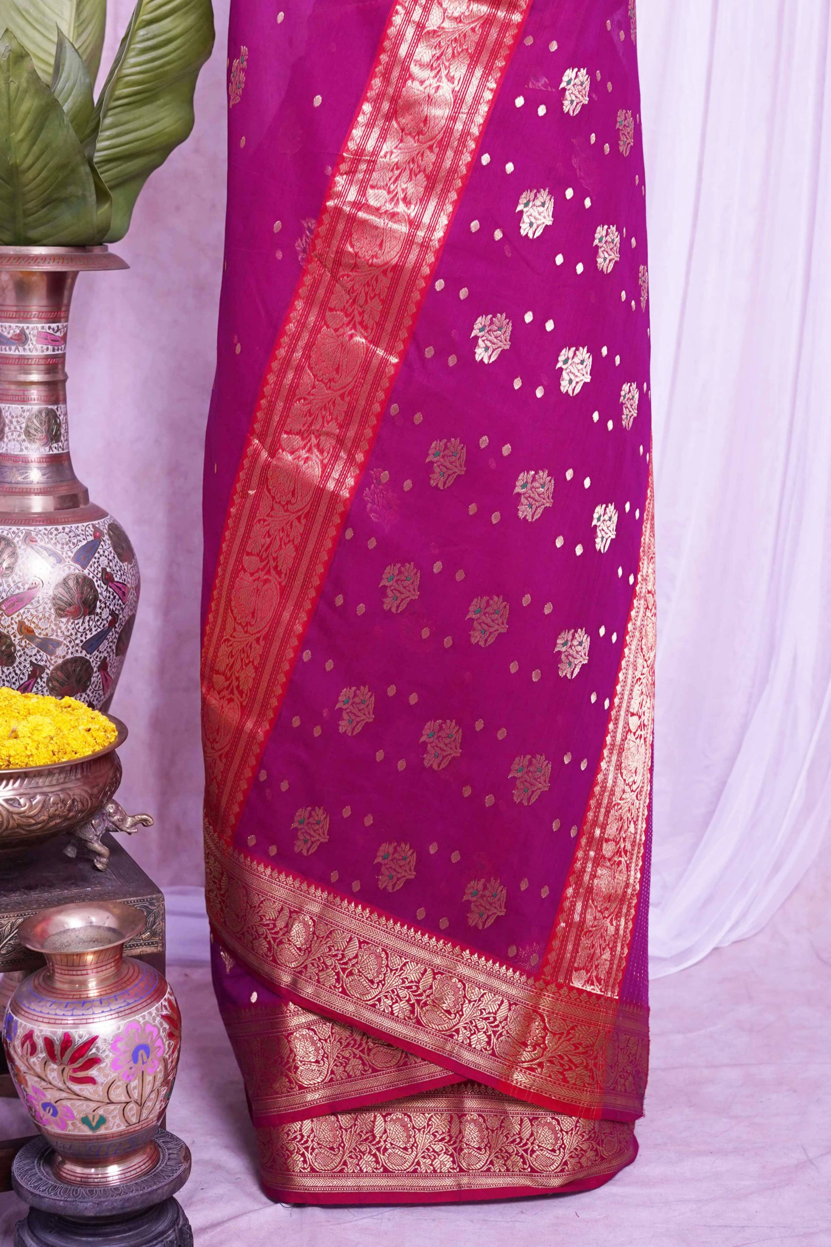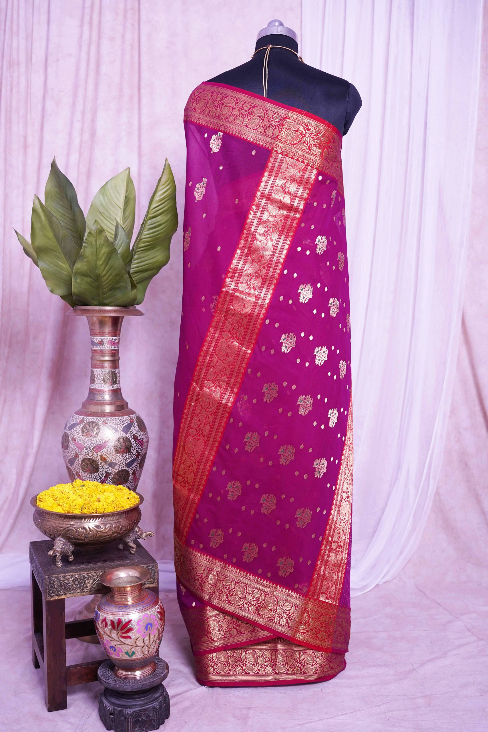 This Chanderi dark purple silk cotton saree embodies elegance and royalty, with delicate floral designs that shimmer with timeless beauty. Perfect for festive occasions or any event where you wish to shine with regal charm.