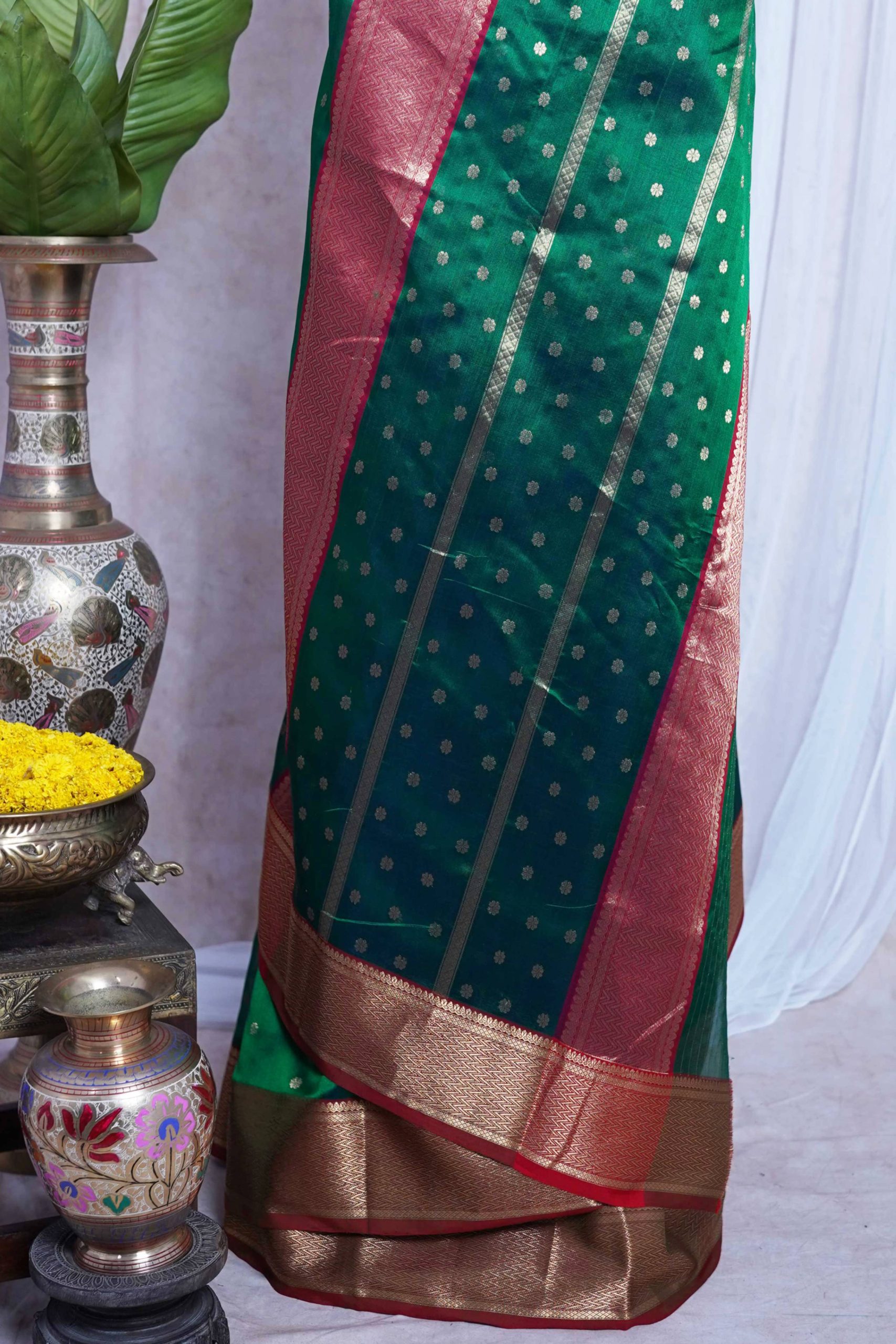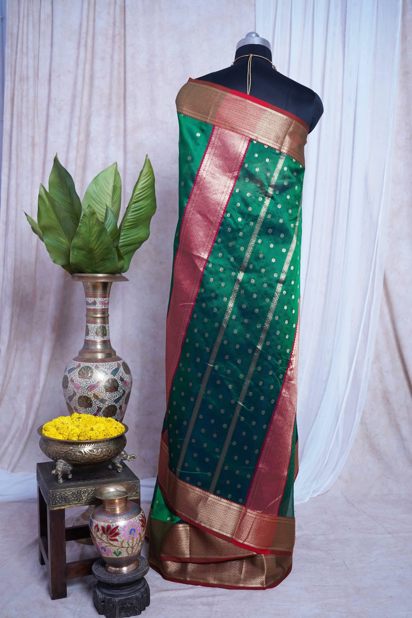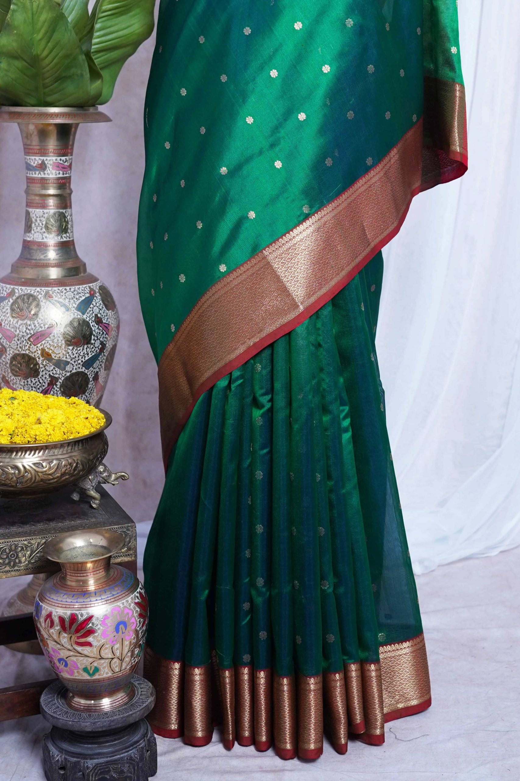 This Chanderi green silk saree embodies elegance and royalty, with delicate small butis all across that shimmer with timeless beauty. Perfect for festive occasions or any event where you wish to shine with regal charm.
