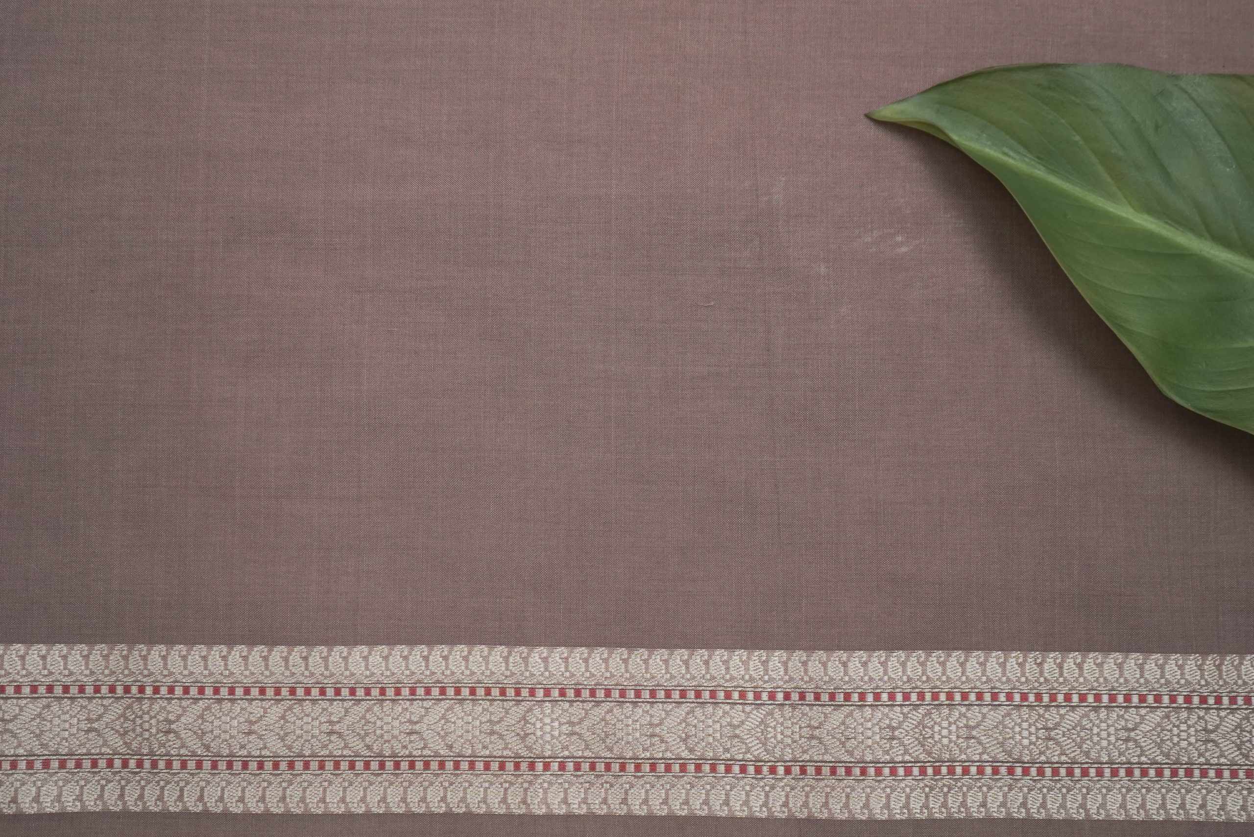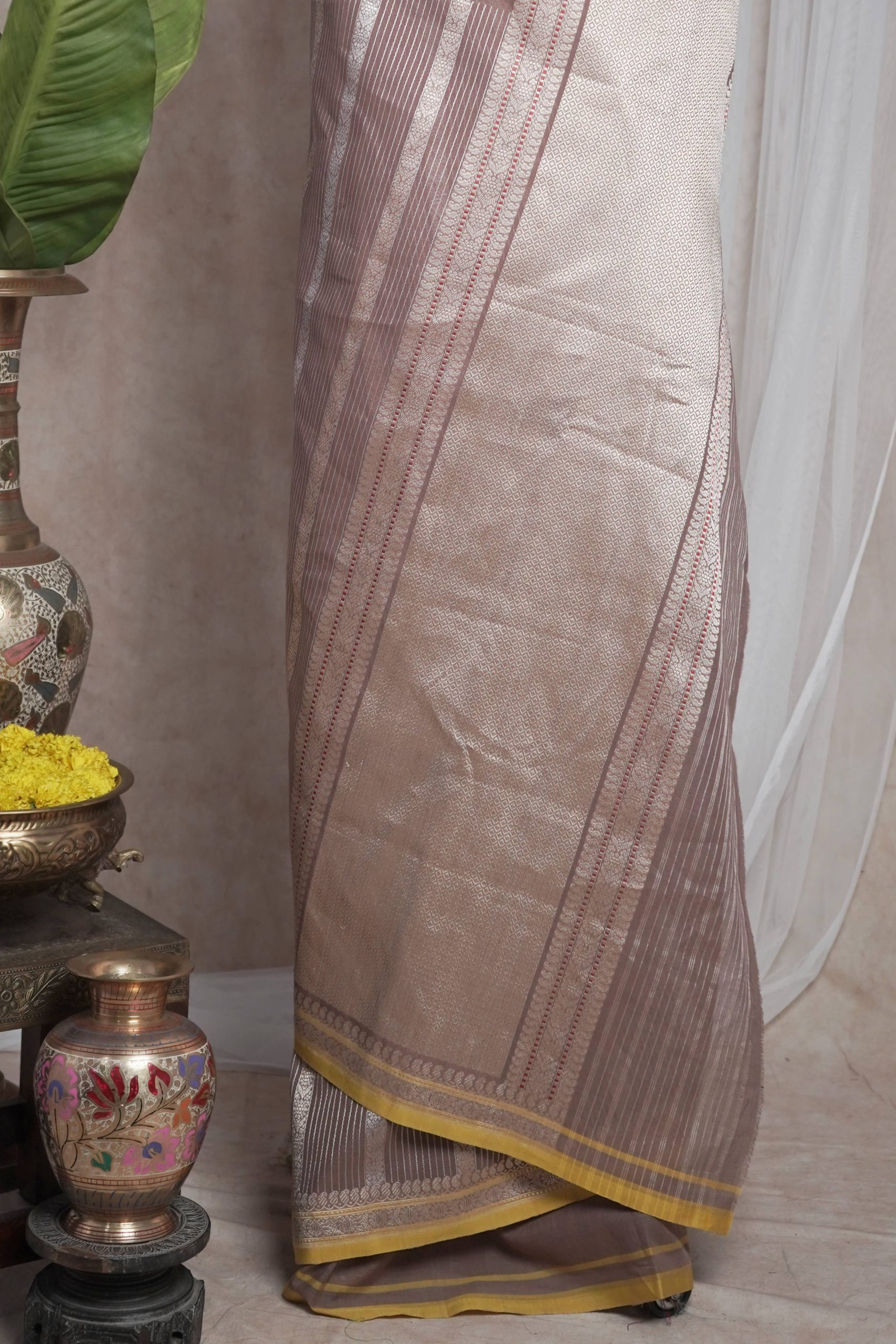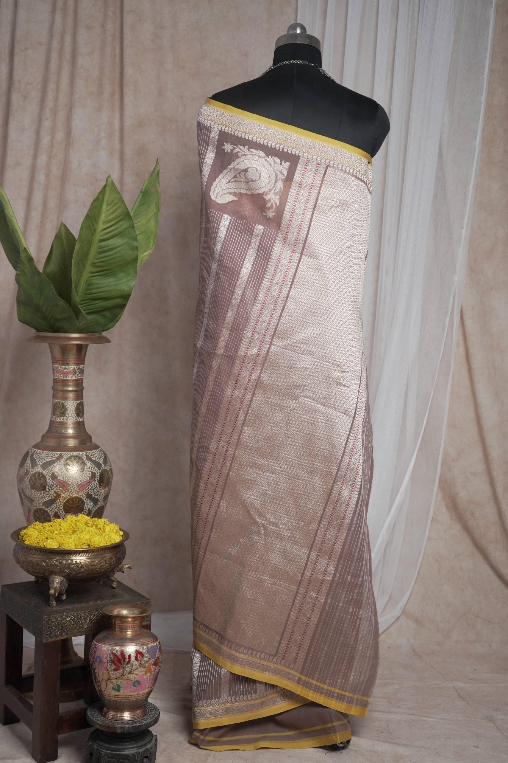Discover the grace of beigish brown cotton Banarasi sarees, where elegance meets comfort. The highlight of the saree is the intricate stripes in thread work all across and the delicate beige colored thread work in the border and pallu. The yellow coloured selvedge gives a contrasting edge to the look the saree itself. The saree blended with the softness of cotton with the intricate craftsmanship of Banaras are perfect for both festive occasions and everyday elegance. Embrace timeless style with a touch of heritage in every drape.