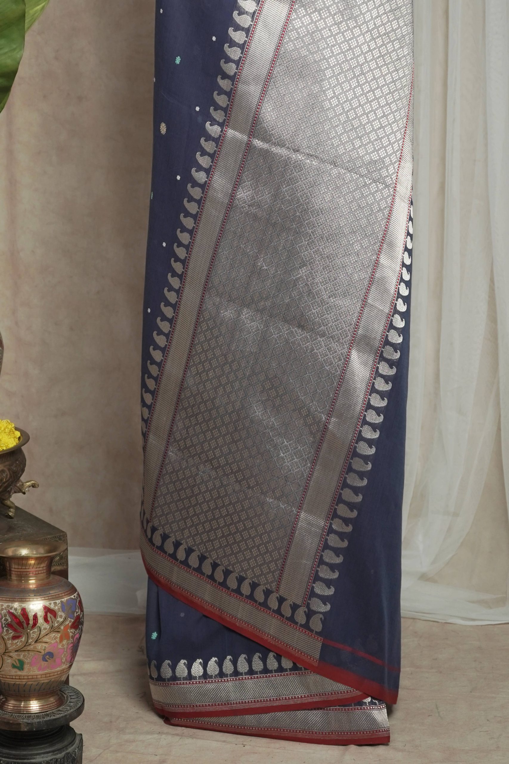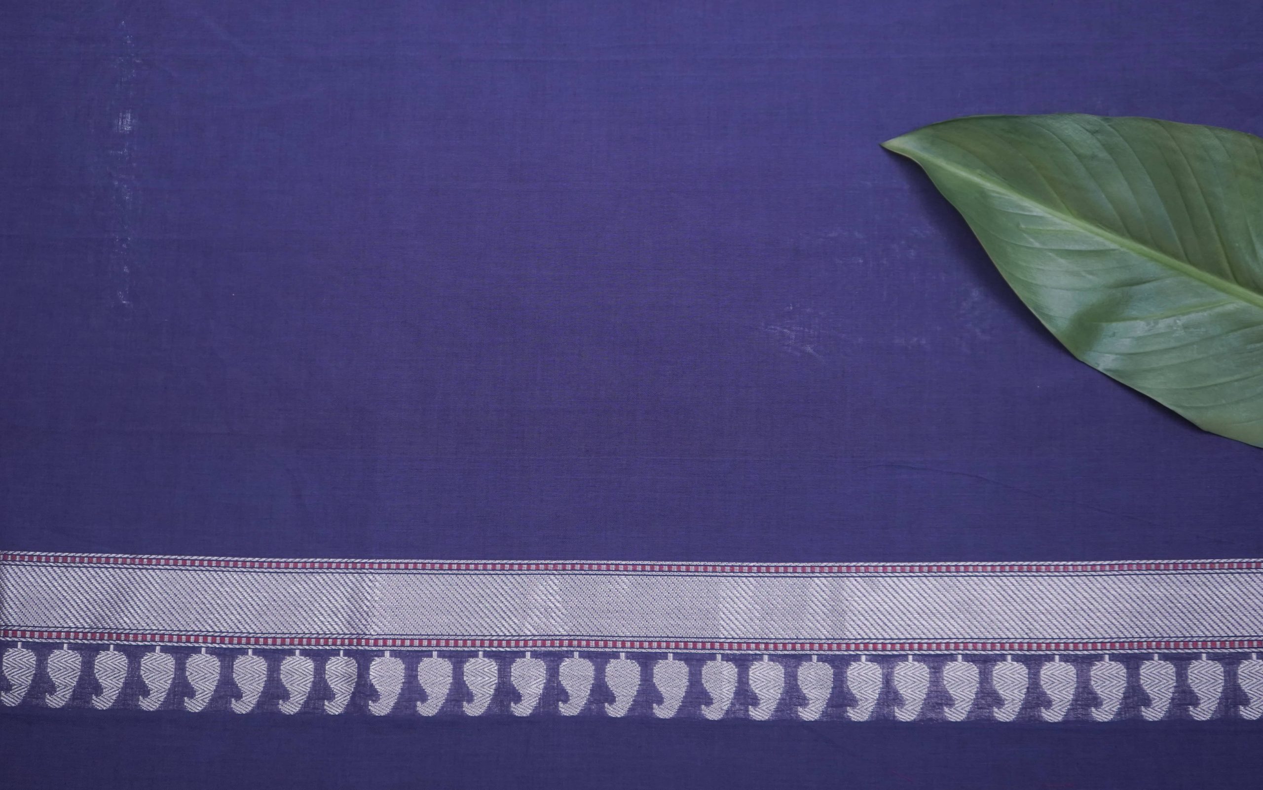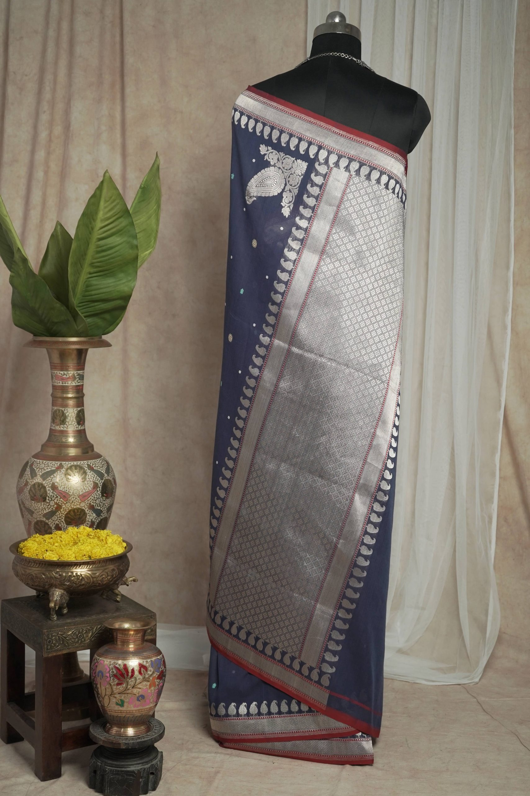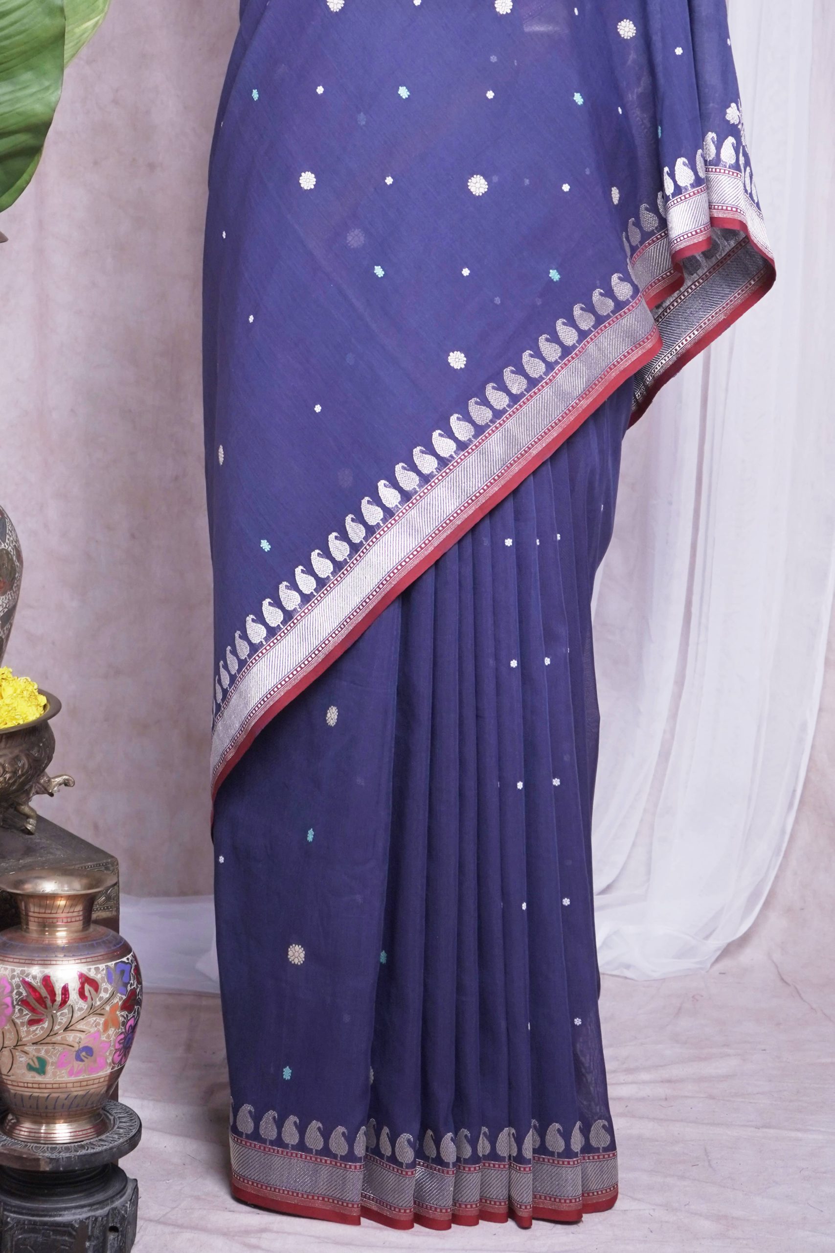 Discover the grace of blue cotton Banarasi sarees, where elegance meets comfort. The highlight of the saree is the intricate thread buties all across and the delicate silver colored zari work in the border and pallu. The red coloured selvedge gives a contrasting edge to the look the saree itself. The saree blended with the softness of cotton with the intricate craftsmanship of Banaras are perfect for both festive occasions and everyday elegance. Embrace timeless style with a touch of heritage in every drape.