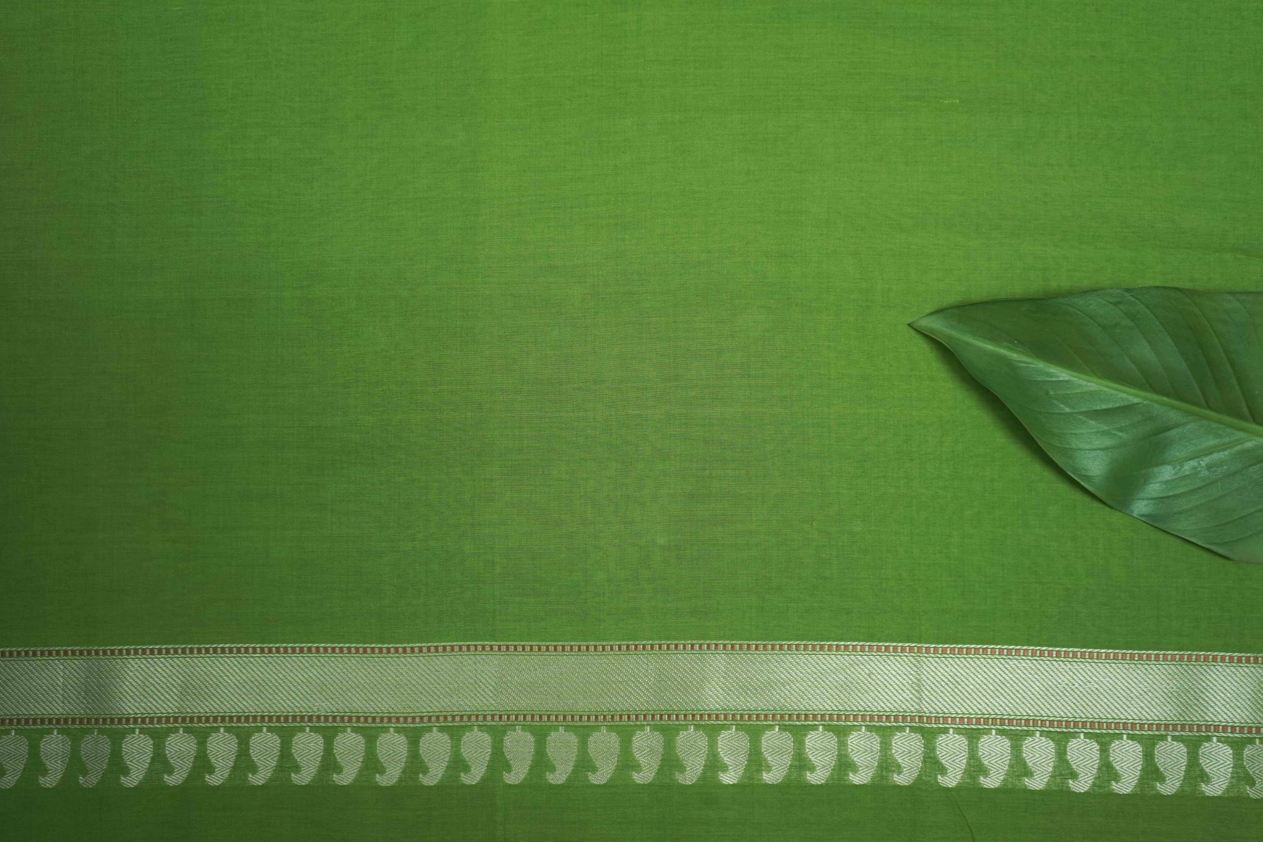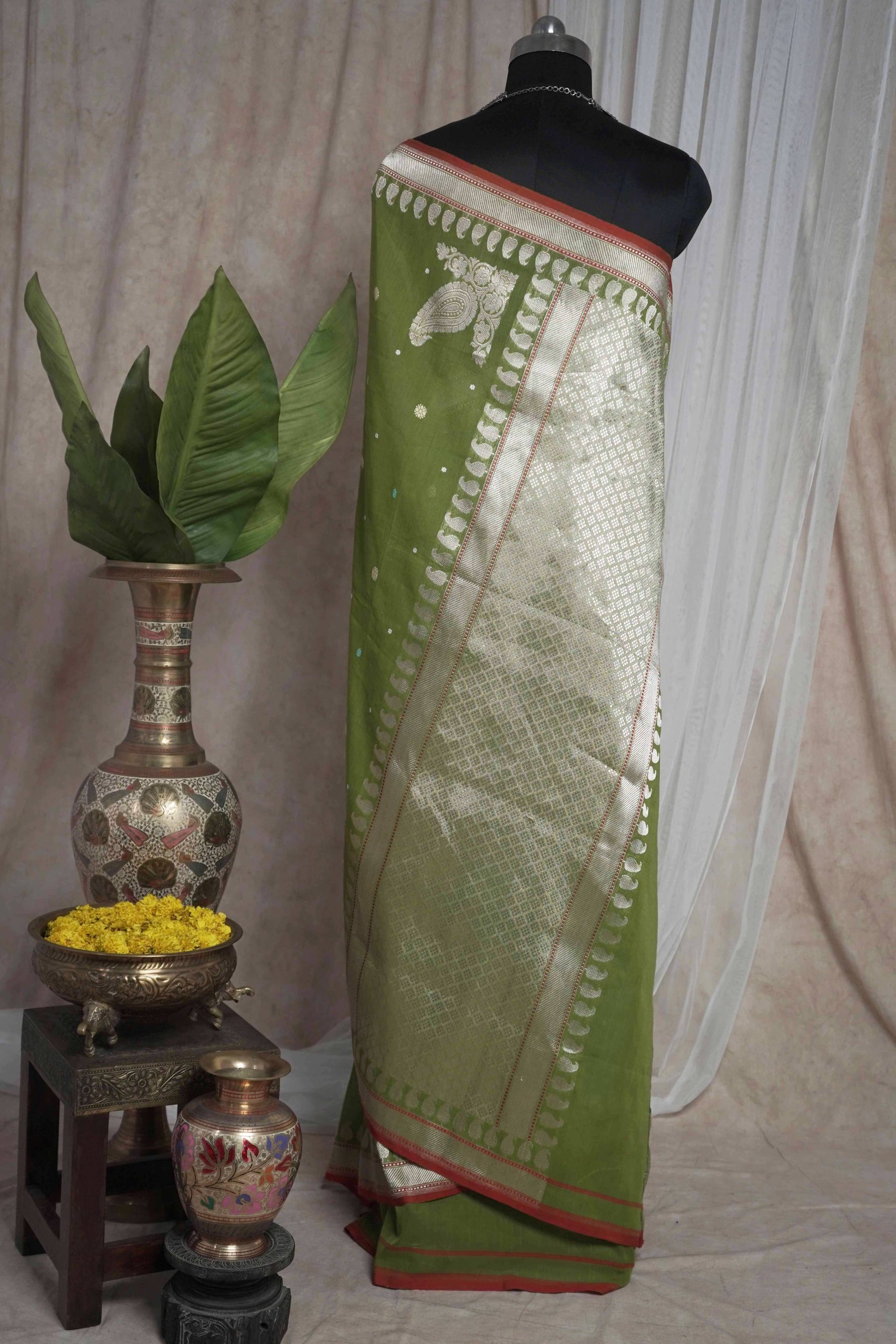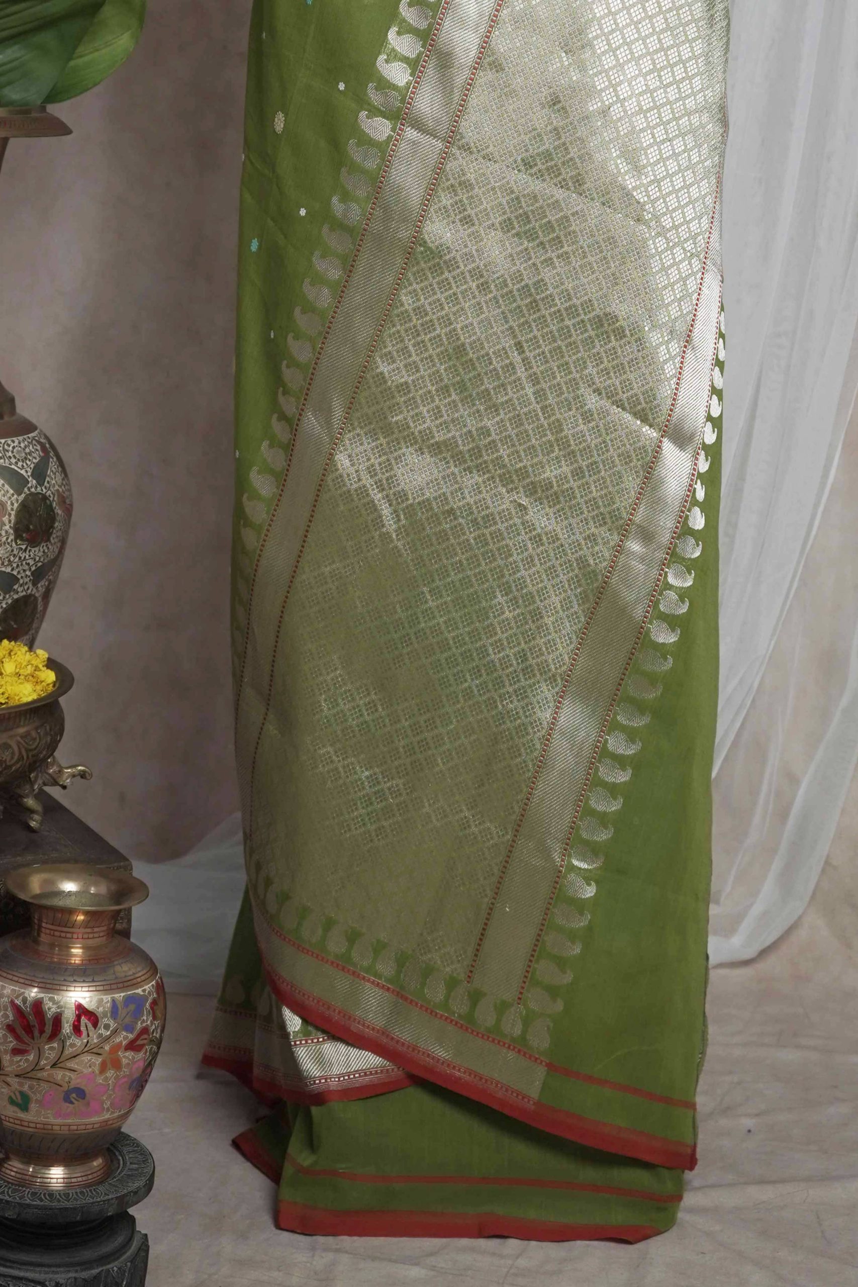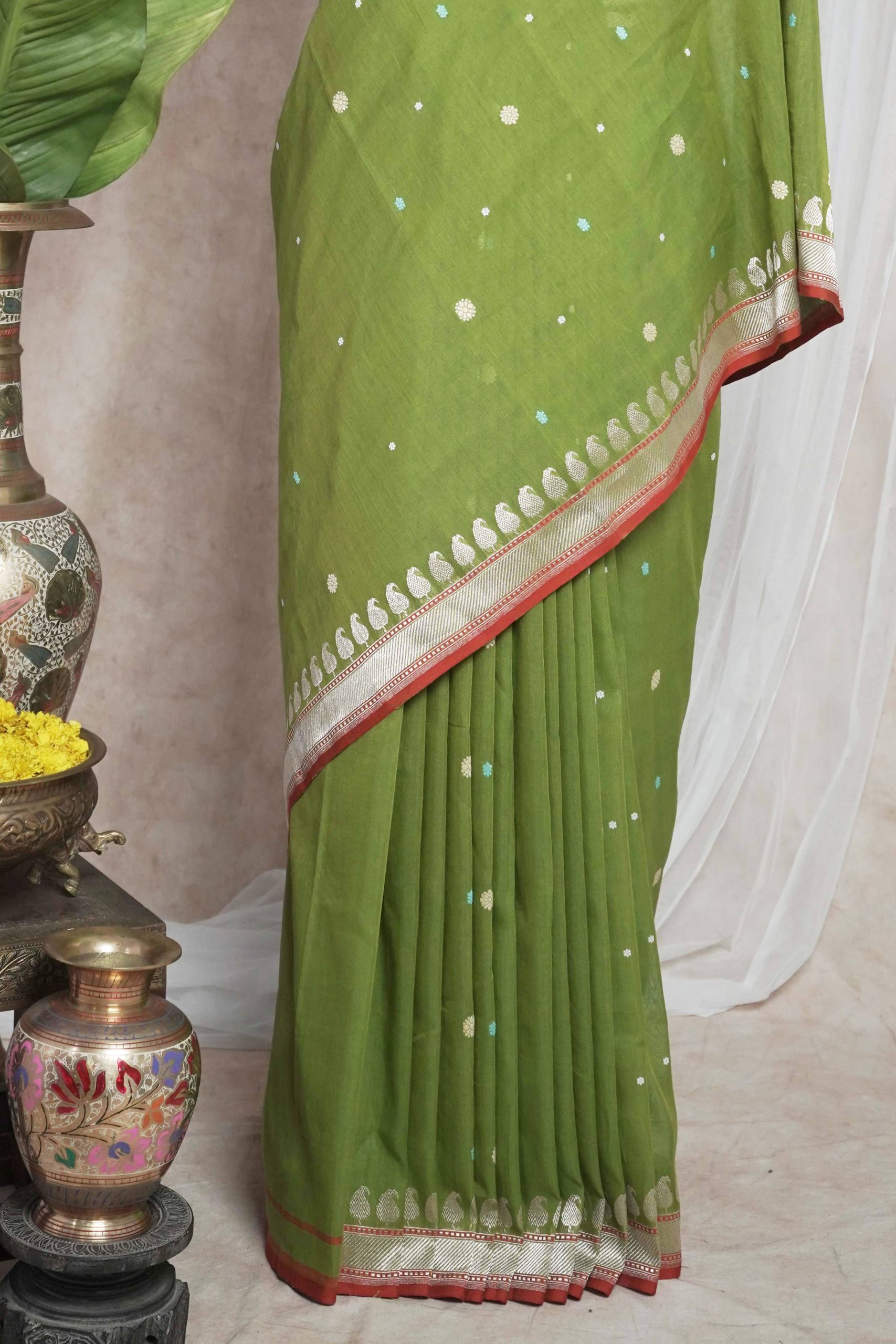 Discover the grace of light green cotton Banarasi sarees, where elegance meets comfort. The highlight of the saree is the intricate thread buties all across and the delicate silver colored zari work in the border and pallu. The red coloured selvedge gives a contrasting edge to the look the saree itself. The saree blended with the softness of cotton with the intricate craftsmanship of Banaras are perfect for both festive occasions and everyday elegance. Embrace timeless style with a touch of heritage in every drape.