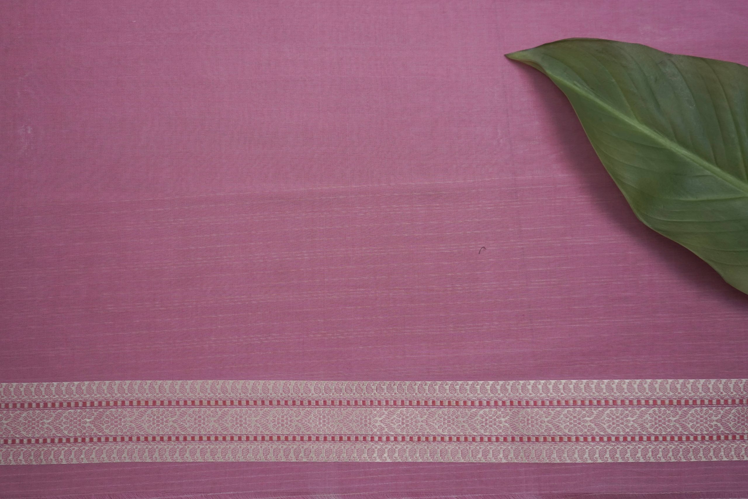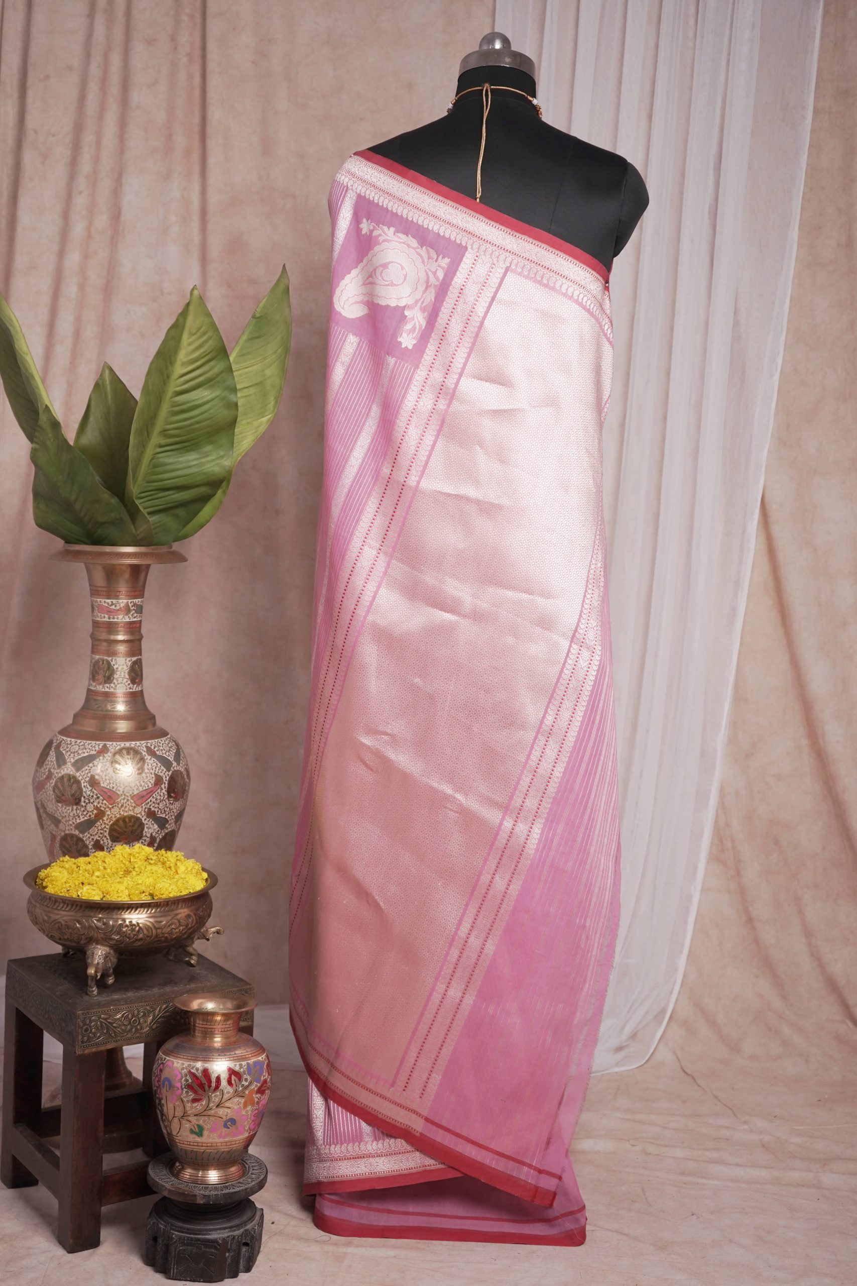 Discover the grace of light pink cotton Banarasi sarees, where elegance meets comfort. The highlight of the saree is the intricate stripes in thread work all across and the delicate beige colored thread work in the border and pallu. The red coloured selvedge gives a contrasting edge to the look the saree itself. The saree blended with the softness of cotton with the intricate craftsmanship of Banaras are perfect for both festive occasions and everyday elegance. Embrace timeless style with a touch of heritage in every drape.