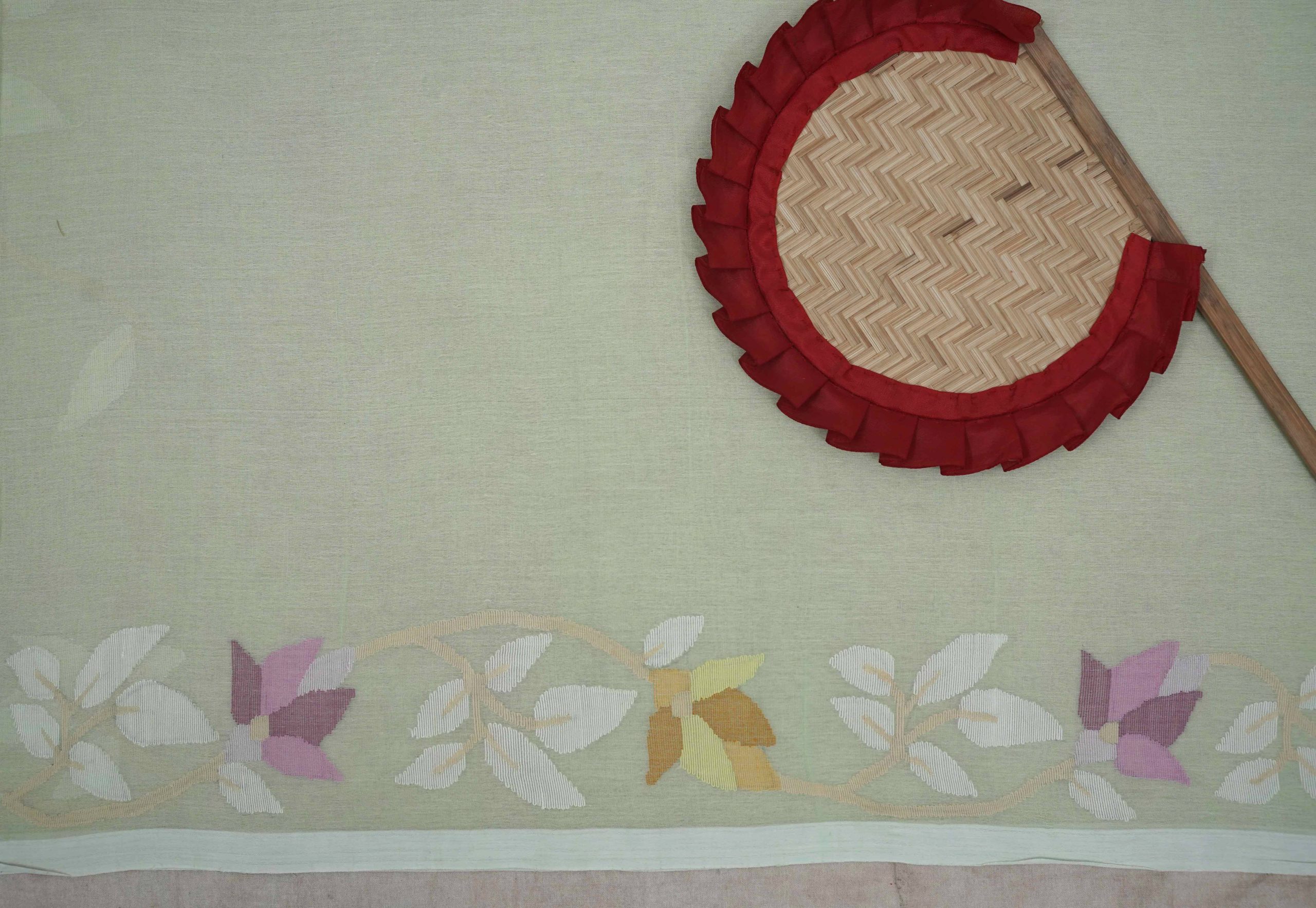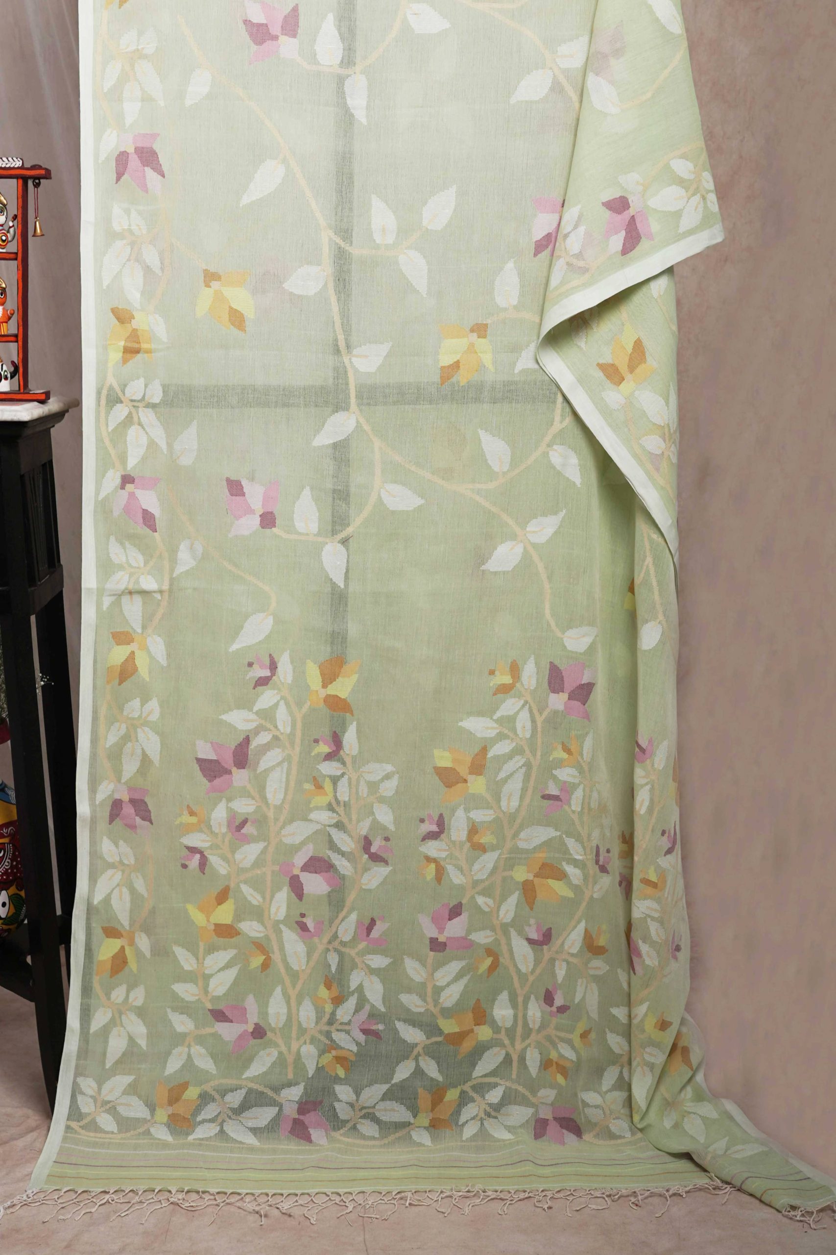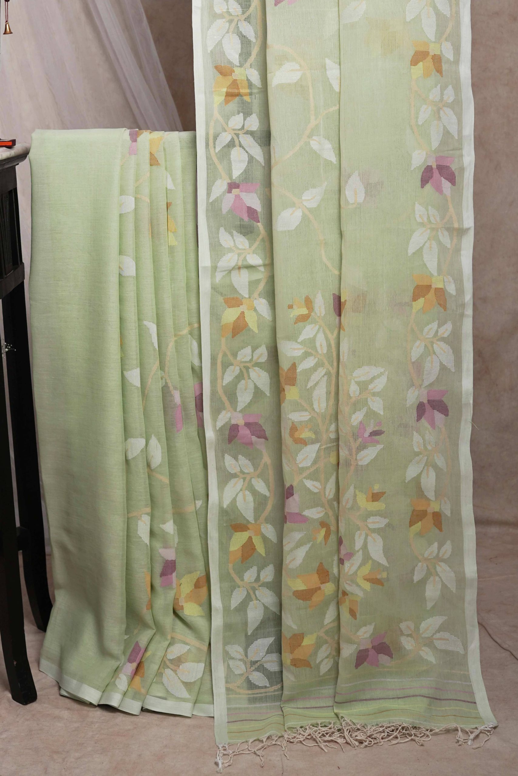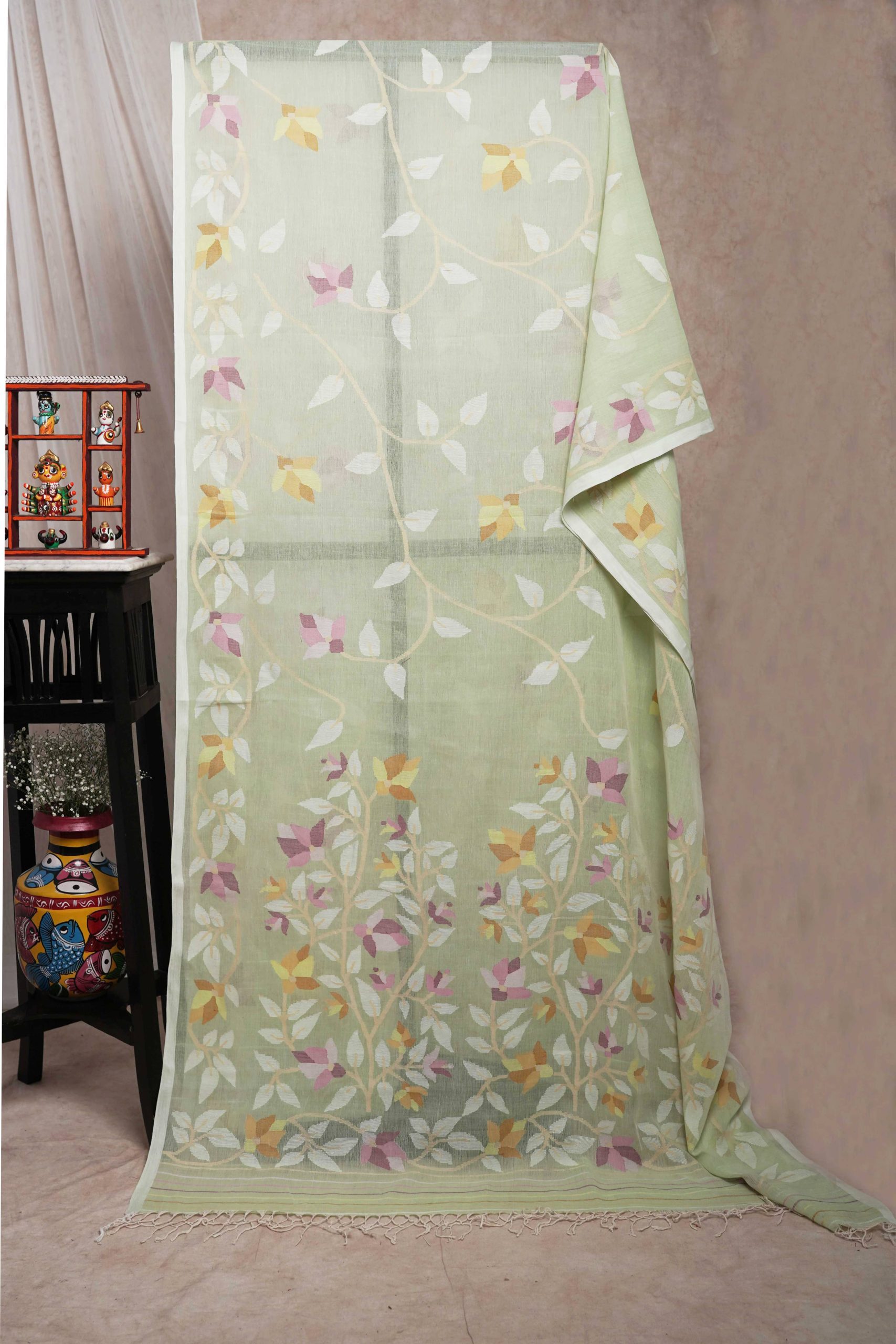 Embrace the pride of Bengal with our pale green handwoven octton Jamdani saree. Woven with care and adorned with intricate floral patterns, this saree is a true testament to Bengal’s rich weaving heritage. Soft, breathable, and gracefully elegant, it blends timeless craftsmanship with the region’s cultural pride. Perfect for cherished moments, from tranquil mornings to grand celebrations.
