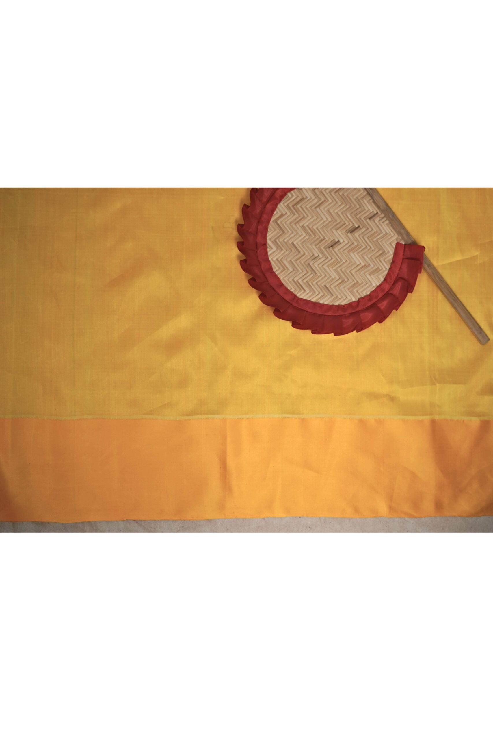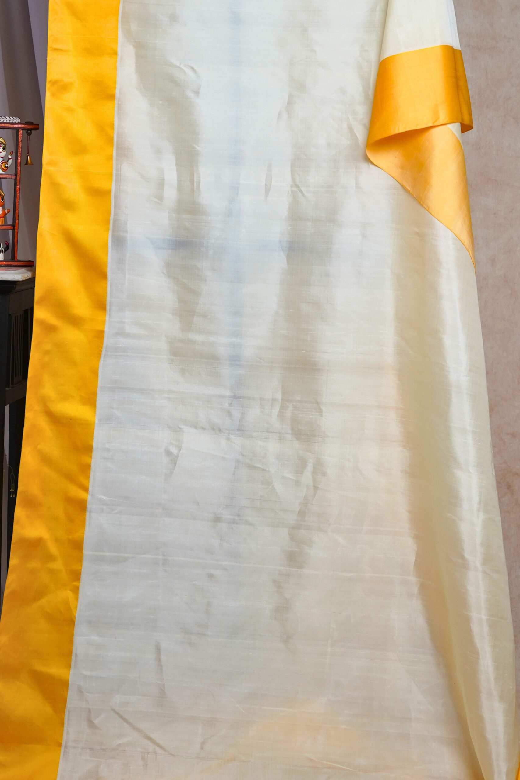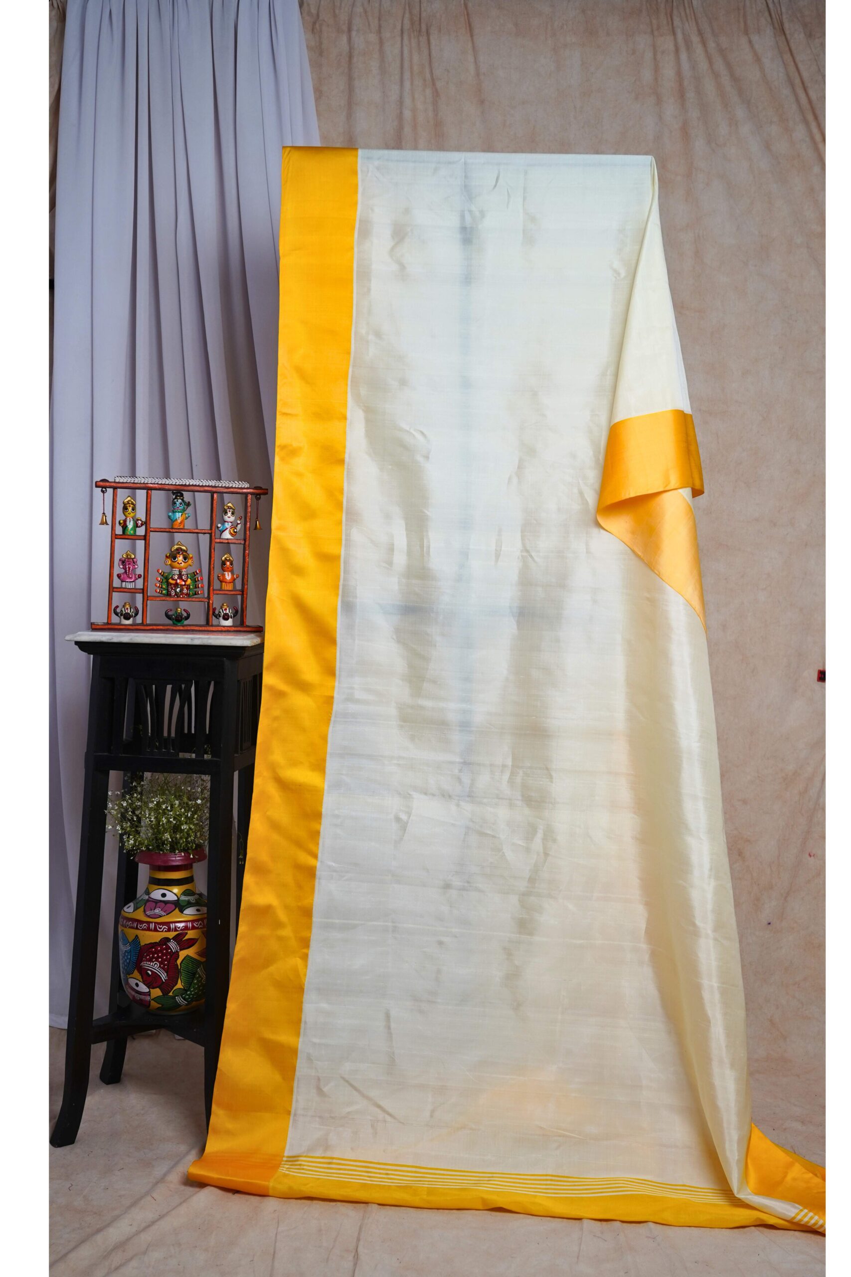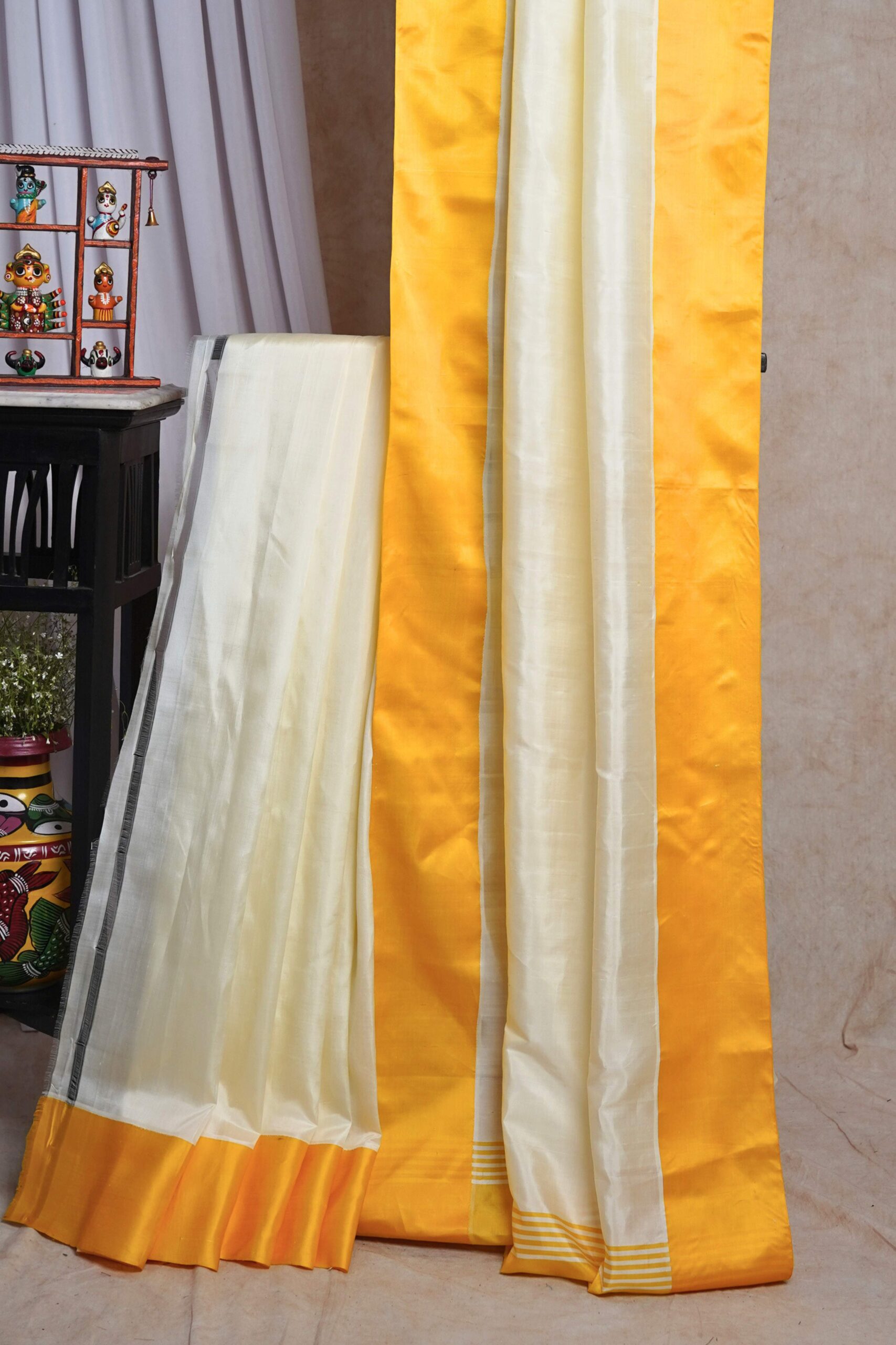 Steeped in the age-old artistry of Bengal’s master weavers, this Gorod saree in cream colour is a symbol of understated elegance and cultural pride. Adorned with with solid yellow borders , each weave reflects centuries of skill passed down through generations.