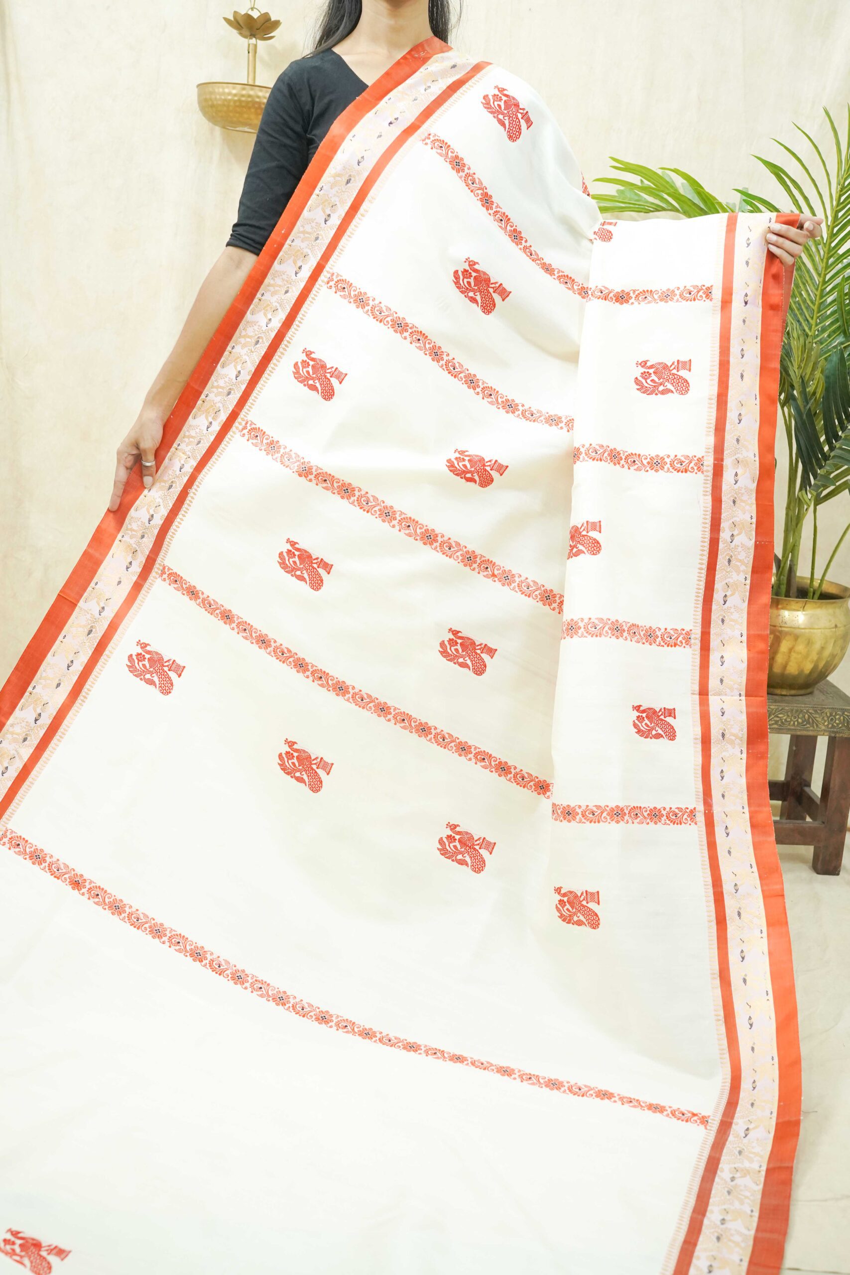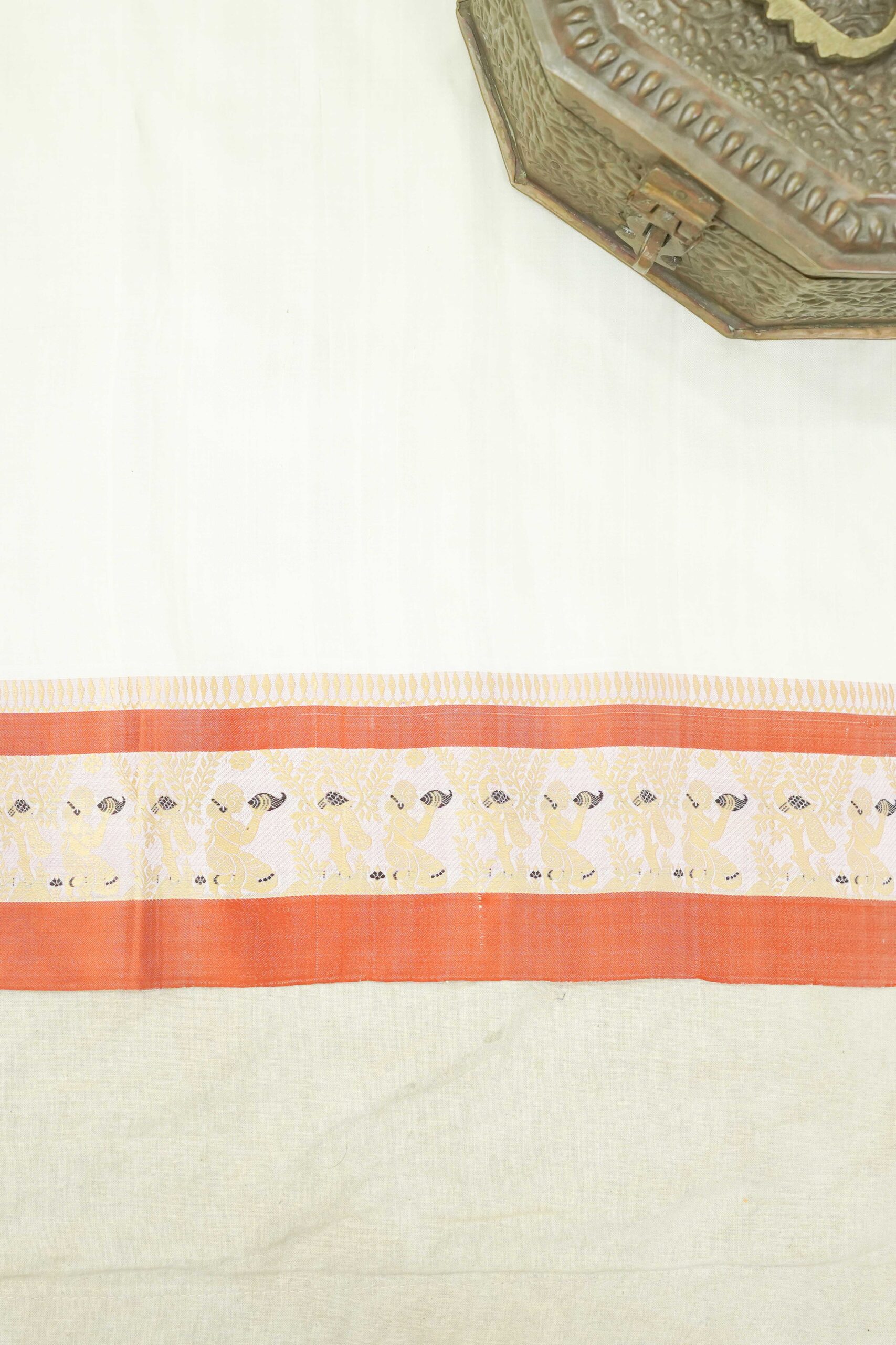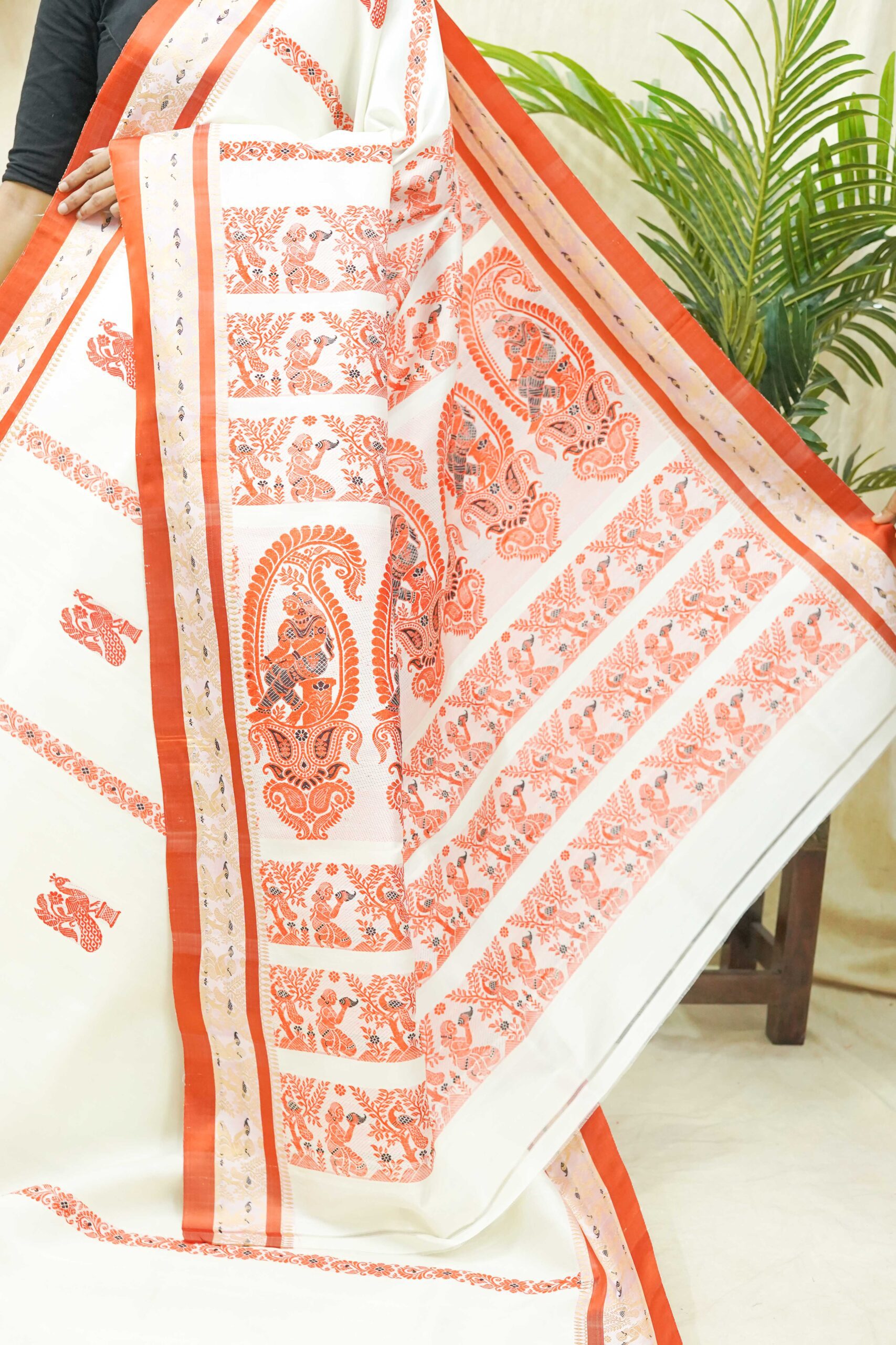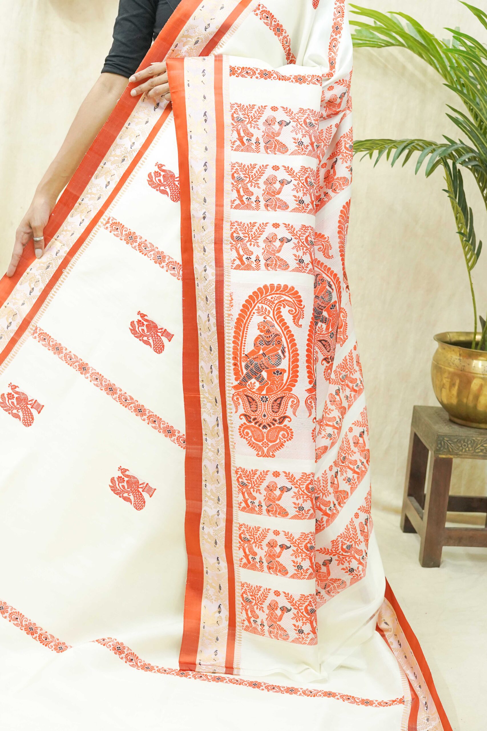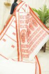 Steeped in the age-old artistry of Bengal’s master weavers, this Gorod saree in cream colour is a symbol of understated elegance and cultural pride. Adorned with with golden thread work borders and intricate motifs all across the body, each weave reflects centuries of skill passed down through generations.