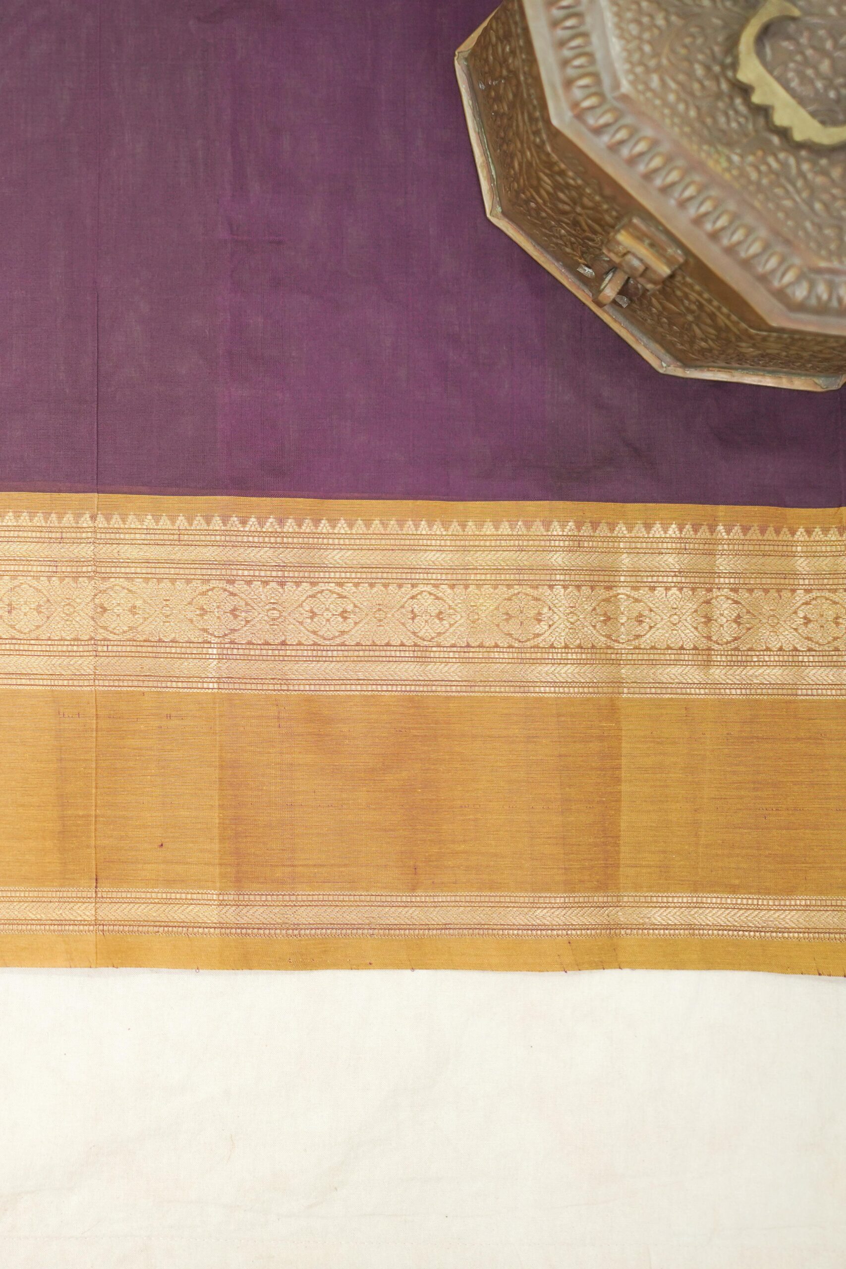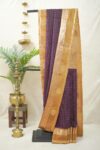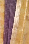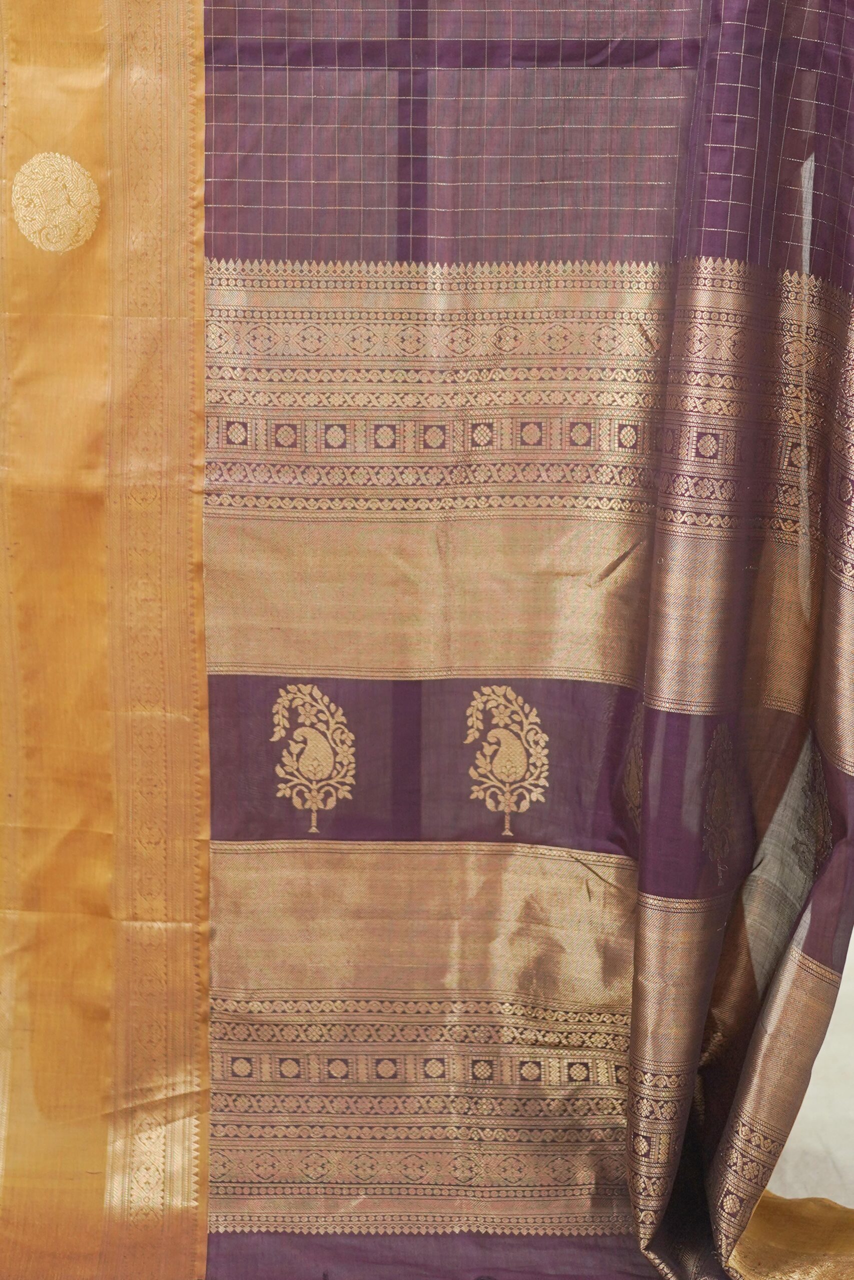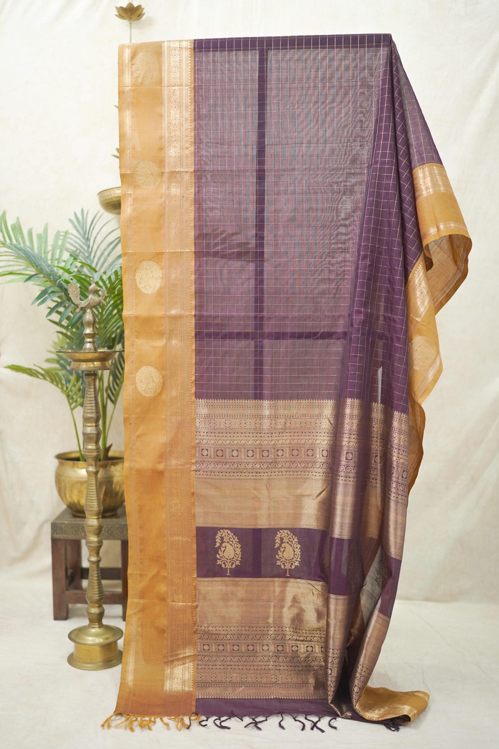 This Kanchipuram sico saree features a stunning dark plum colour , which lends an aura of elegance. The golden zari work in coffee coloured borders of the saree is mesmerizing . Further enhancing the beauty of the saree are the checks in golden zari all across meticulously woven into the fabric.