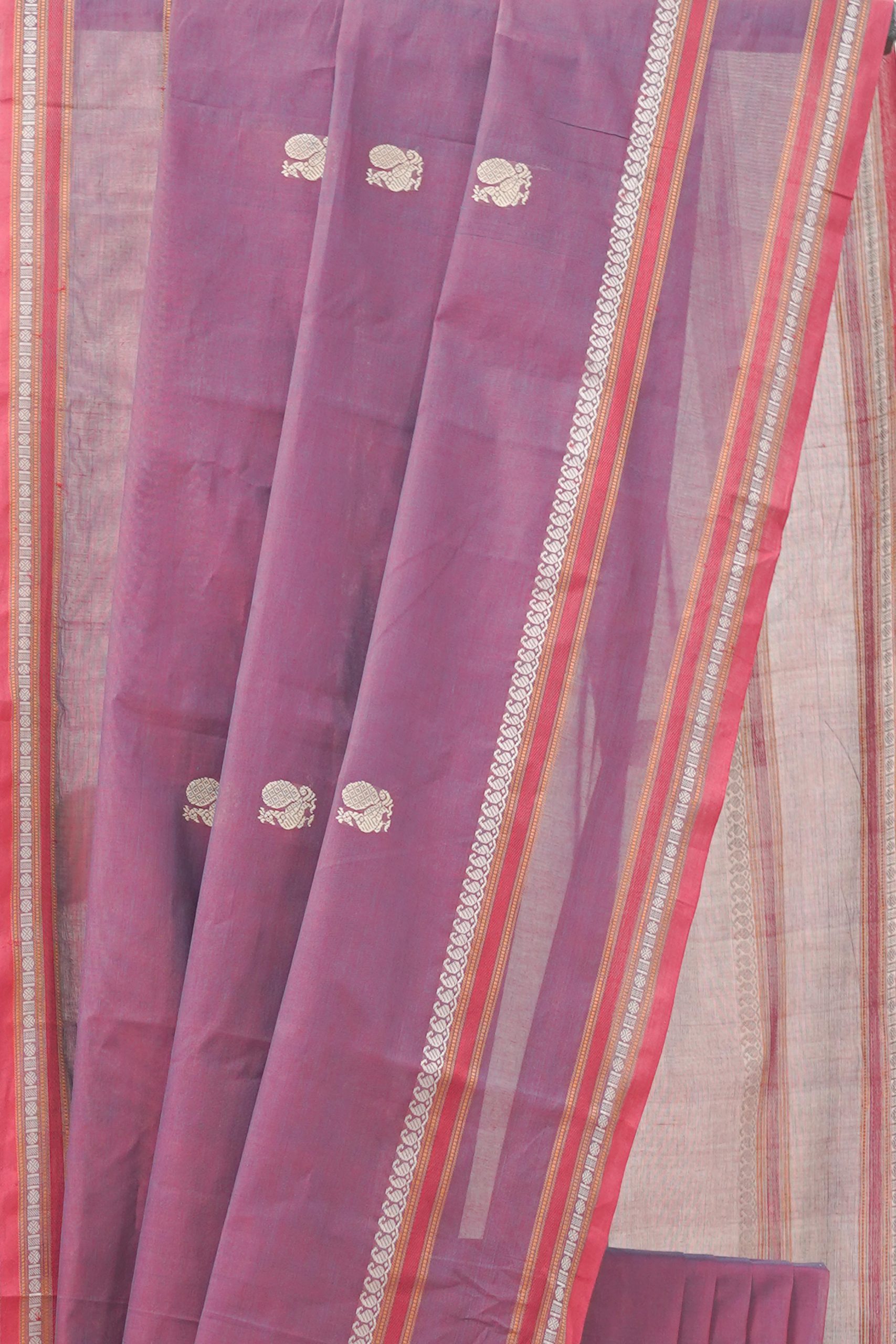 Enhance your ethnic ensemble with our red & blue dual toned Kanchipuram cotton saree, featuring intricate peacock motif, and a striking & contrasting red selvedge . Perfect for any special occasion, this saree combines traditional artistry with modern elegance.