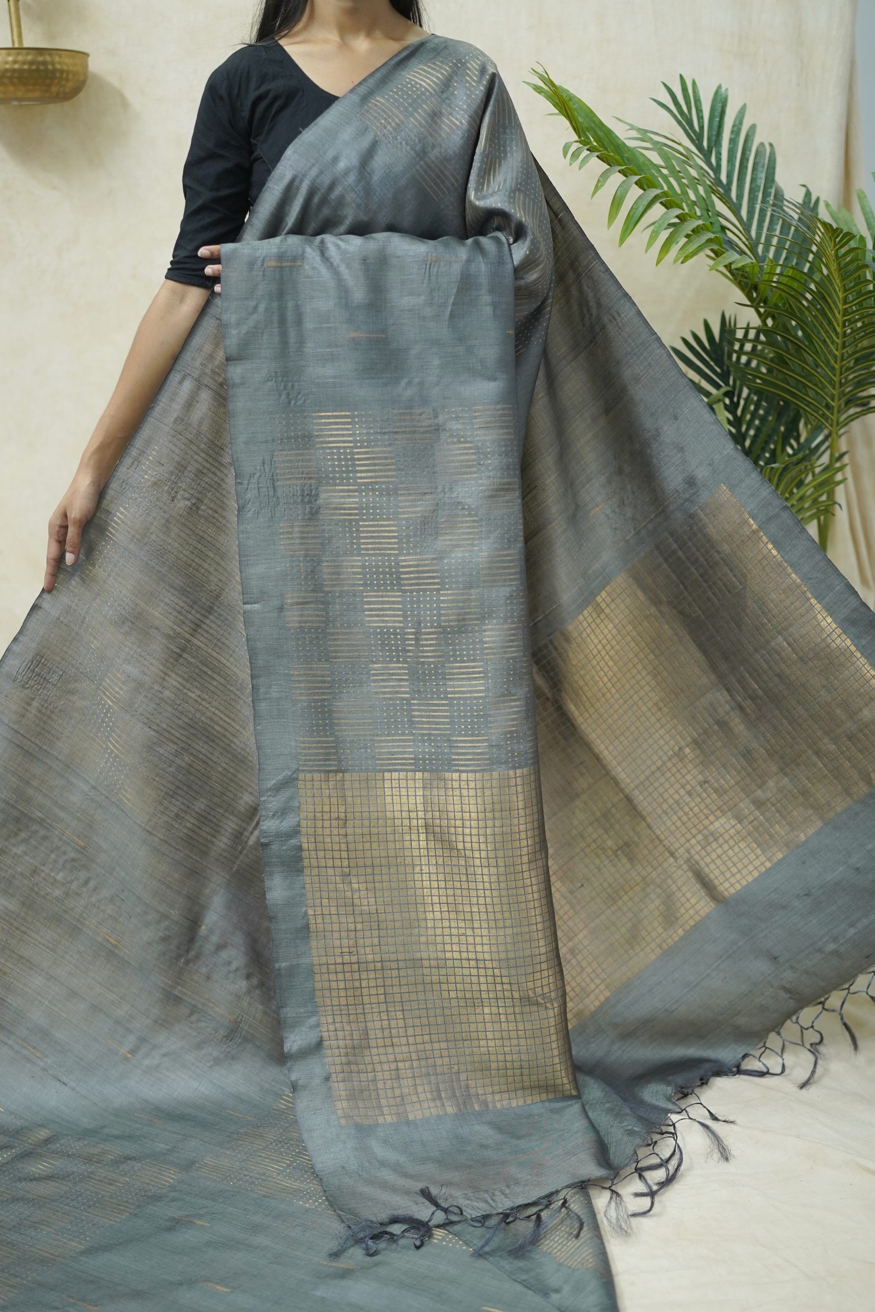 Immerse yourself in the regal charm of our grey handwoven Kosa silk saree from Chhattisgarh, adorned with a shimmering golden zari work across the body. Renowned for its natural sheen and refined elegance, this saree is a true reflection of Chhattisgarh’s rich weaving heritage. Perfect for special occasions, it embodies timeless sophistication and the unmatched artistry of traditional craftsmanship.