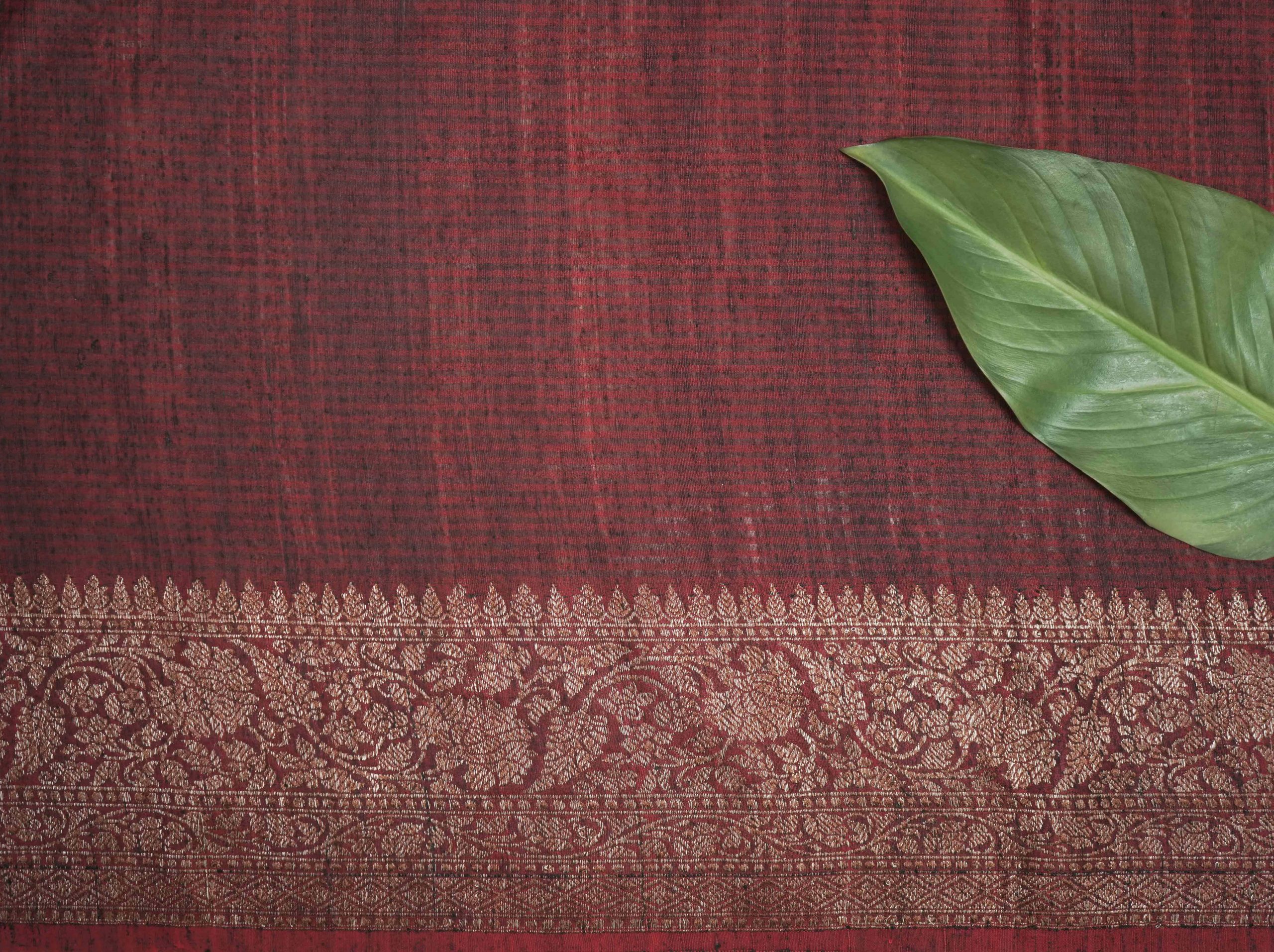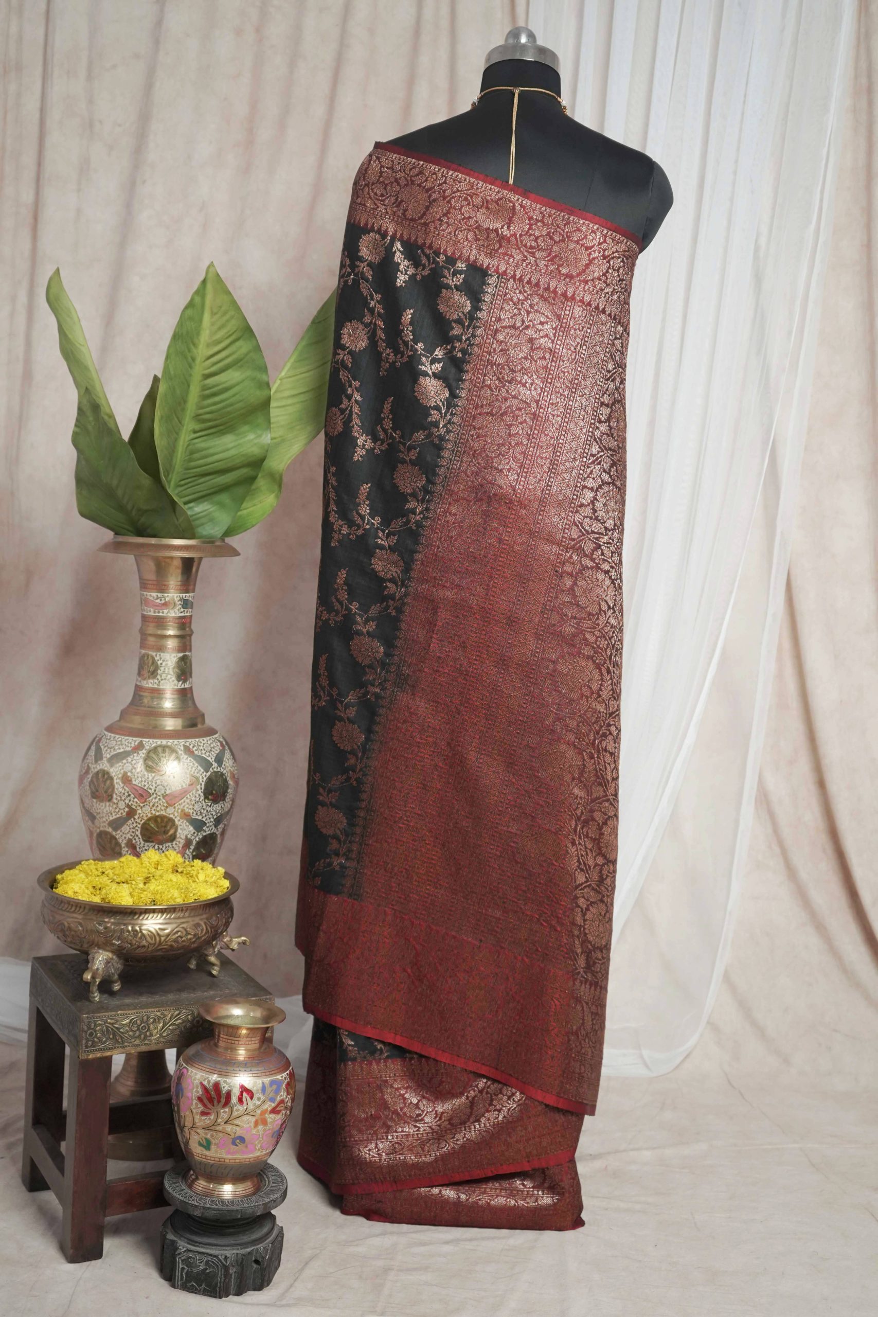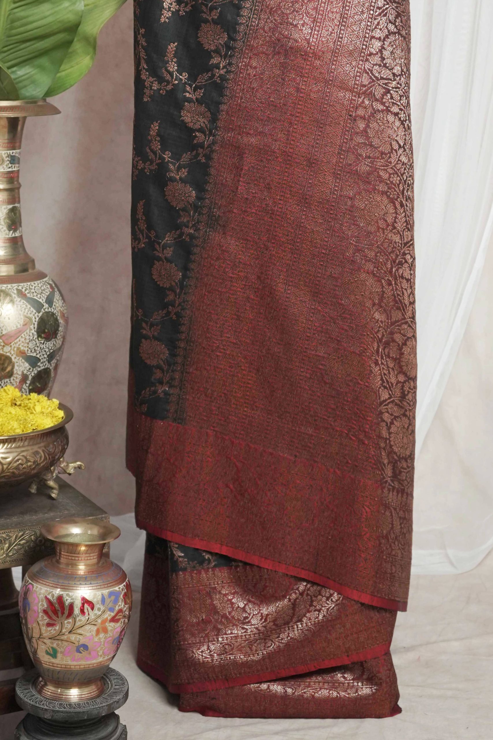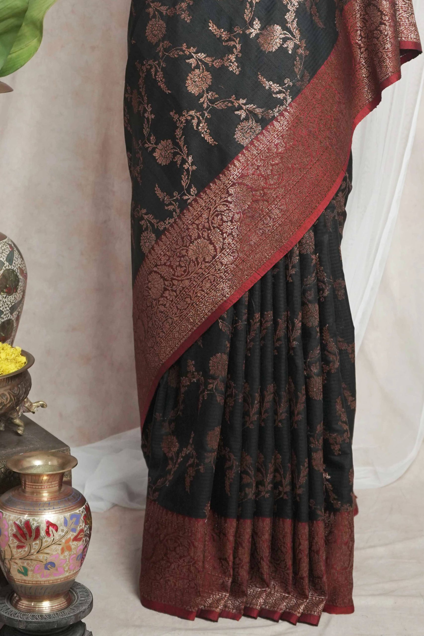 Delve into the sophistication of black Dupion Silk Banarasi sarees.The highlight of the saree is the luxurious texture in with floral motifs in intricate thread work. The delicate thread work in copper colour on red coloured border give a uniqueness to appearance of the saree.Perfect for weddings and grand occasions, these sarees exude timeless elegance and rich heritage. Drape yourself in opulence and make every moment unforgettable.