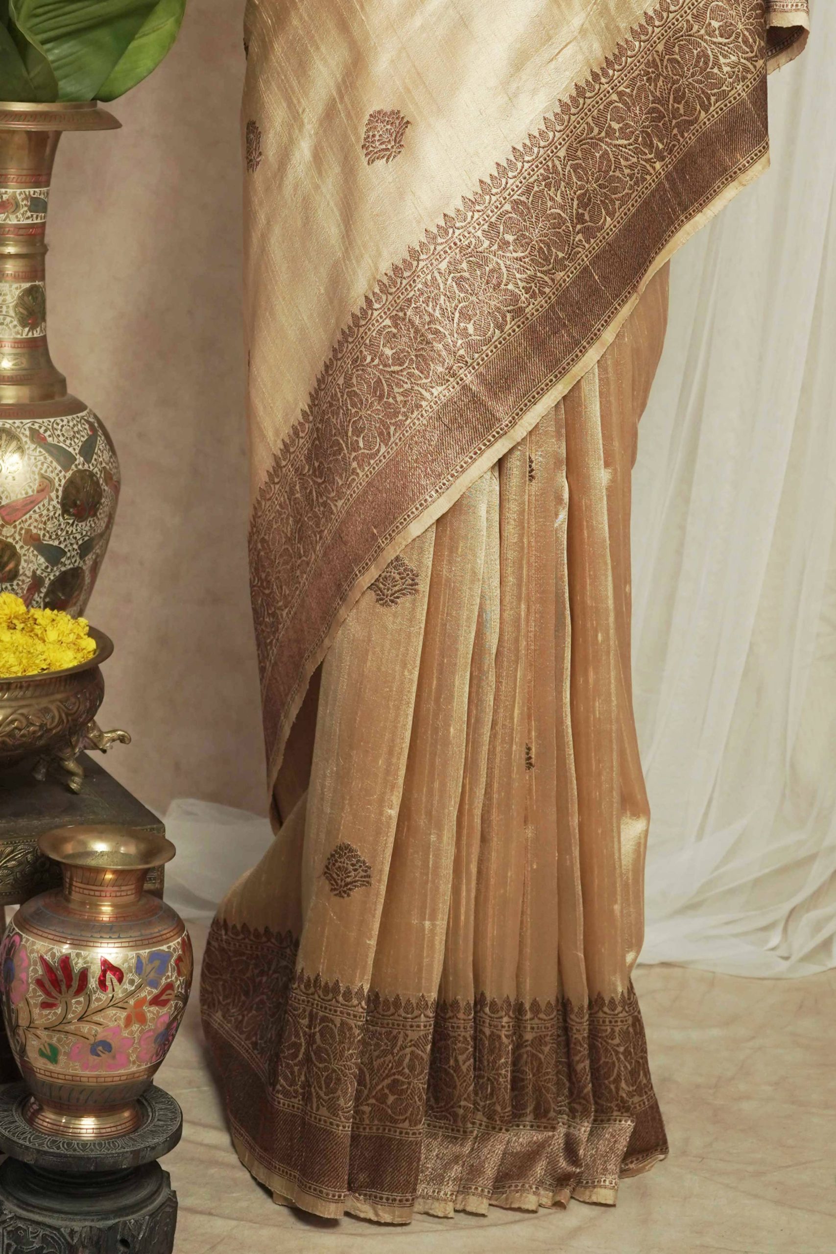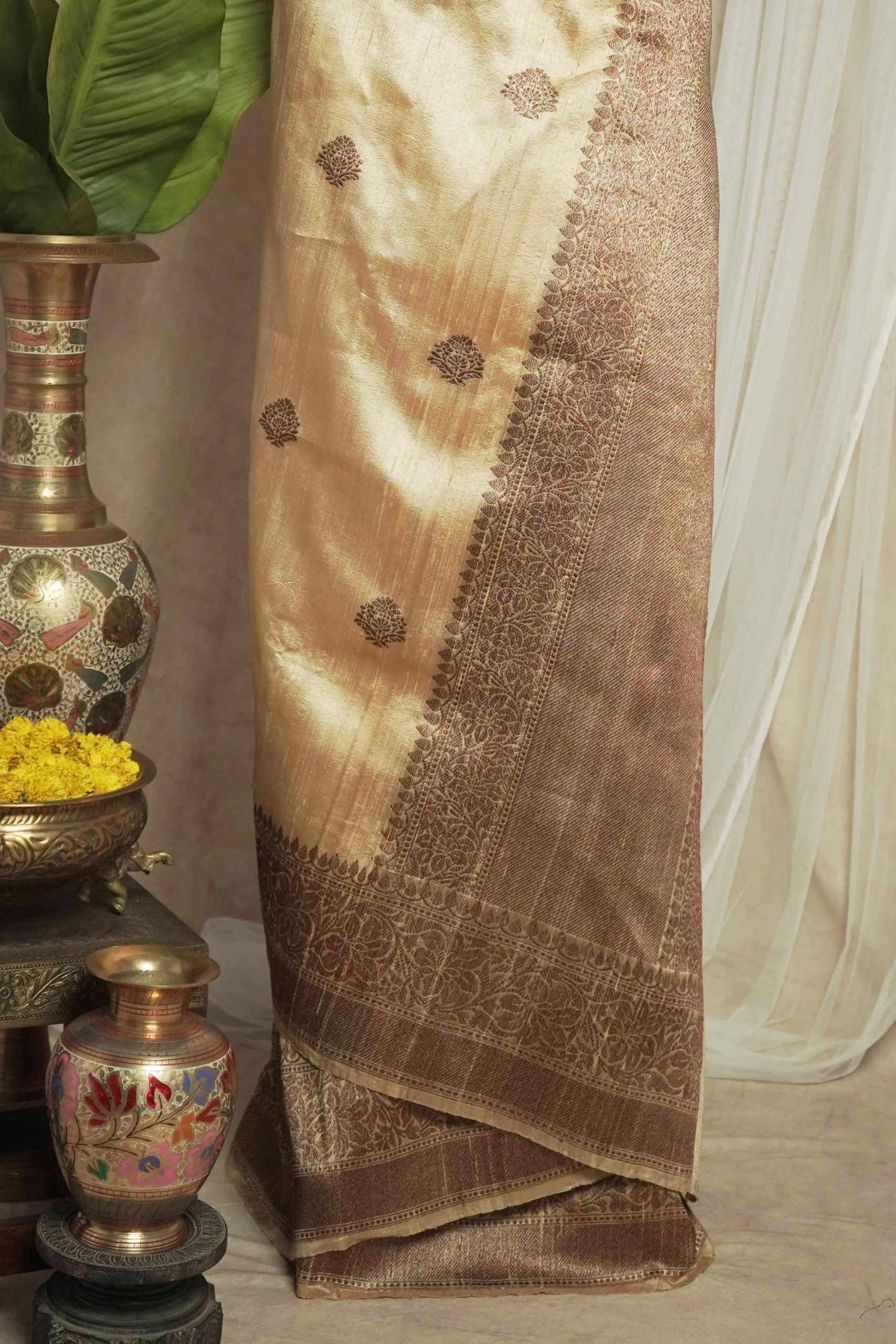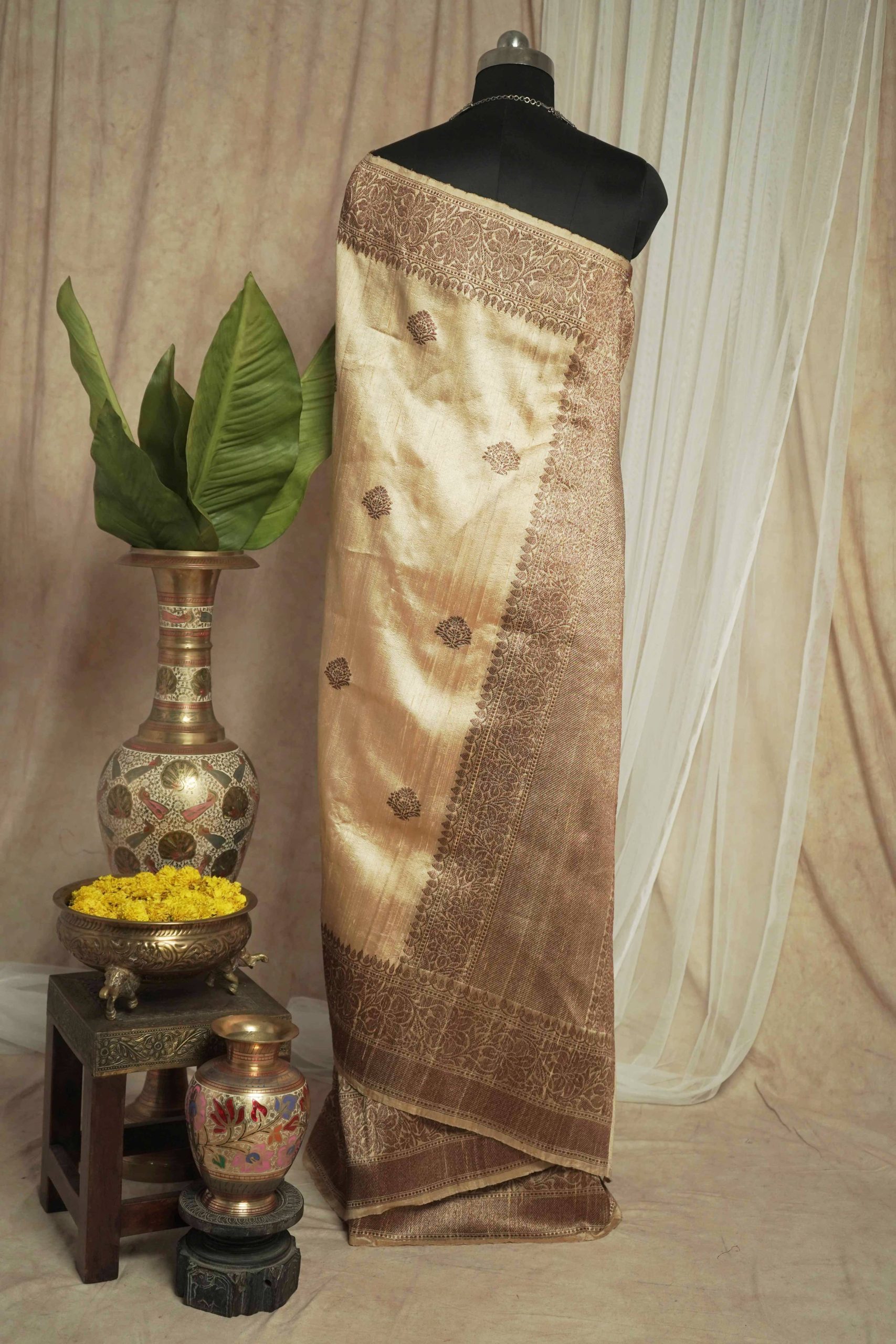 Delve into the sophistication of coffe creame Dupion Silk Banarasi sarees.The highlight of the saree is the luxurious texture in with floral motifs in intricate thread work. The delicate thread work in brown colour give a uniqueness to appearance of the saree.Perfect for weddings and grand occasions, these sarees exude timeless elegance and rich heritage. Drape yourself in opulence and make every moment unforgettable.
