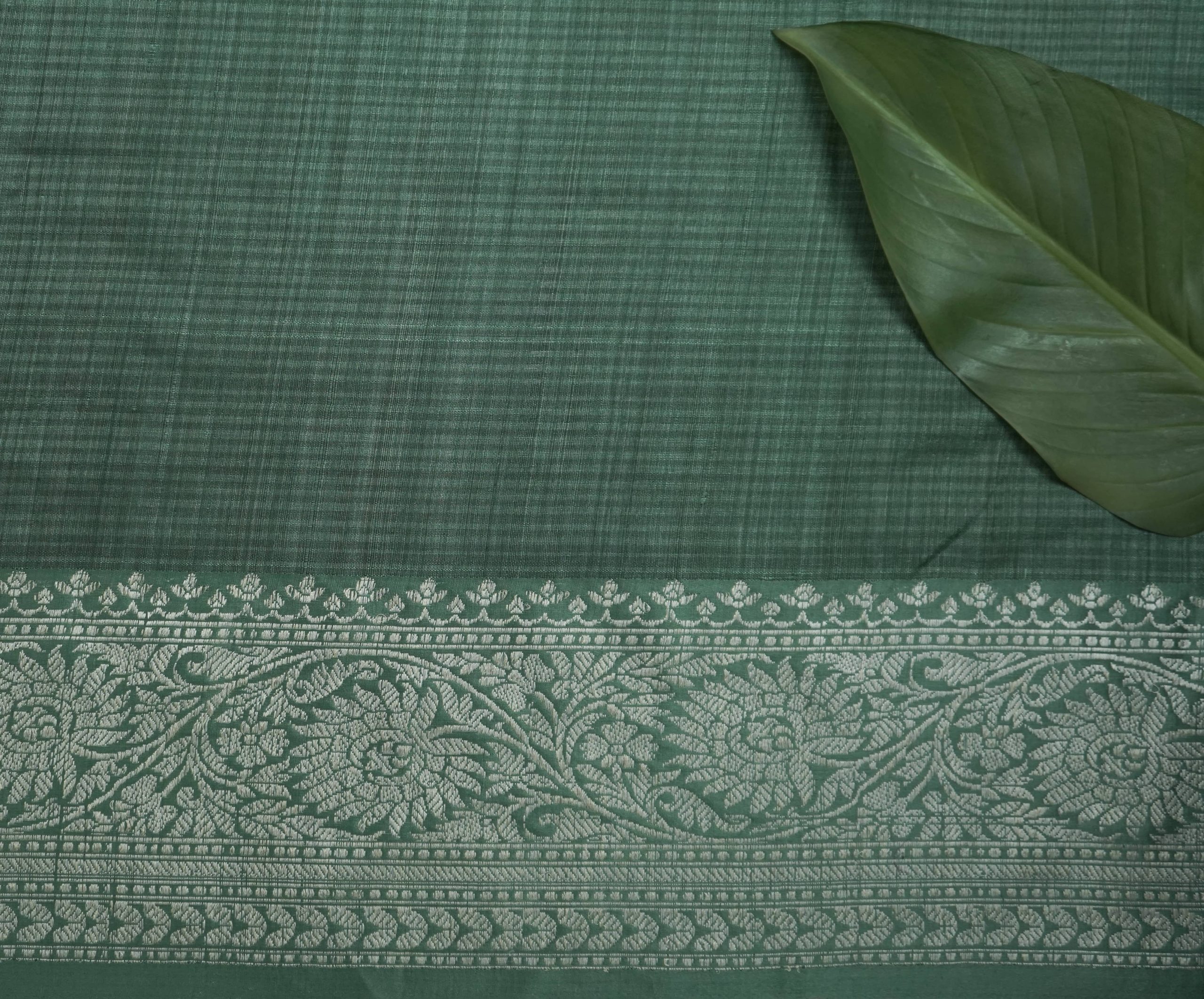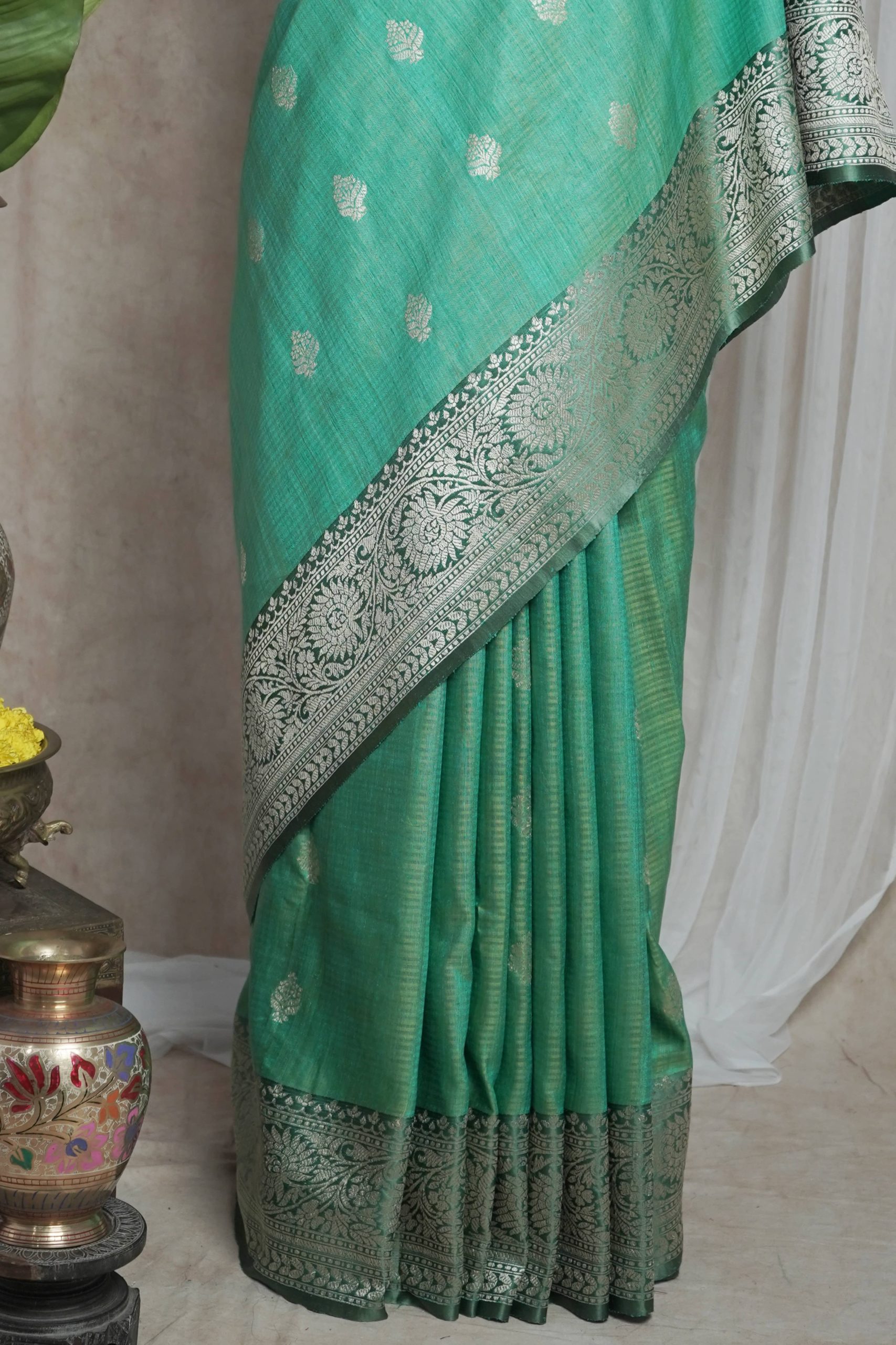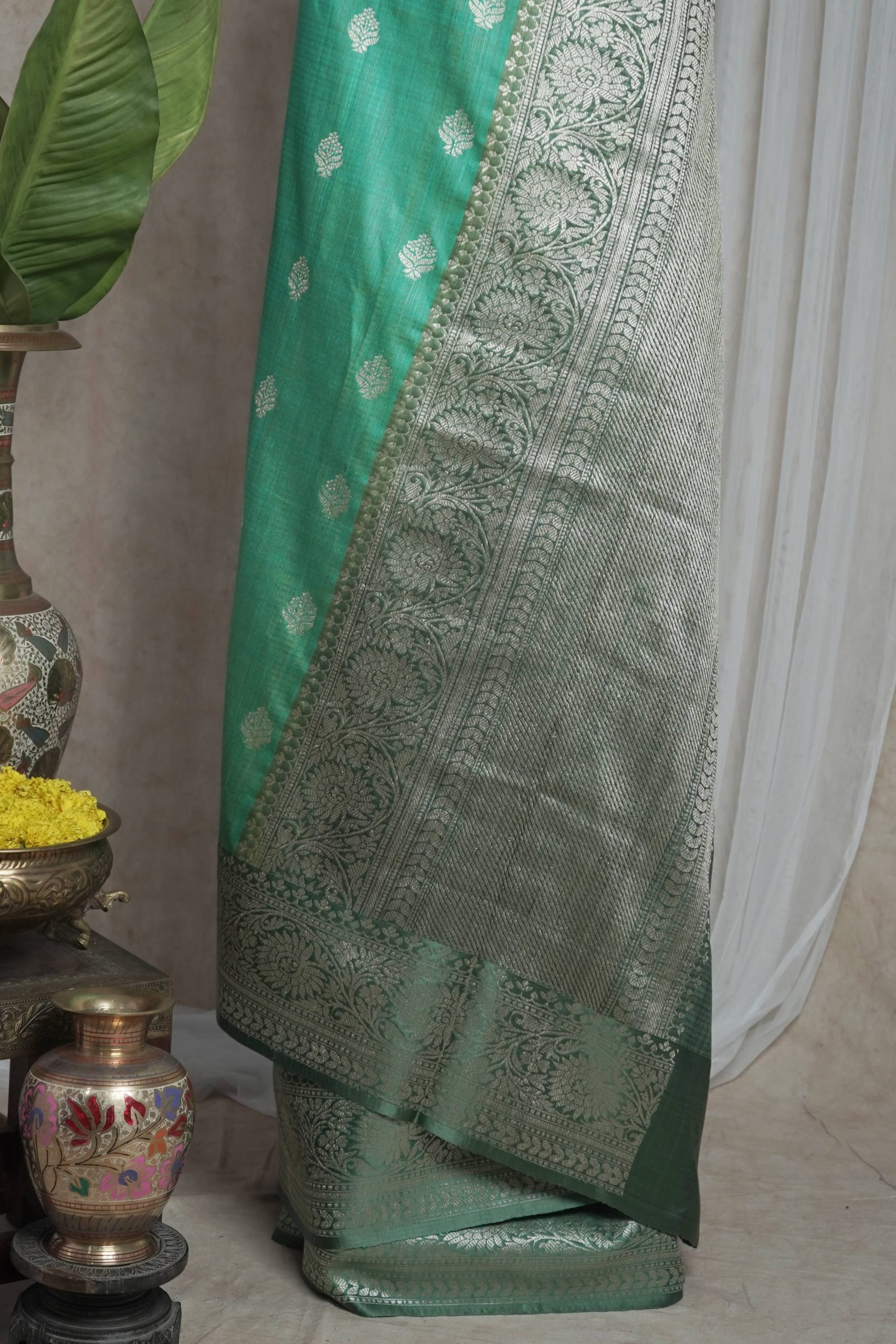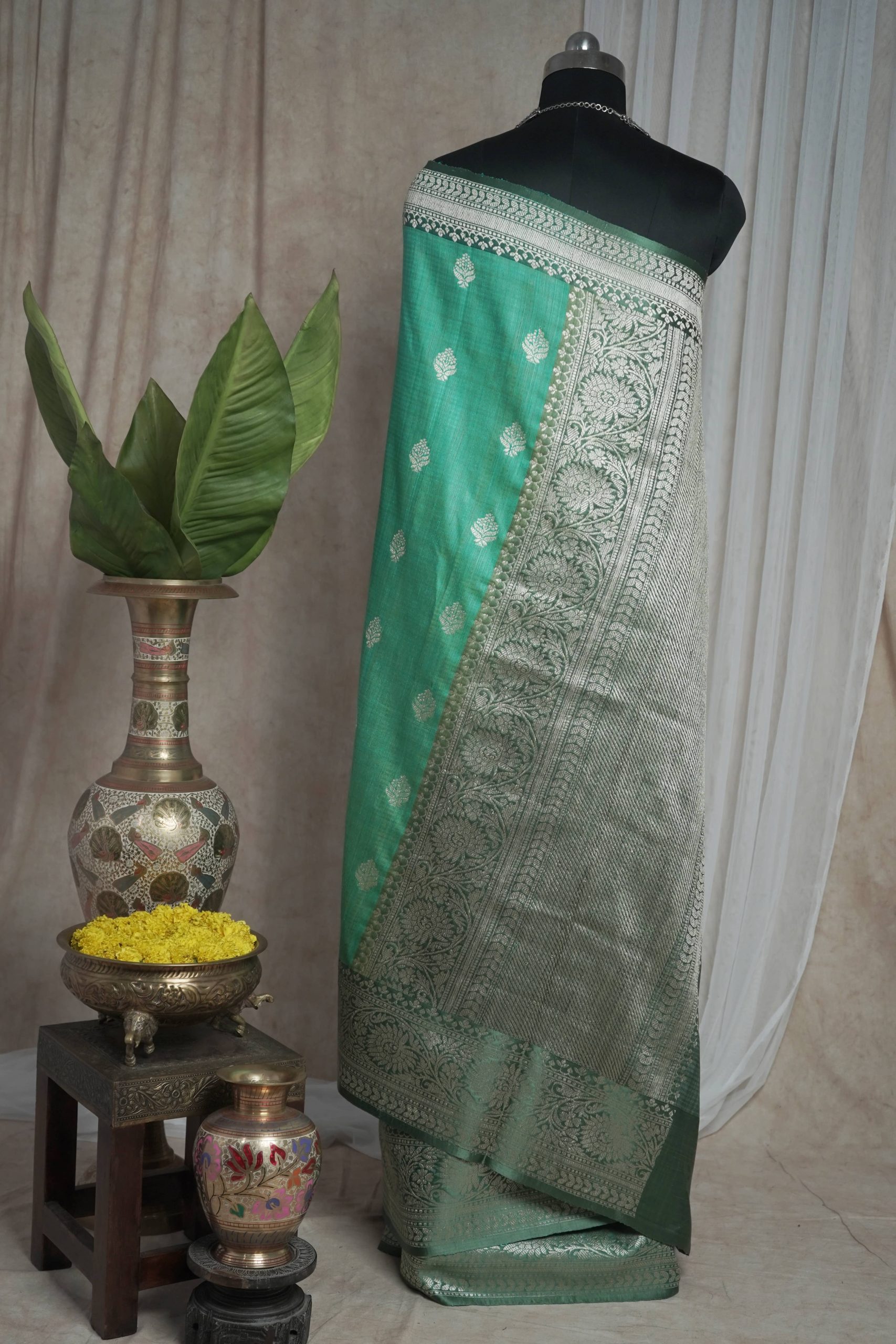 Delve into the sophistication of green Dupion Silk Banarasi sarees.The highlight of the saree is the luxurious texture in with floral motifs in intricate thread work. The delicate thread work in silver colour on the deeper shade of green border give a uniqueness to appearance of the saree.Perfect for weddings and grand occasions, these sarees exude timeless elegance and rich heritage. Drape yourself in opulence and make every moment unforgettable.