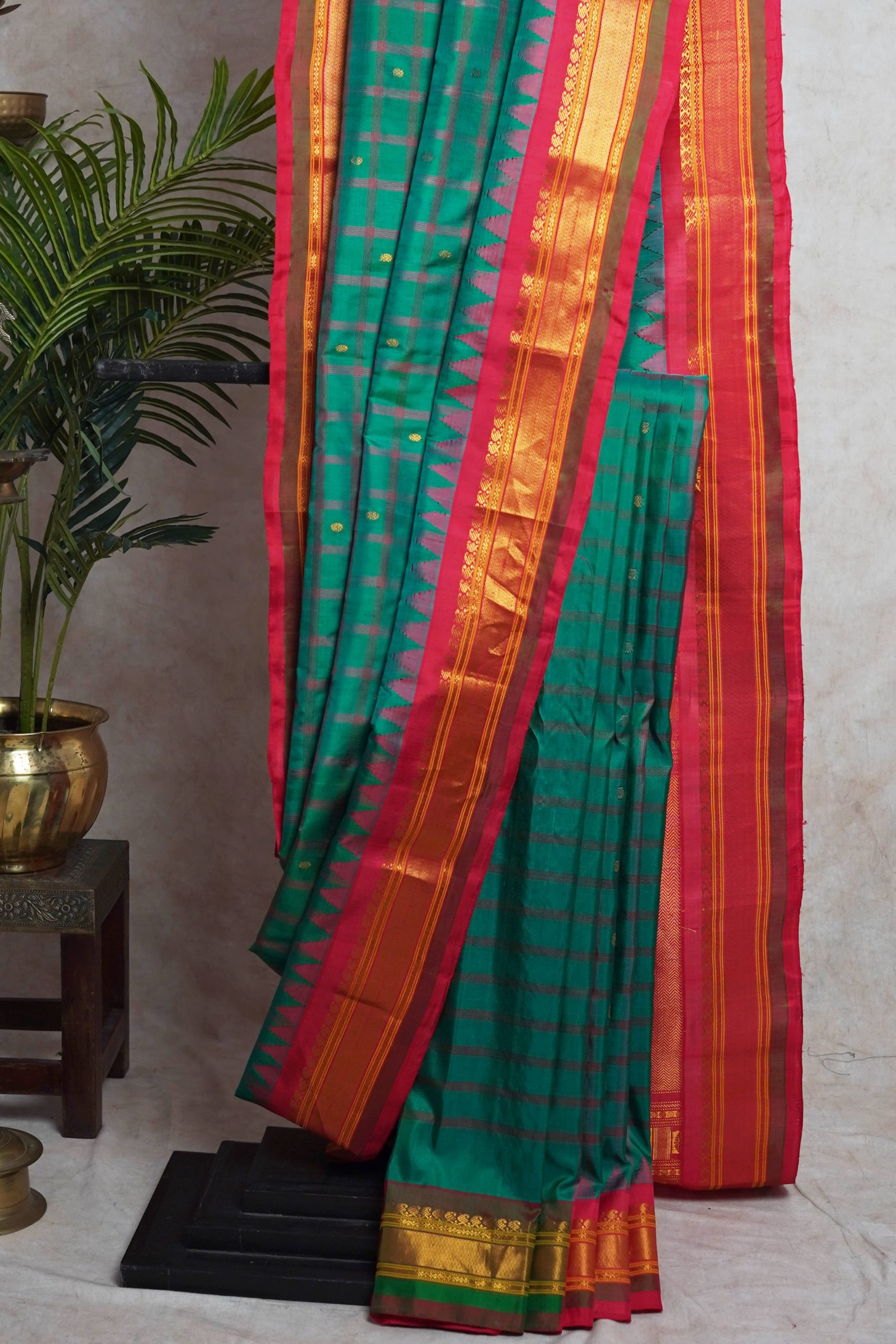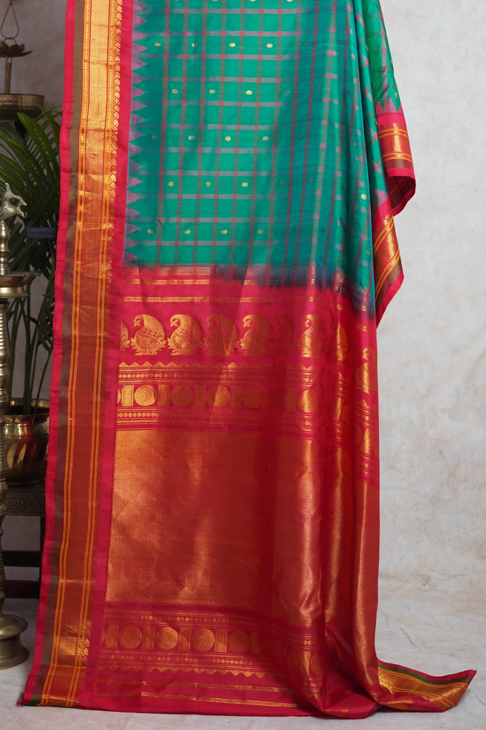Indulge in the timeless beauty of Silk Gadwal Sarees, a perfect fusion of tradition and sophistication. Handwoven with pure mulberry silk, the saree features exquisite small buties in golden zari all across the green checkered body, beautifully complemented by intricate golden zari work on the vibrant red border. Inspired by traditional patterns, their striking designs make them ideal for festive and special occasions.