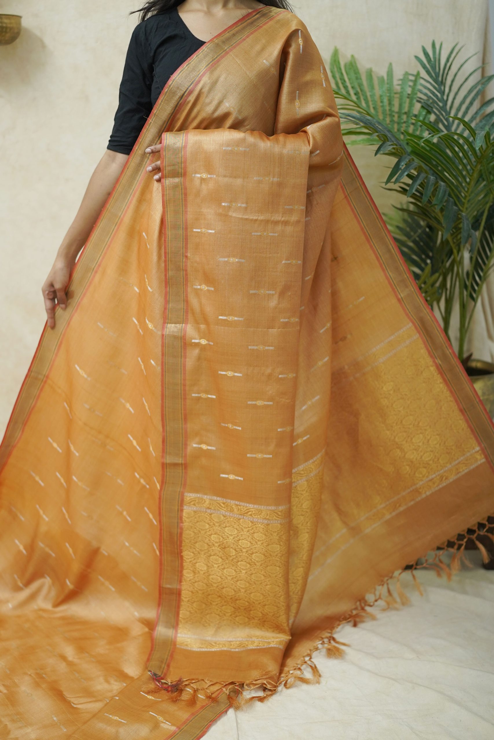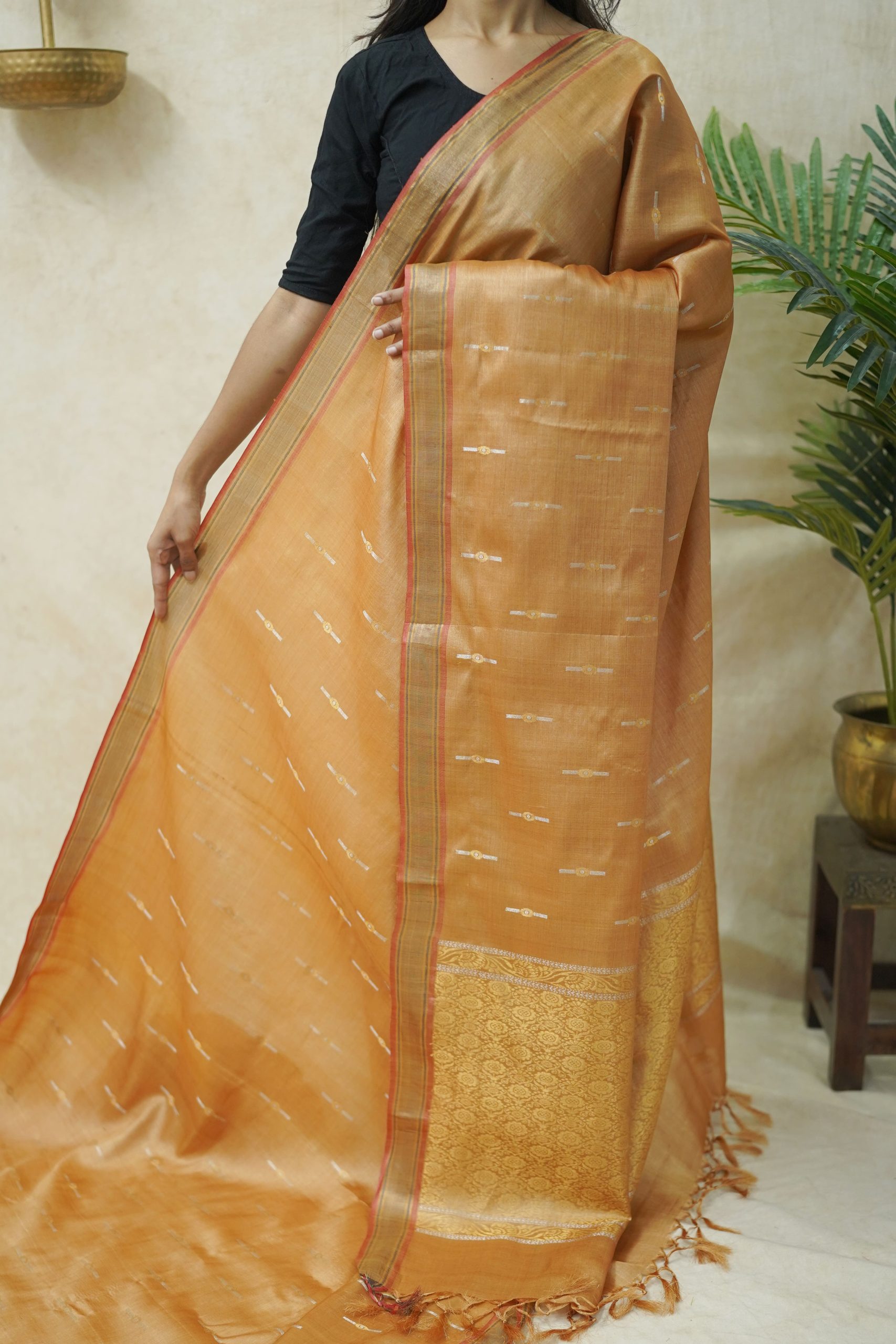Immerse yourself in the regal charm of our golden brown handwoven Kosa silk saree from Chhattisgarh, adorned with a shimmering golden zari work across the body. Renowned for its natural sheen and refined elegance, this saree is a true reflection of Chhattisgarh’s rich weaving heritage. Perfect for special occasions, it embodies timeless sophistication and the unmatched artistry of traditional craftsmanship.