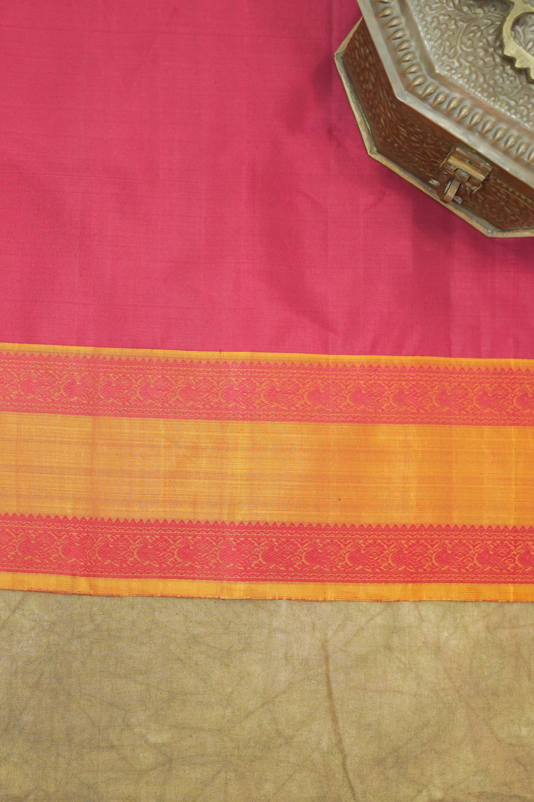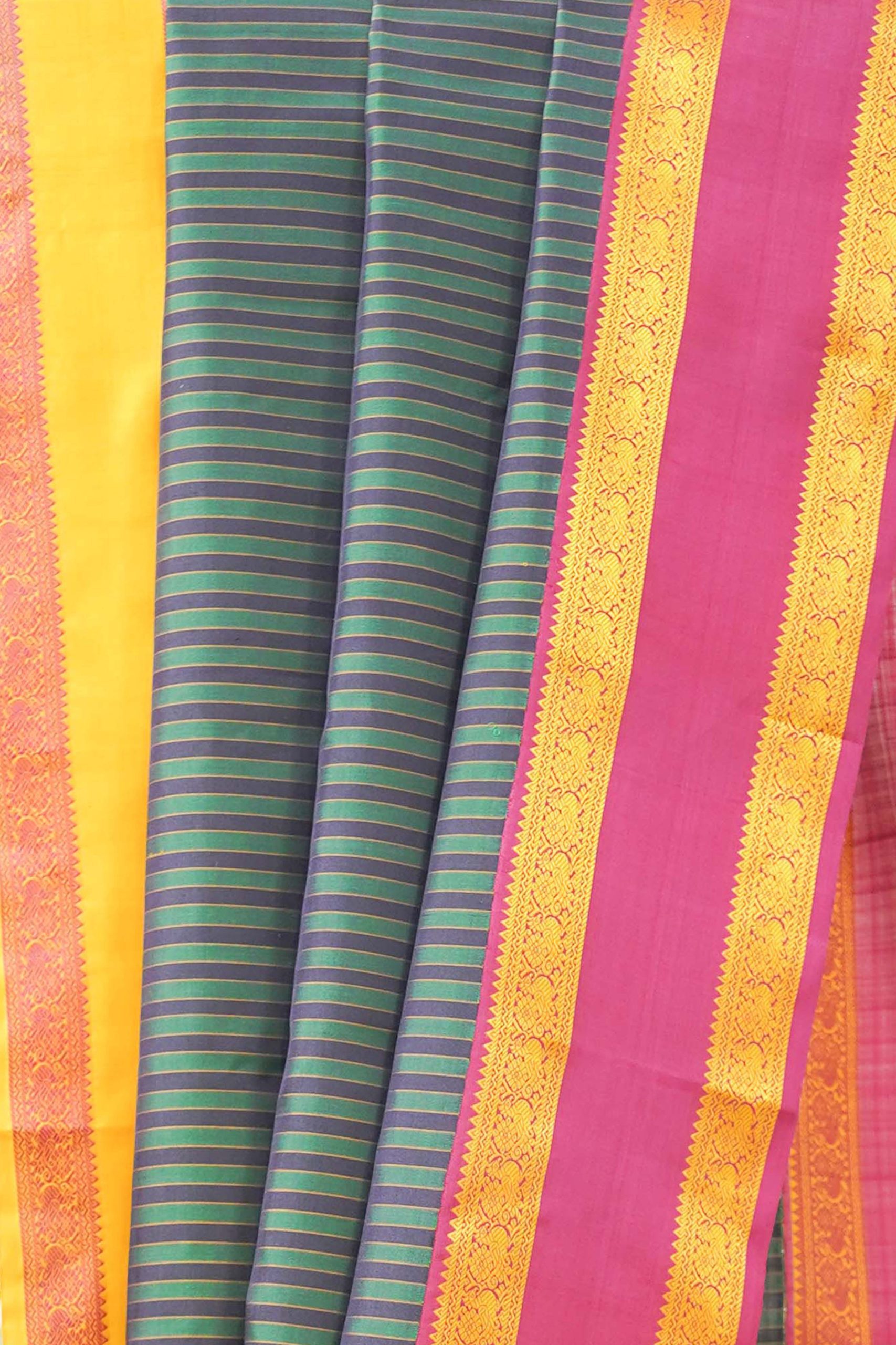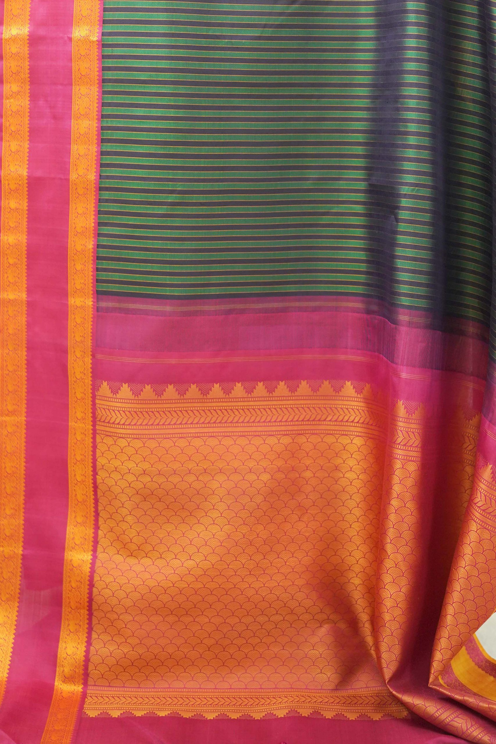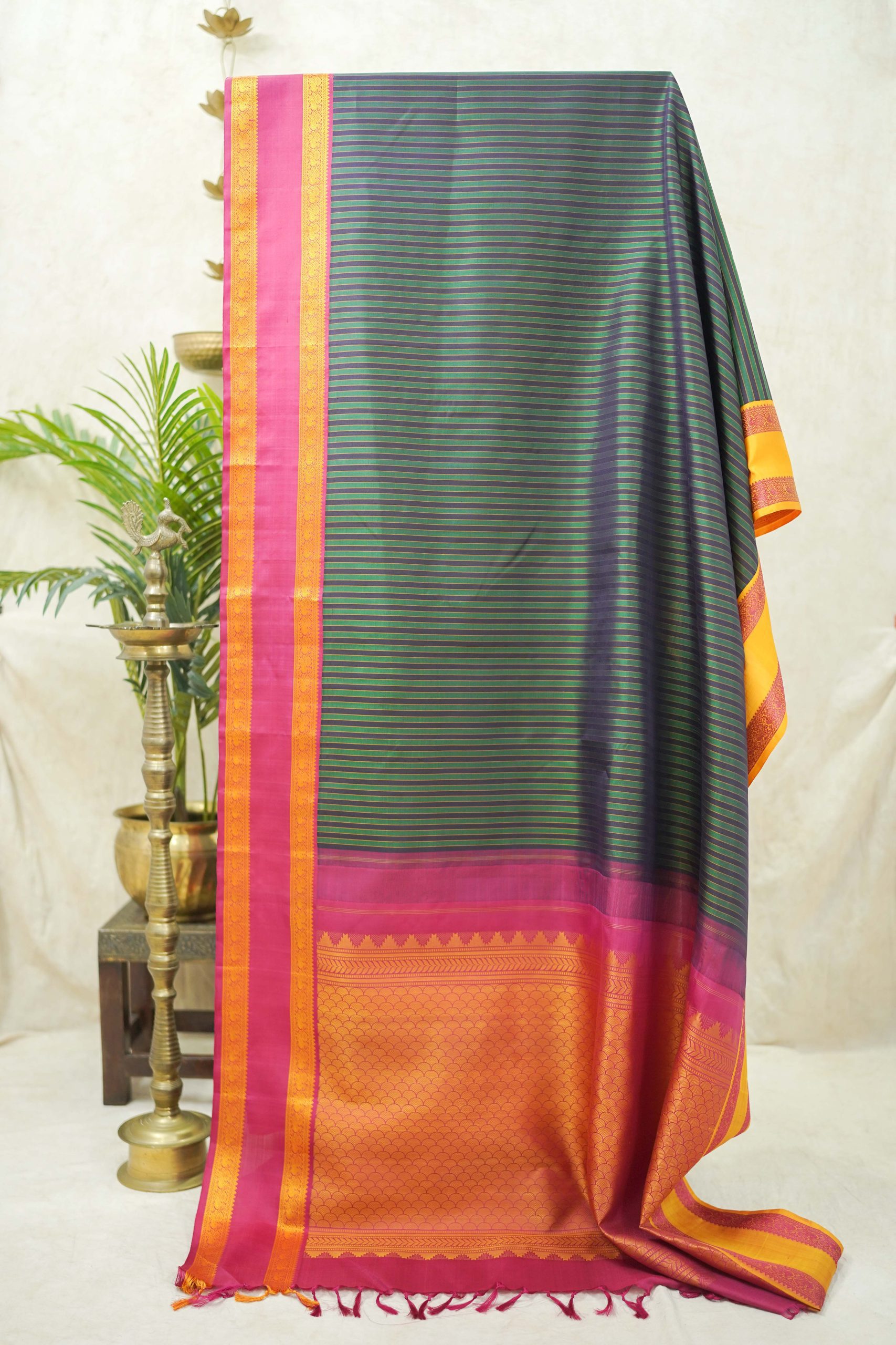 Our exquisite Kanjeevaram silk saree in green and black stripes all across lends an aura of elegance. The pallu adorned with intricate thread work, adds a unique and charming touch. Moreover the ganga-jamuna border in yellow and reddish pink gives a luxurious touch to the very look of the saree.