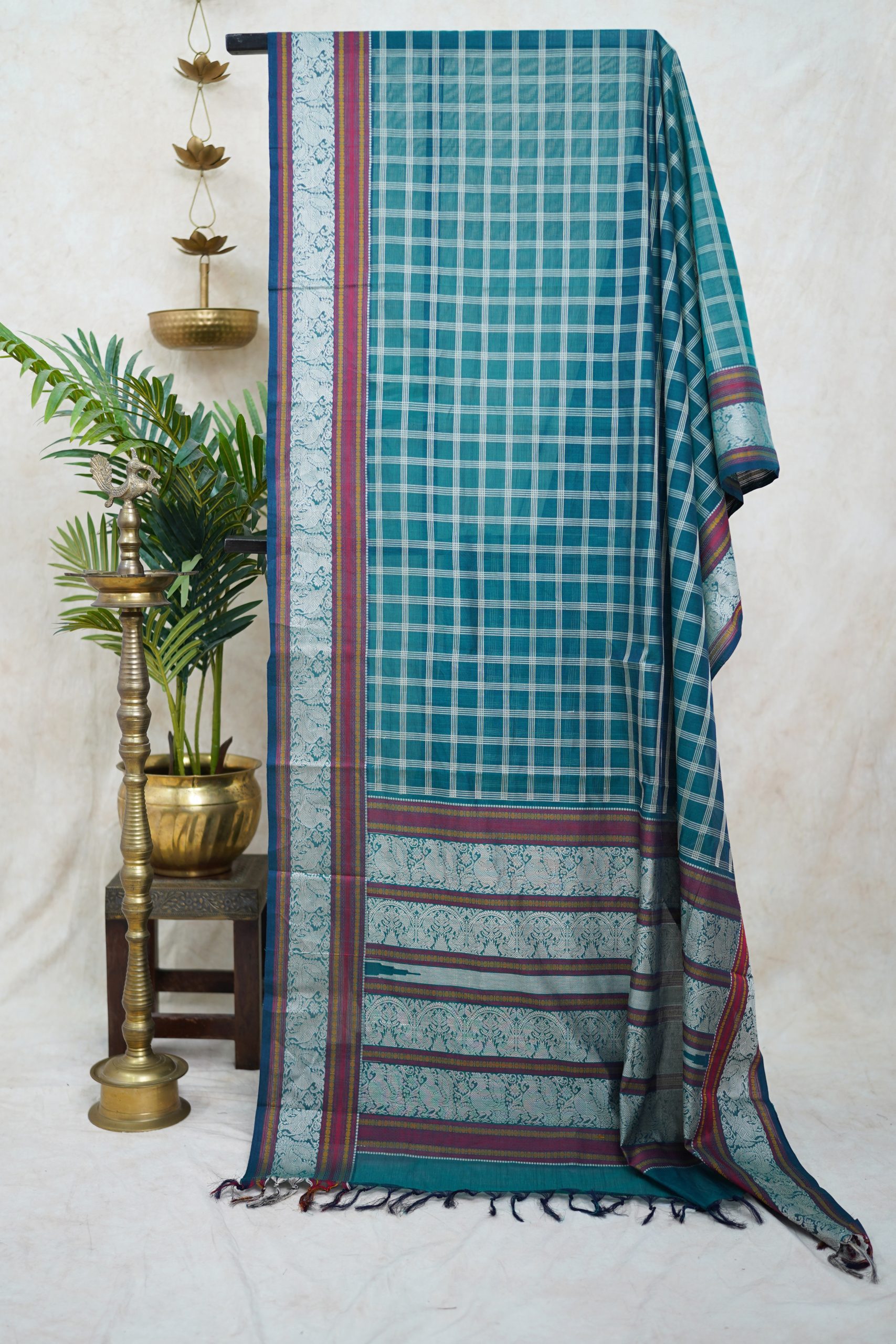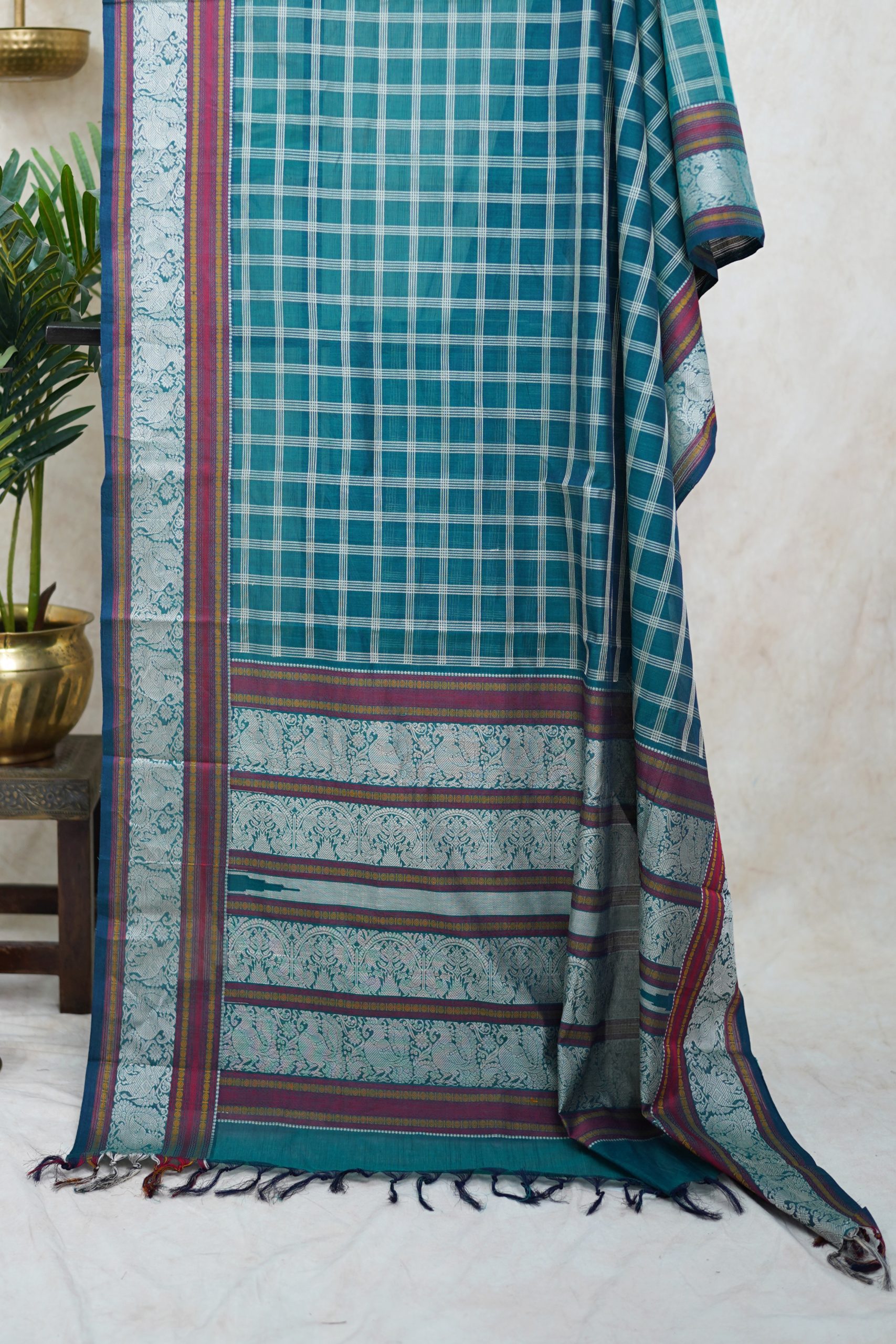 Enhance your ethnic ensemble with our green Kanchipuram cotton saree, featuring intricate checks all across the body with a striking and traditional thread work border. Perfect for any special occasion, this saree combines traditional artistry with modern elegance.