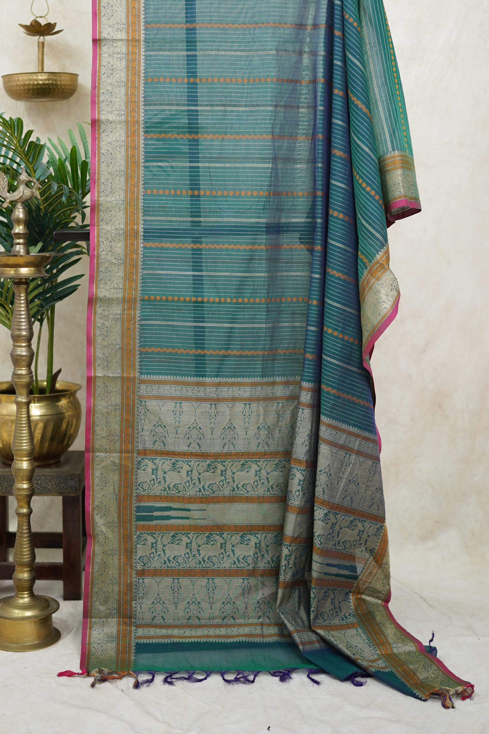 Enhance your ethnic ensemble with our green Kanchipuram cotton saree, featuring stripes all across the body with a striking and traditional thread work border. Perfect for any special occasion, this saree combines traditional artistry with modern elegance.